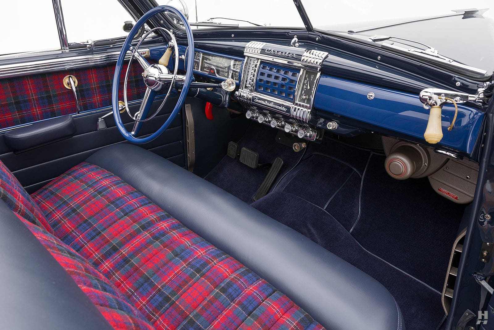 La voiture repose fièrement sur des pneus à plis biais, larges et à flancs blancs, avec des enjoliveurs chromés restaurés, complétés par deux phares montés sur le capot. L’intérieur présente un beau cuir avec des empiècements en tissu Highlander écossais, le même motif s’étendant sur les panneaux de porte pour un look cohérent. Les “chaises bibliothèque” de Chrysler sont extrêmement confortables, à trois de front, à l’avant et à l’arrière.