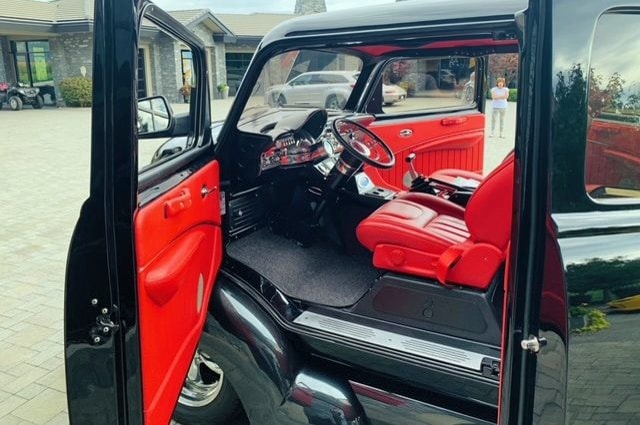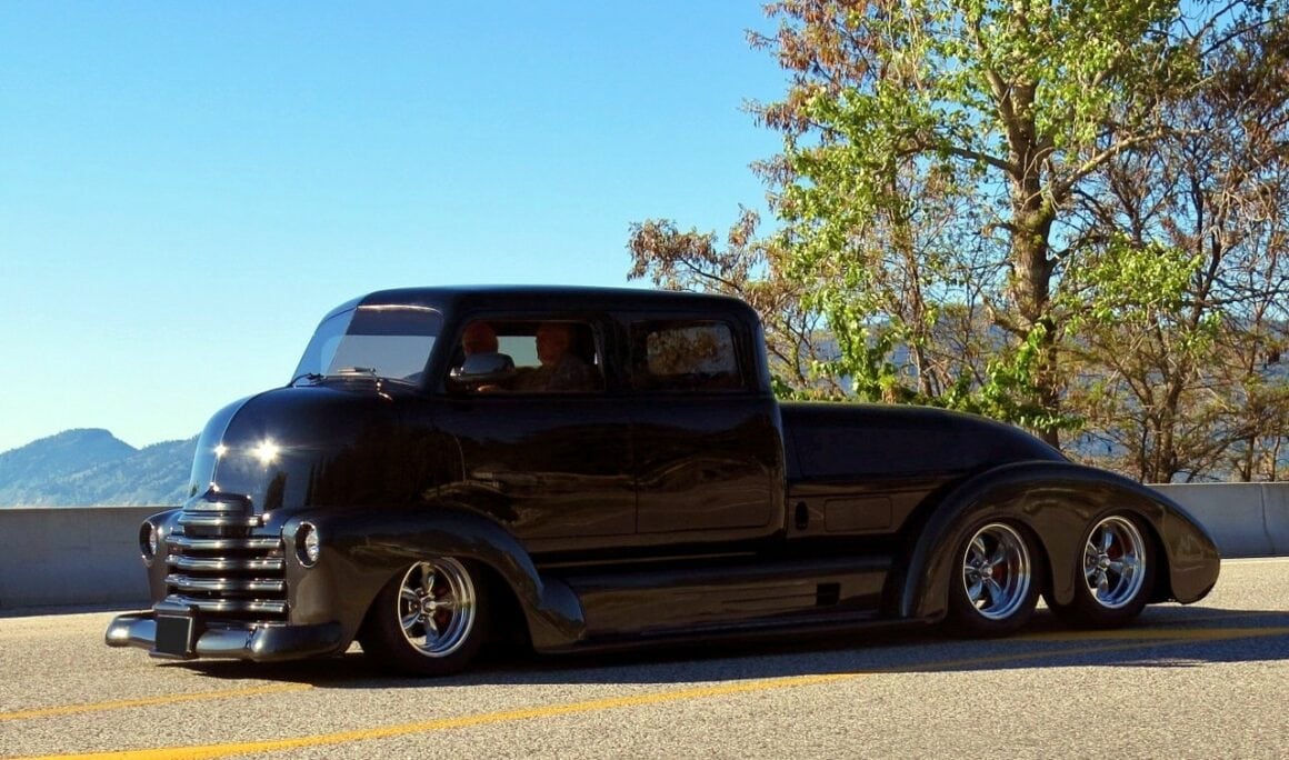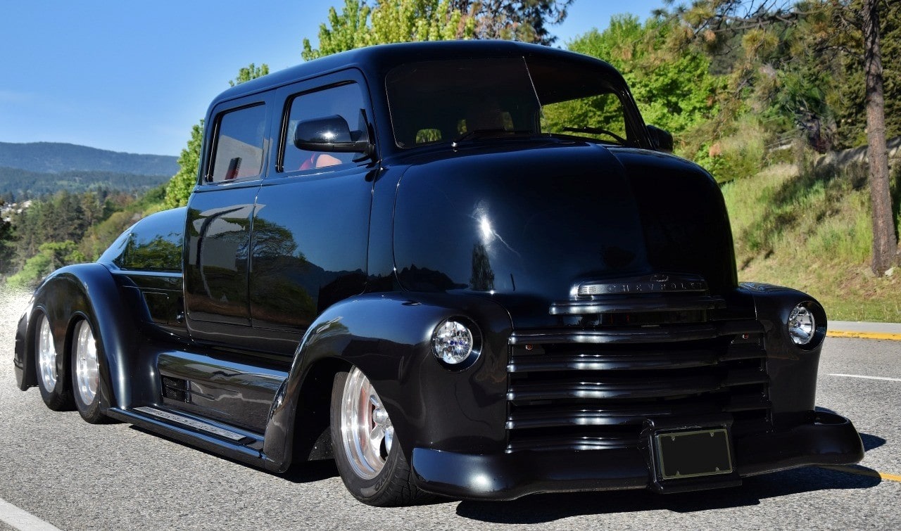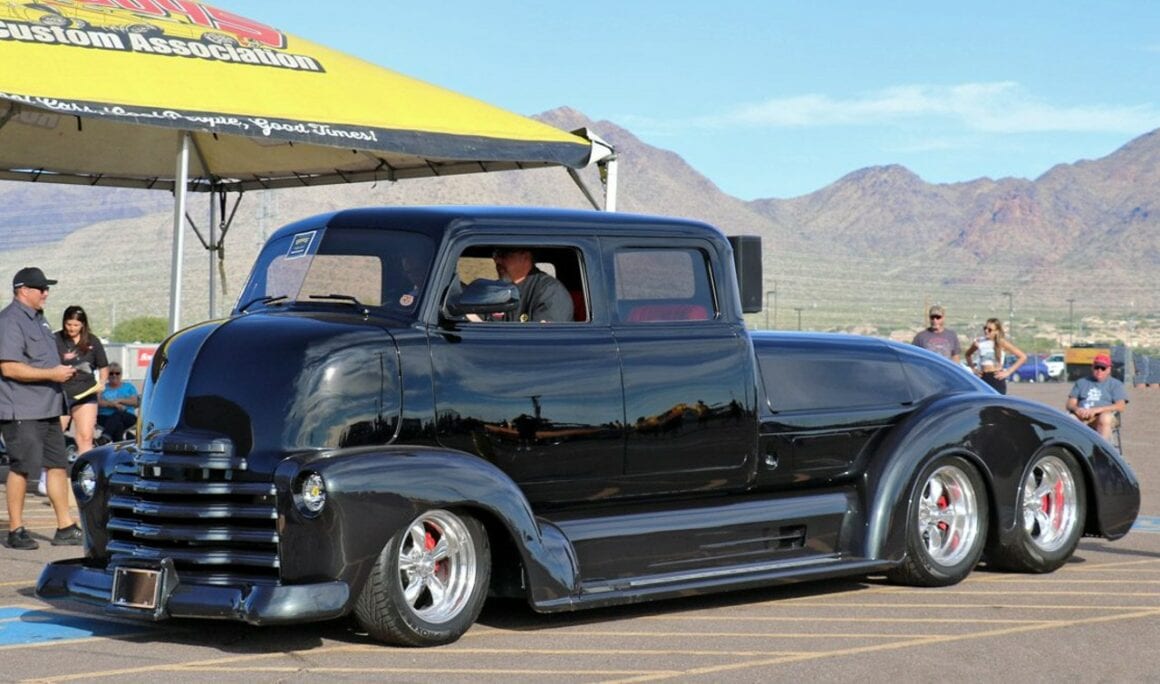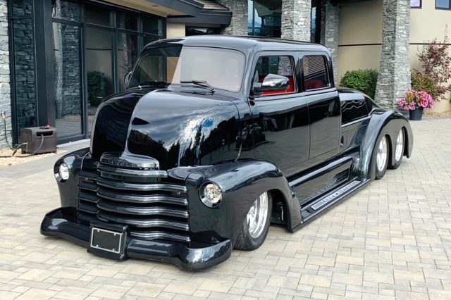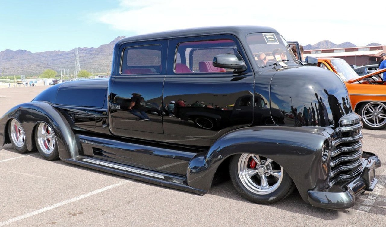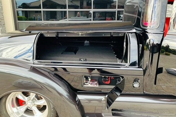 Un radiateur Duramax avec ventilateurs électriques garde le moteur “massif” au frais, qui est soutenu par une traverse avant avec suspension indépendante. La direction est assurée par un boîtier Ford 9 pouces en aluminium. Le camion personnalisé roule sur des suspensions pneumatiques entièrement réglables contrôlées par ordinateur avec amortisseurs Alden. La cabine est dotée d’un intérieur réalisé par l’atelier “Lee Baxter” (en cuir rouge italien) et d’un tableau de bord extrapolé d’une Chrysler Windsor “Astro Dome” avec des jauges/compteurs Dakota en digital. Une climatisation “Vintage-Air” refroidit l’atmosphère souvent enfiévrée et un système audio personnalisé par “Andres Car Audio” permet de faire encore plus de bruit dans l’habitacle !