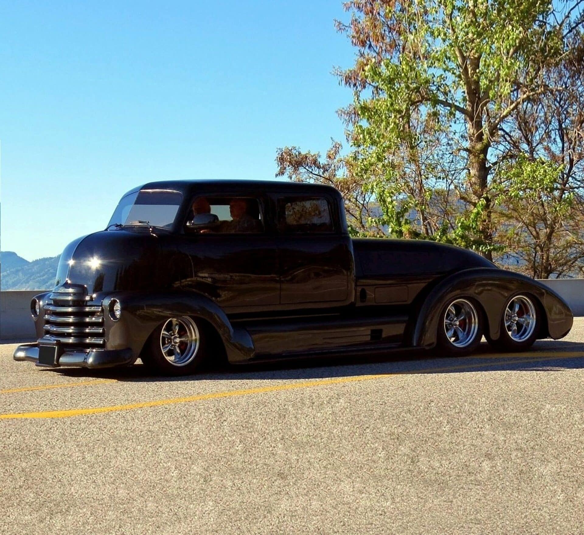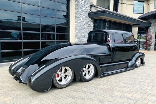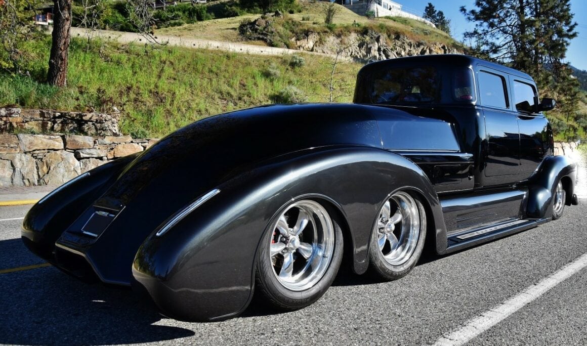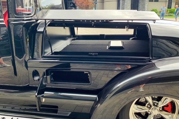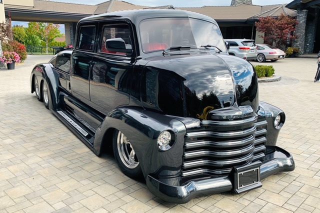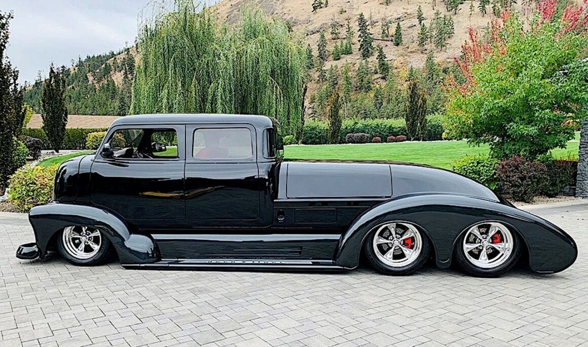 Le look unique de la carrosserie a été créé avec de l’aluminium et des matériaux composites. Plus qu’environ 1.000 heures ont été passées rien que pour confectionner les ailes. Le châssis est la résultante d’actes de bravoure, car il a du être refait 3 fois, la dernière étant la bonne, c’est un châssis calculé pour que les essieux “Dutchman” en tandem réalisés en aluminium de haute technologie, permettent à l’engin de tourner ! Ce châssis “final” a été re-conçu et re-fabriqué par le célèbre constructeur Dale Gerry Street-Rods. La cabine GM originale en acier a été étirée pour devenir “Limousine” 4 portes. Les autres caractéristiques extérieures comprennent un pare-chocs avant Chevy’55 et des jantes “American Racing Torq Thrust” qui ont un look trop classique.