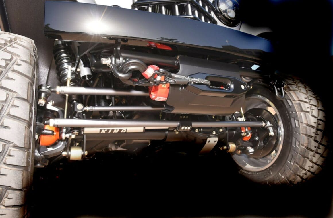 Il était bien entretenu, mais avait encore besoin de beaucoup de travail pour retrouver sa gloire d’antan. Il a finalement apporté l’ancienne Willys, mais au lieu de la restaurer complètement, Mike l’a emmenée à Sultan, Washington, l’emplacement de “Divers Street Rods Garage” (DSR), où elle va se transformer en monstresse tout-terrain d’aujourd’hui. Après avoir été démontée, lcetteJeepster a reçu un châssis sur mesure. À l’avant, l’équipe de DSR a équipé la nouvelle plate-forme d’une suspension à bras en Y dotée de combinés filetés à réservoir à distance King 2.5 et d’un essieu Currie RockJock 60 avec des casiers ARB.