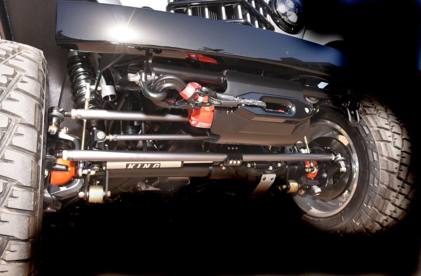 Il y a également des arbres de style RCV CV et des moyeux de verrouillage Warn. Pour l’arrière, ils ont développé un système à quatre bras qui utilisait également des amortisseurs King 2.5, un essieu RockJock 60, mais ces derniers des arbres à 35 cannelures. De plus, le châssis a reçu un système de direction sur mesure basé sur une boîte Chevy Silverado 2500HD 2007 et des étriers Wilwood à six pistons qui épousent des rotors fendus de 14 pouces derrière les quatre roues à six crampons en aluminium Trail Ready. La carrosserie a ensuite été été nettoyée et restaurée.