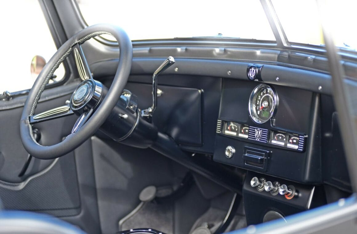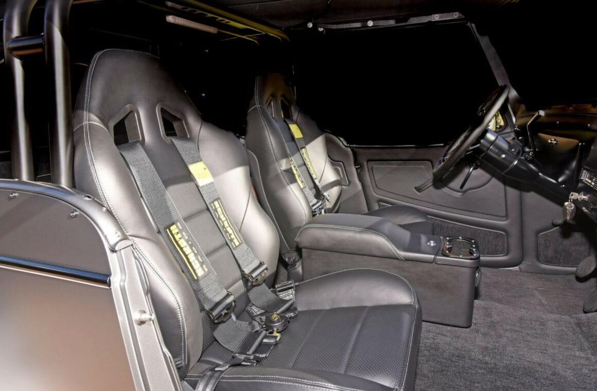 Mais pour s’adapter à tout le nouveau matériel, elle a dû être entièrement modifiée et plusieurs panneaux ont dû être fabriqués à partir de zéro par DSR. Après des centaines d’heures de travail minutieux, tout a été peint dans un PPG Porsche Seal Grey sur lequel une couche transparente satinée Blasurit a été appliquée. L’apparence générale de ce monstre a été améliorée avec des pare-chocs Ford F-100 d’un modèle de 1955, un treuil Warn 9.0 RC de 9 000 livres (4 082 kg), des phares à LED JW et des feux arrière Pontiac rétro avec des LED modernes.