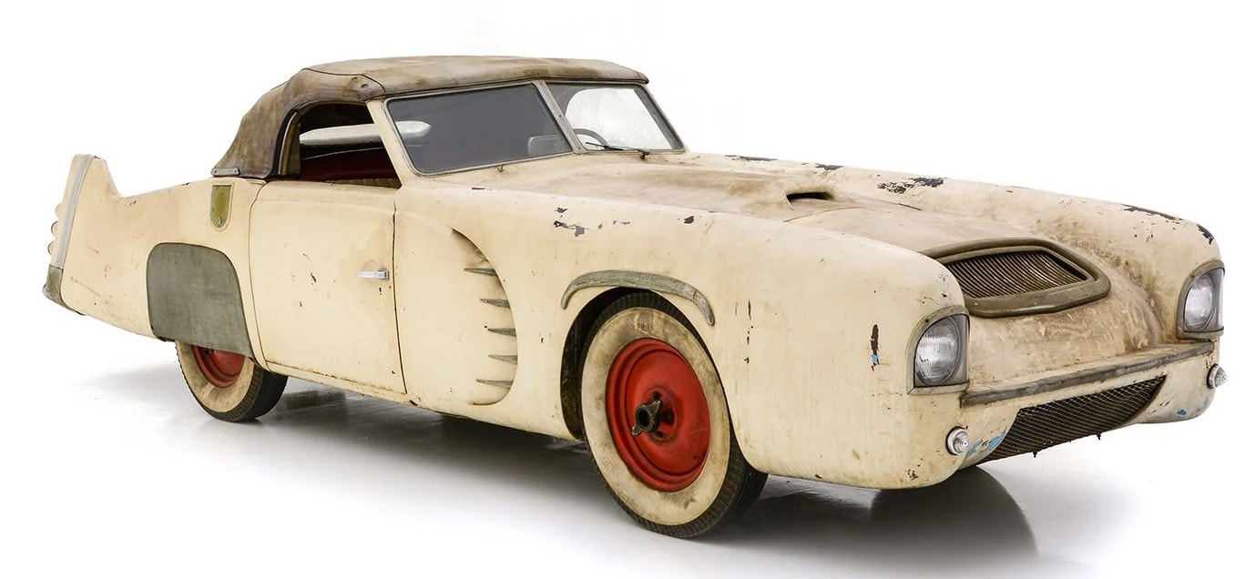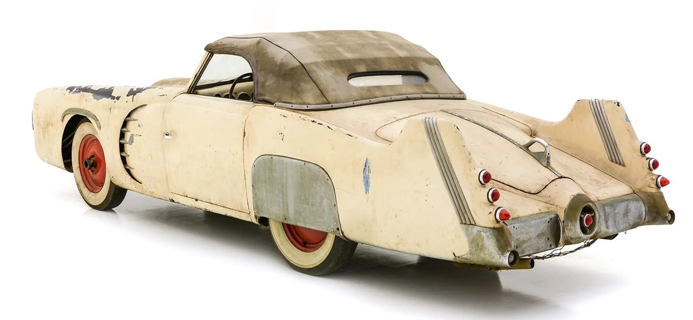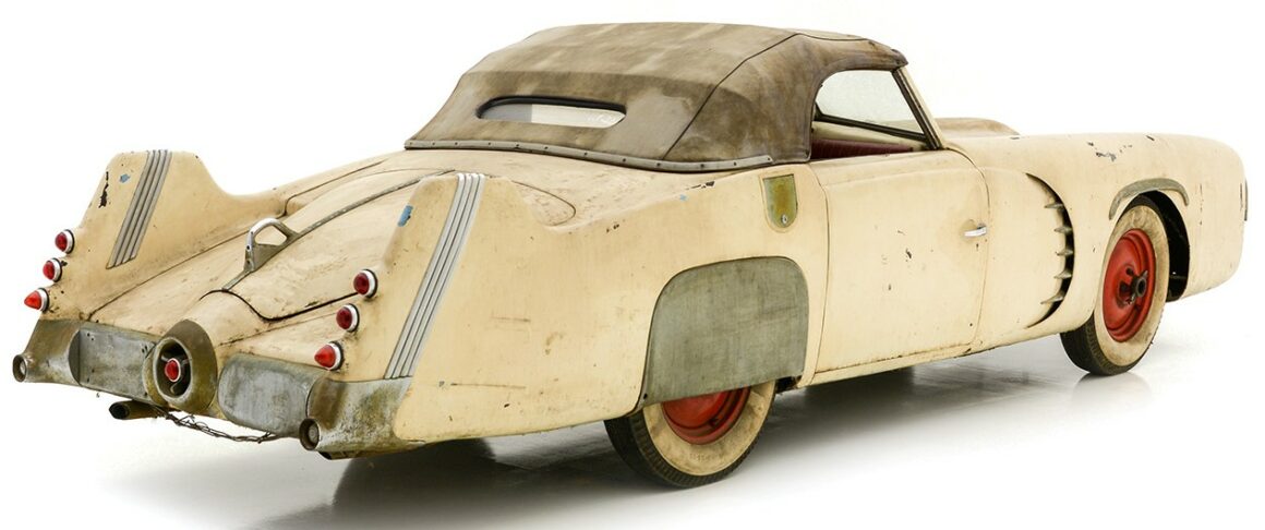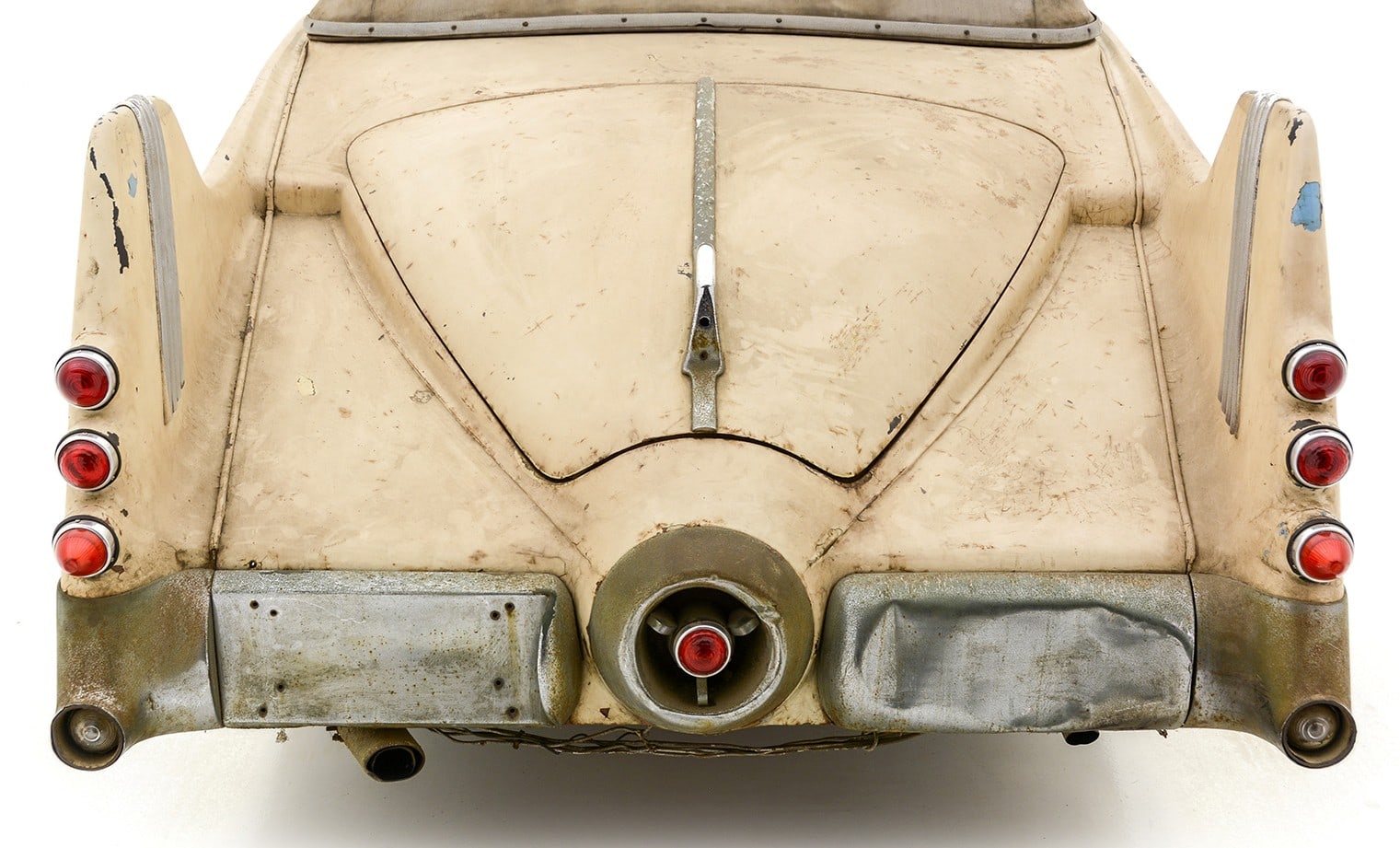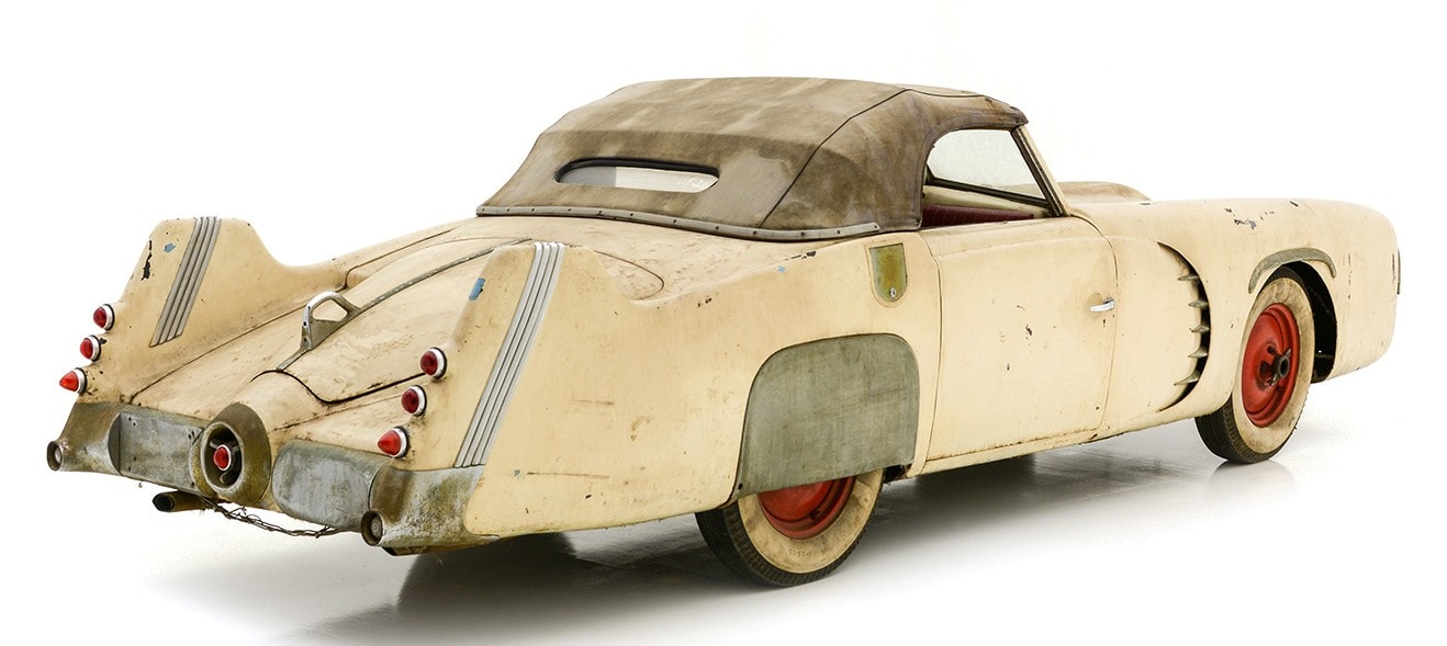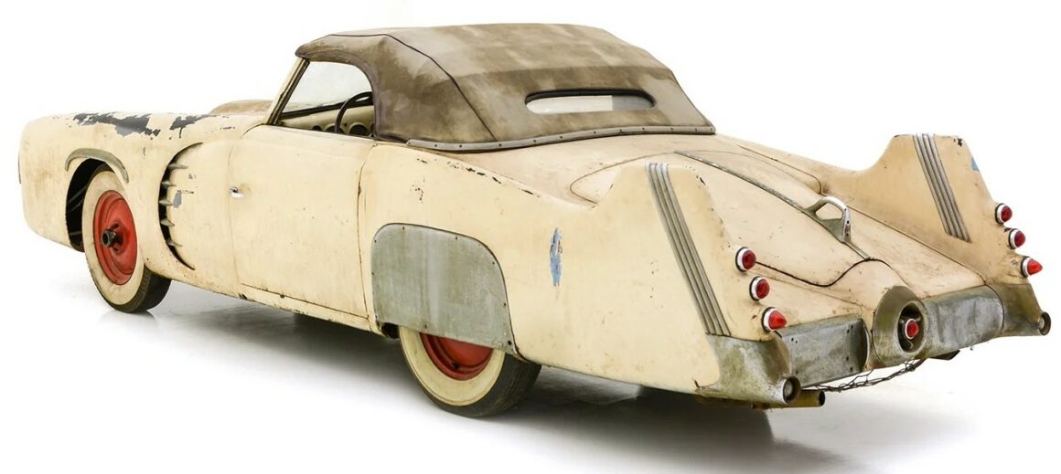 Les gens de Spohn ont créé une machine extravagante combinant des éléments du design original avec des ailerons exagérés et des éléments de style de l’ère du jet inspirés de la voiture d’exposition GM Le Sabre. Les articles de presse d’époque suggèrent que le turquoise était la couleur d’origine, et diverses photos montrent la voiture avec des enjoliveurs sombrero de style Cadillac, des pneus à flancs blancs larges, et “des guêtres” de roues arrière chromés.