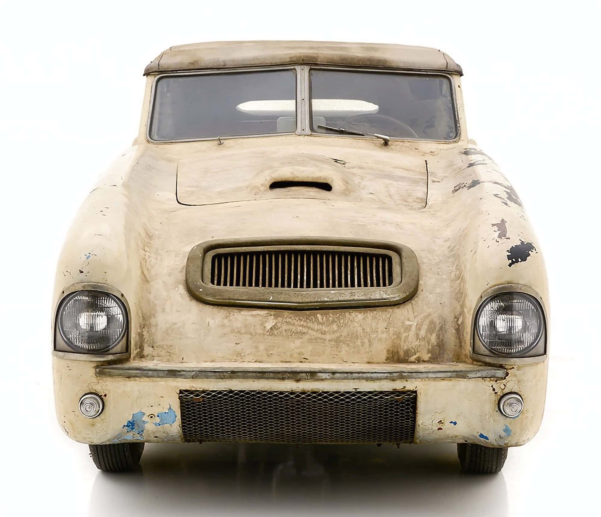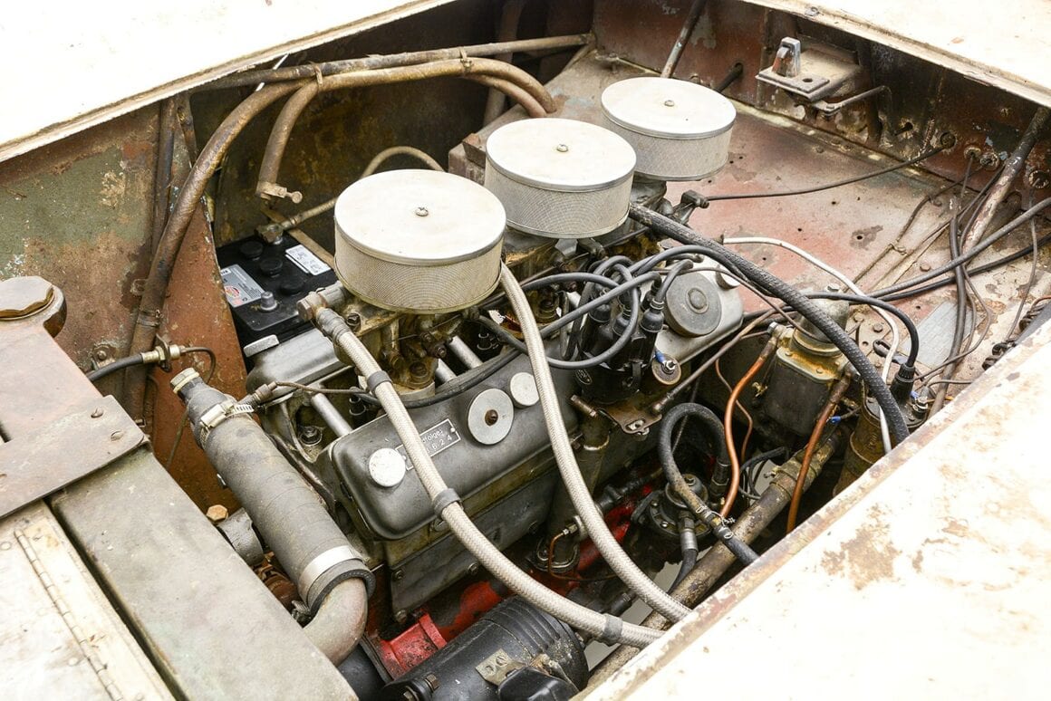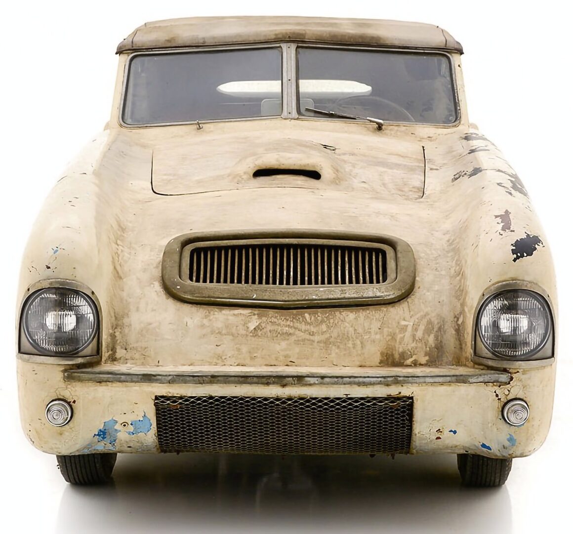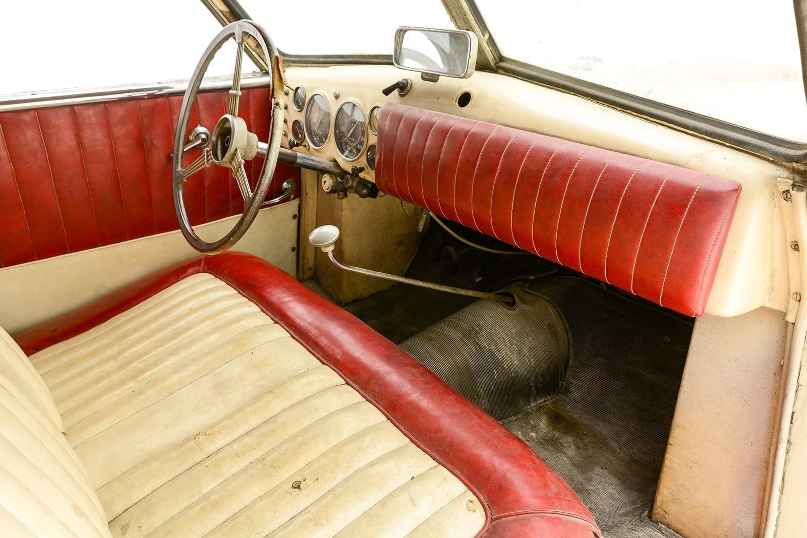 Cette Veritas a été l’une des principales attractions de la vente, car elle était restée dans un état incroyable de “Trouvaille de grange”... Bien qu’elle ait été recouverte d’une couche de poussière après 46 ans de rangement dans la grange de Hartung, la voiture était remarquablement complète et intacte, portant une peinture de couleur crème avec des notes de turquoise d’origine apparaissant par endroits. Elle était atrocement laide à en devenir belle…