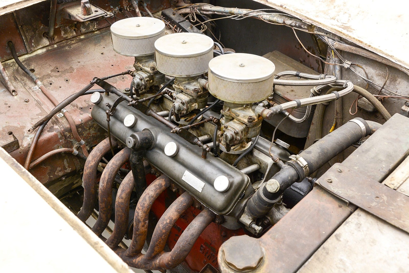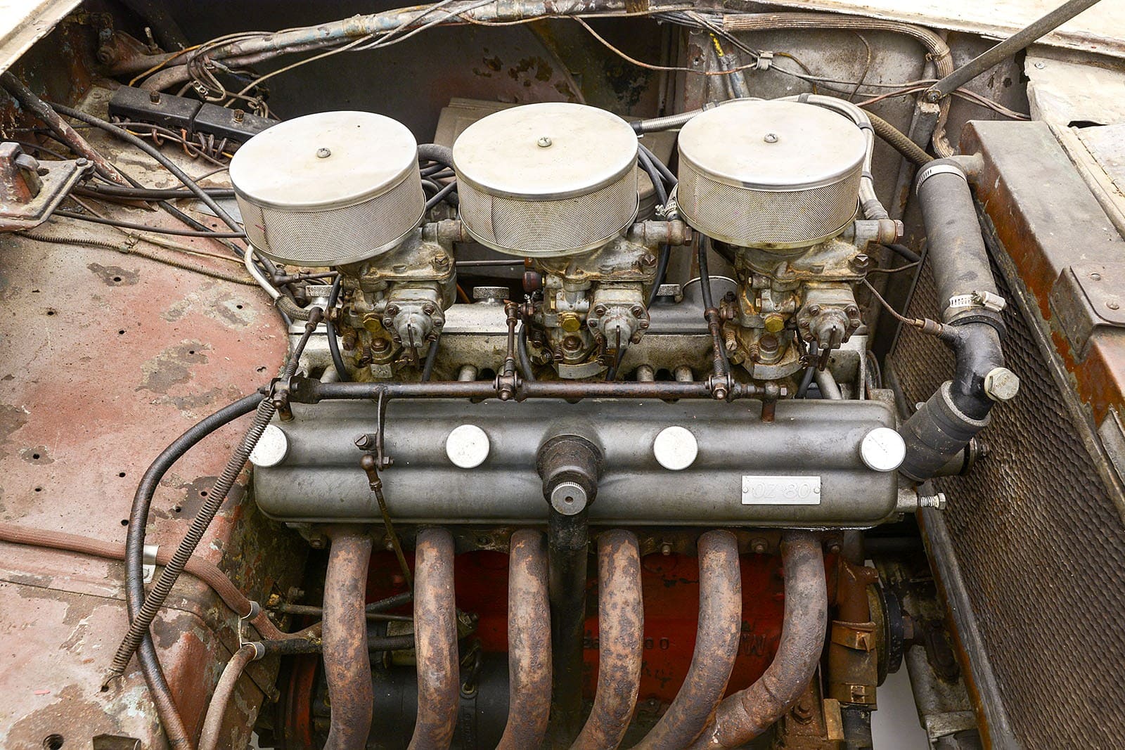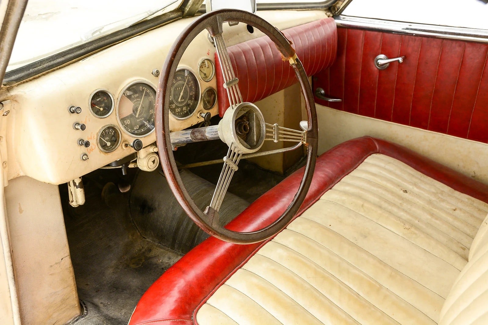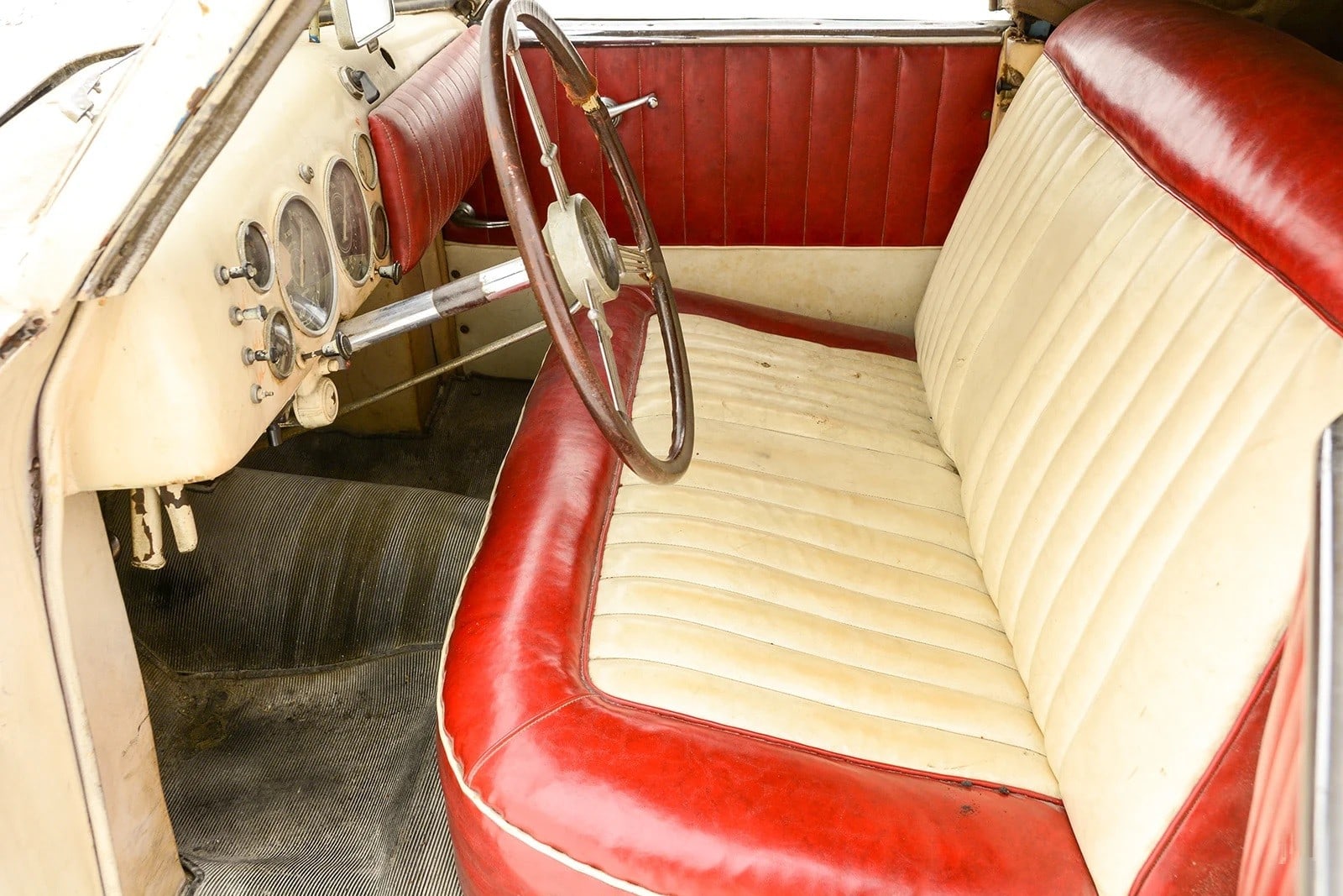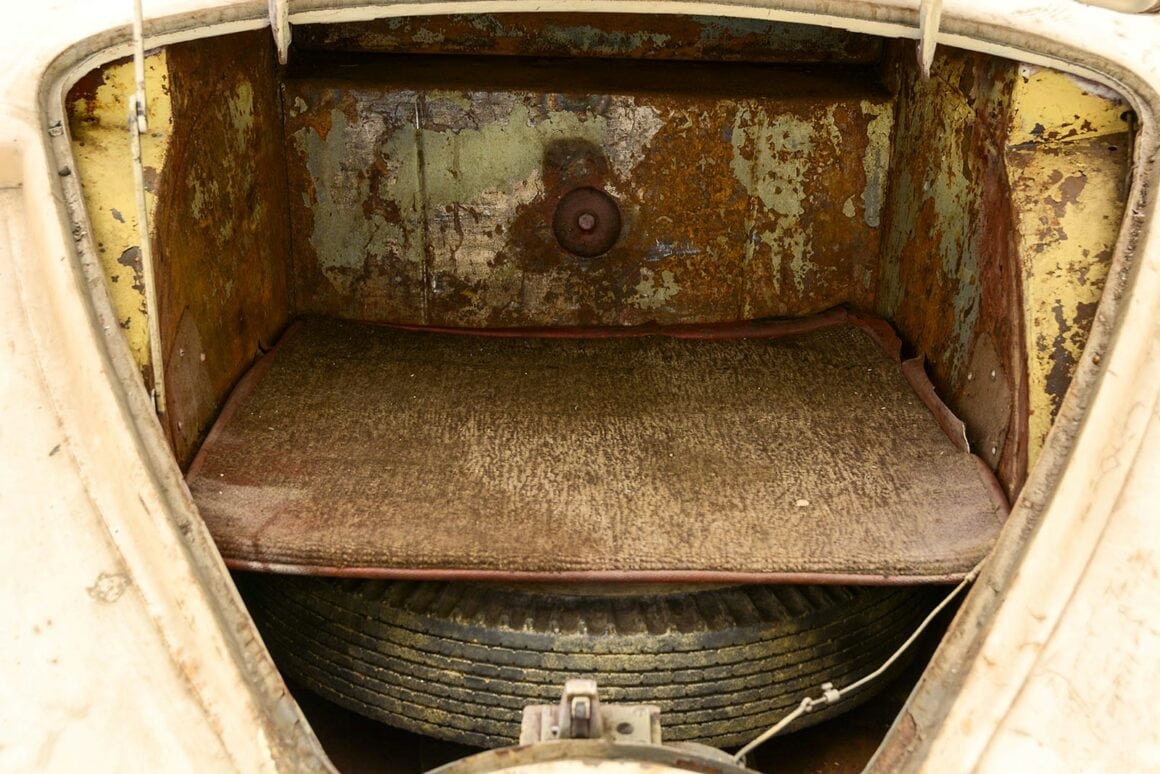 Cette Veritas a été l’une des principales attractions de la vente, car elle était restée dans un état incroyable de “Trouvaille de grange”... Bien qu’elle ait été recouverte d’une couche de poussière après 46 ans de rangement dans la grange de Hartung, la voiture était remarquablement complète et intacte, portant une peinture de couleur crème avec des notes de turquoise d’origine apparaissant par endroits. Elle était atrocement laide à en devenir belle…