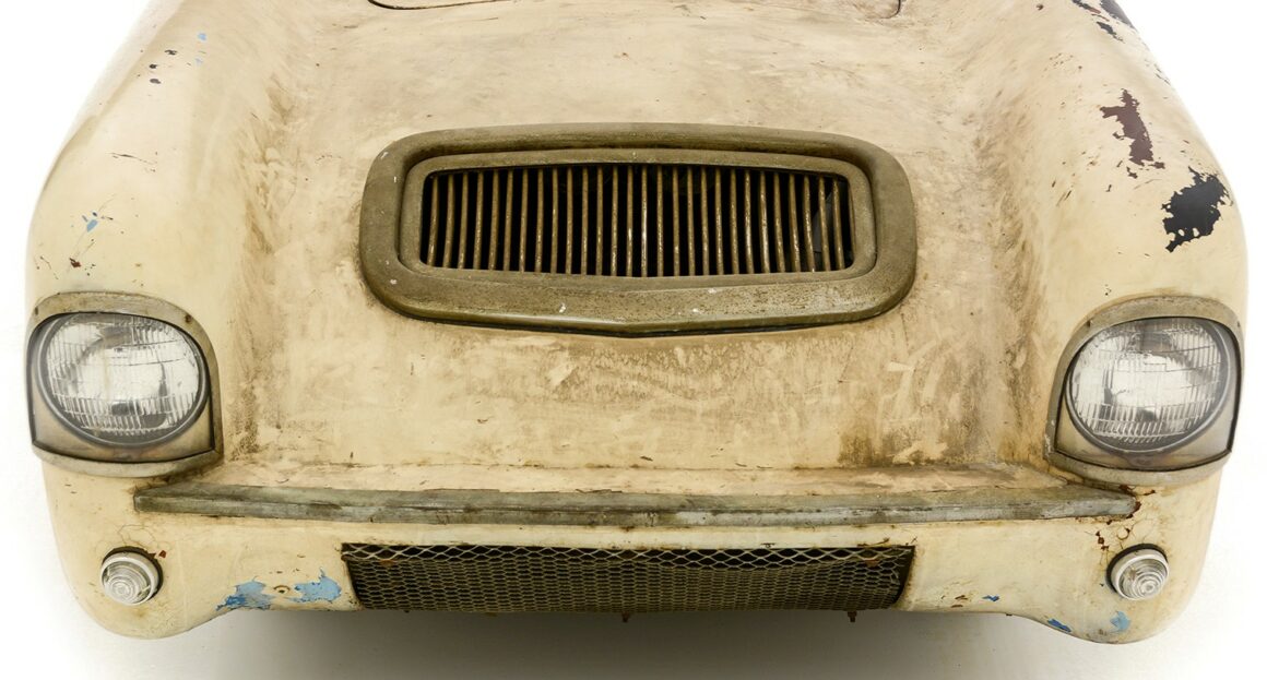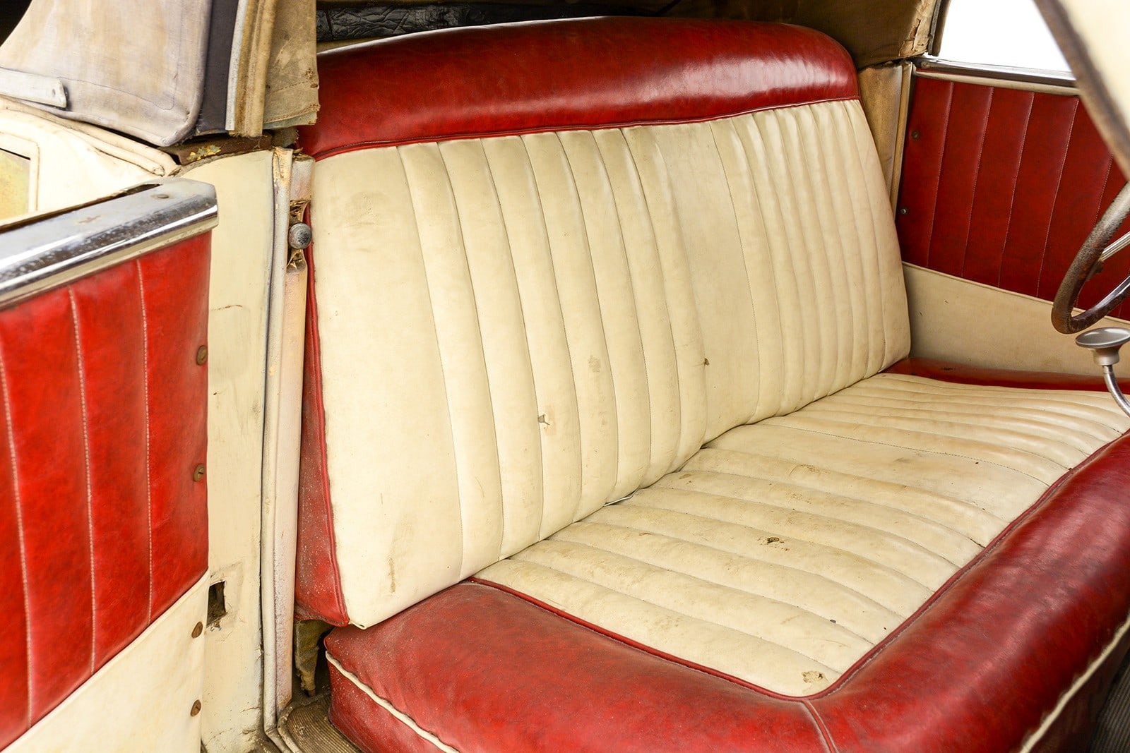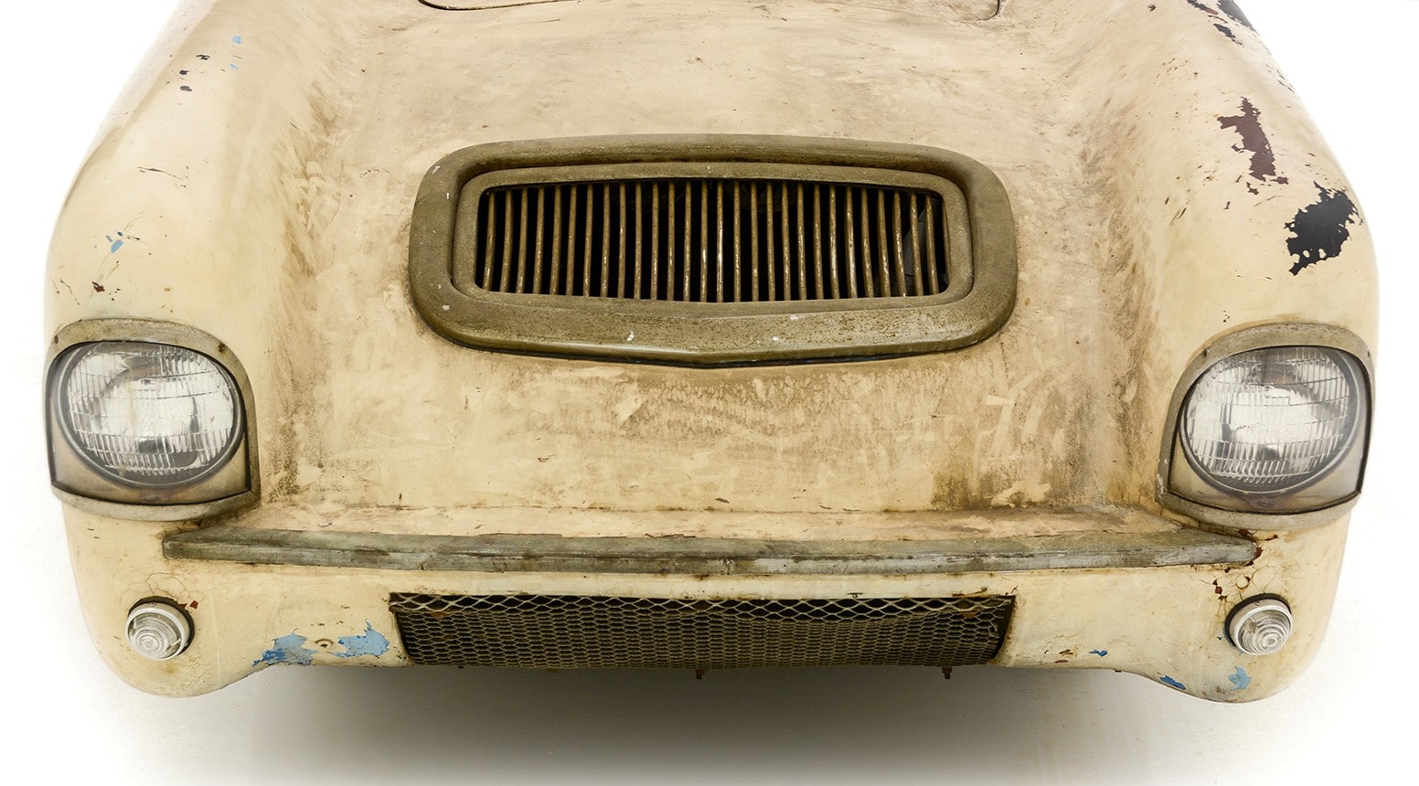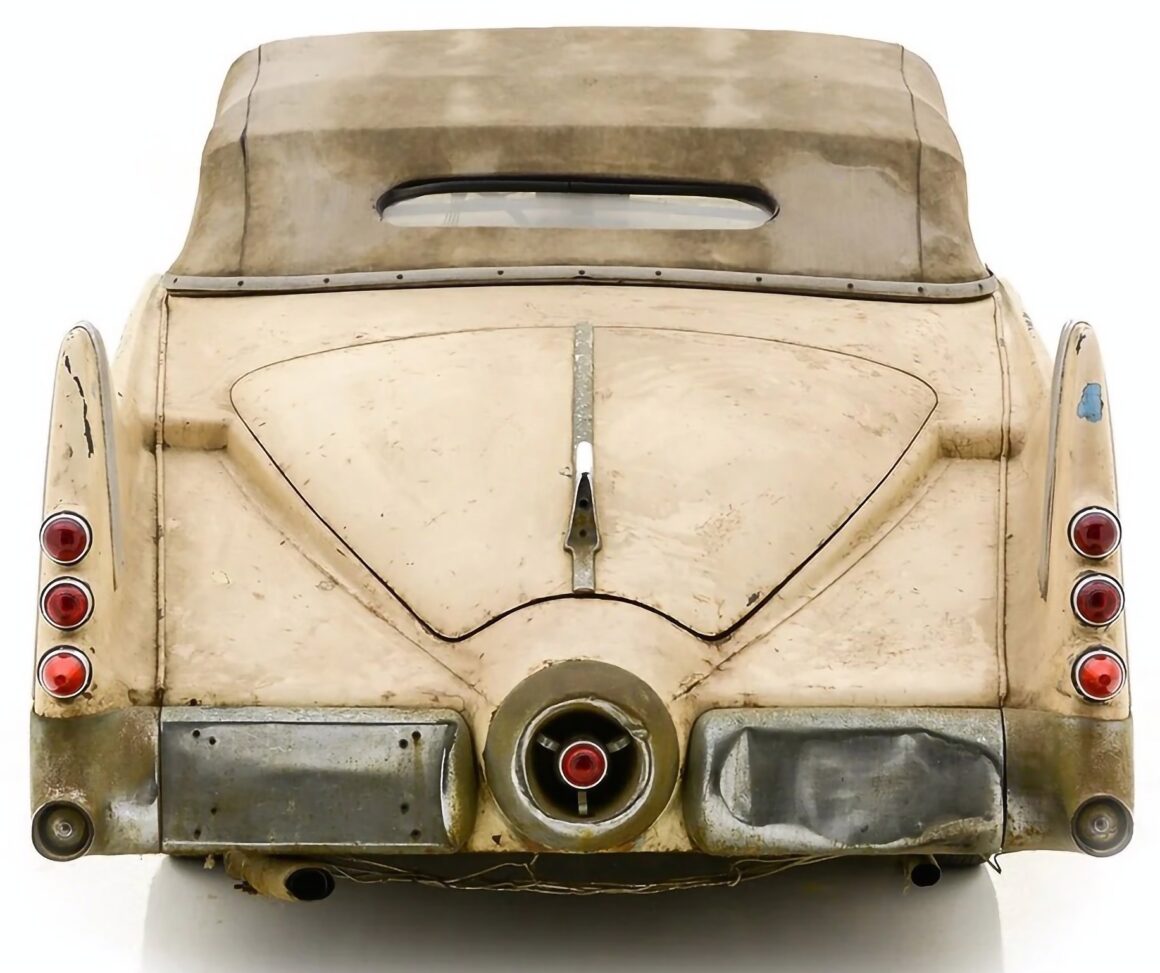 Cette Veritas a été l’une des principales attractions de la vente, car elle était restée dans un état incroyable de “Trouvaille de grange”... Bien qu’elle ait été recouverte d’une couche de poussière après 46 ans de rangement dans la grange de Hartung, la voiture était remarquablement complète et intacte, portant une peinture de couleur crème avec des notes de turquoise d’origine apparaissant par endroits. Elle était atrocement laide à en devenir belle…