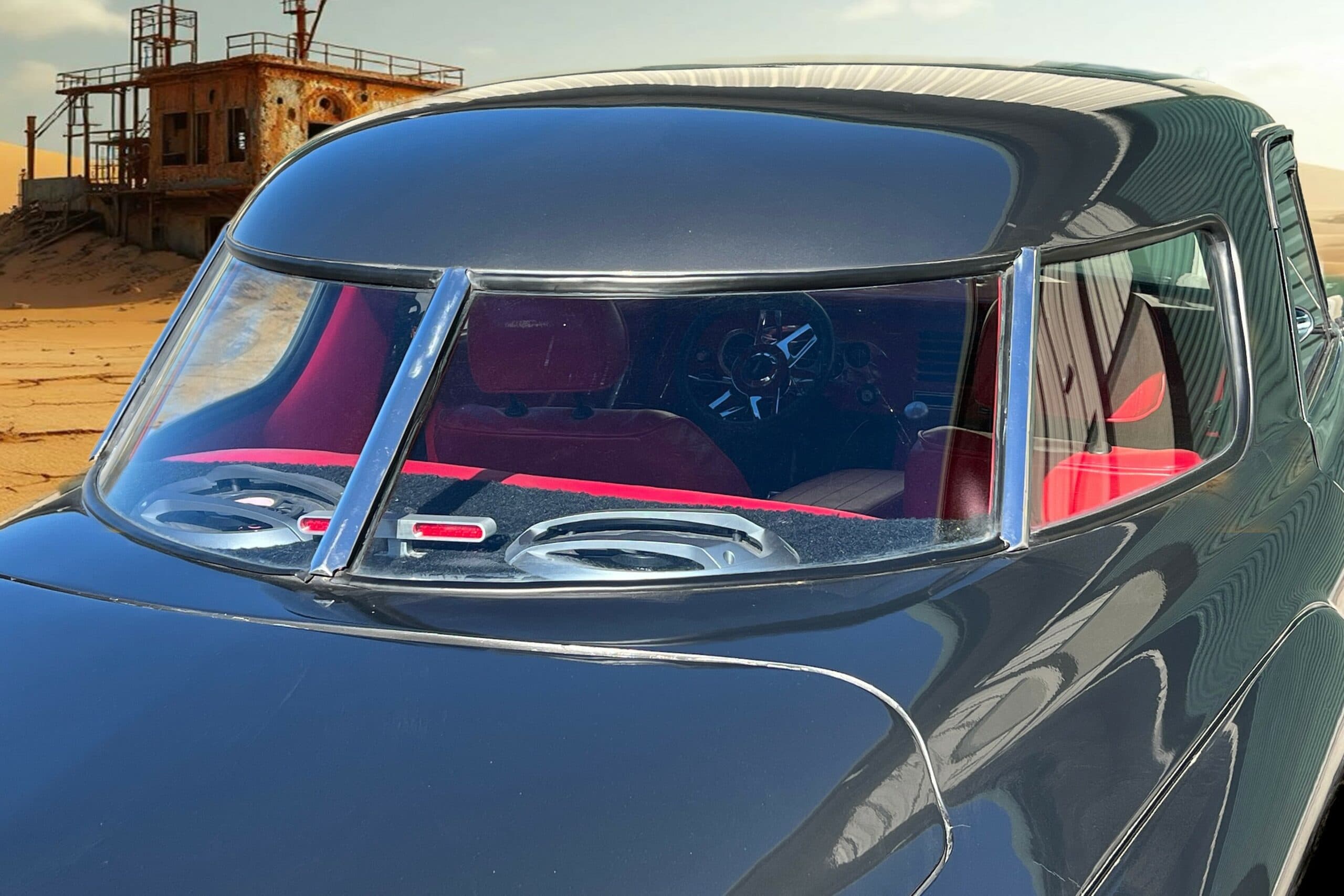 Le coffre est lui aussi aménagé et la Studebaker est même équipée d’une boîte de vitesses moderne avec surmultiplication : “Tout ce qui se trouve en dessous est d’origine Camaro” , m’a déclaré Michael McDonald, le propriétaire de la voiture. “Elle possède son châssis Studebaker d’origine, mais les pièces Camaro y sont soudées”… L’année 1951 marqua la deuxième année de production de la Studebaker Champion à nez pointu (un élément de design également présent sur le Studebaker Land Cruiser), alors que le coupé Regal Starlight se distinguait par sa lunette arrière en quatre parties, une caractéristique rare à l’époque.