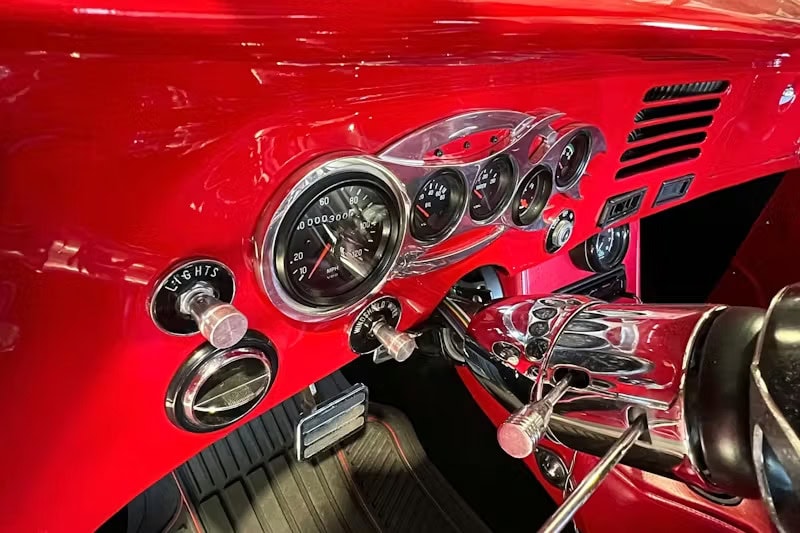 La voiture est équipée d’une colonne de direction inclinable “ididit” et d’un volant “Grant”. Le tableau de bord est composé de cadrans “Auto Gages” de chez “Auto Meter” . Les vitres électriques et les porte-gobelets intégrés à la console centrale apportent une touche de modernité supplémentaire. La plupart des passionnés de Hot Rod’s auraient installé un petit bloc V8 préparé pour propulser la Studebaker Champion, mais le propriétaire a opté pour une approche totalement différente, un V6 Chevy de 275cv, ce qui est suffisant pour des cruisings, mais qui n’est pas “coup de coeur”… Quoique, il est économique !