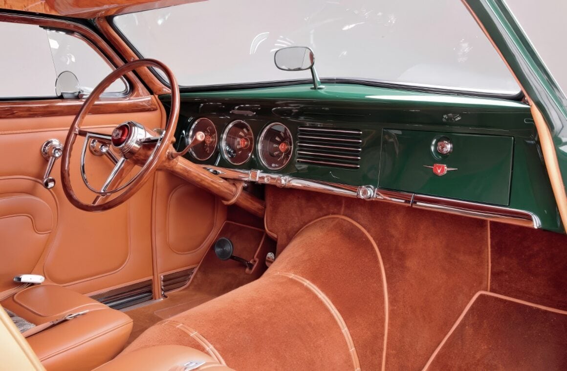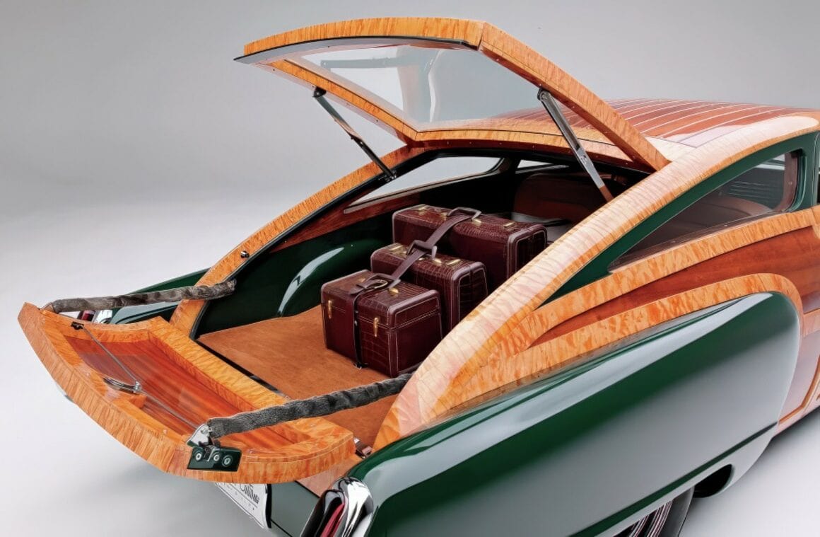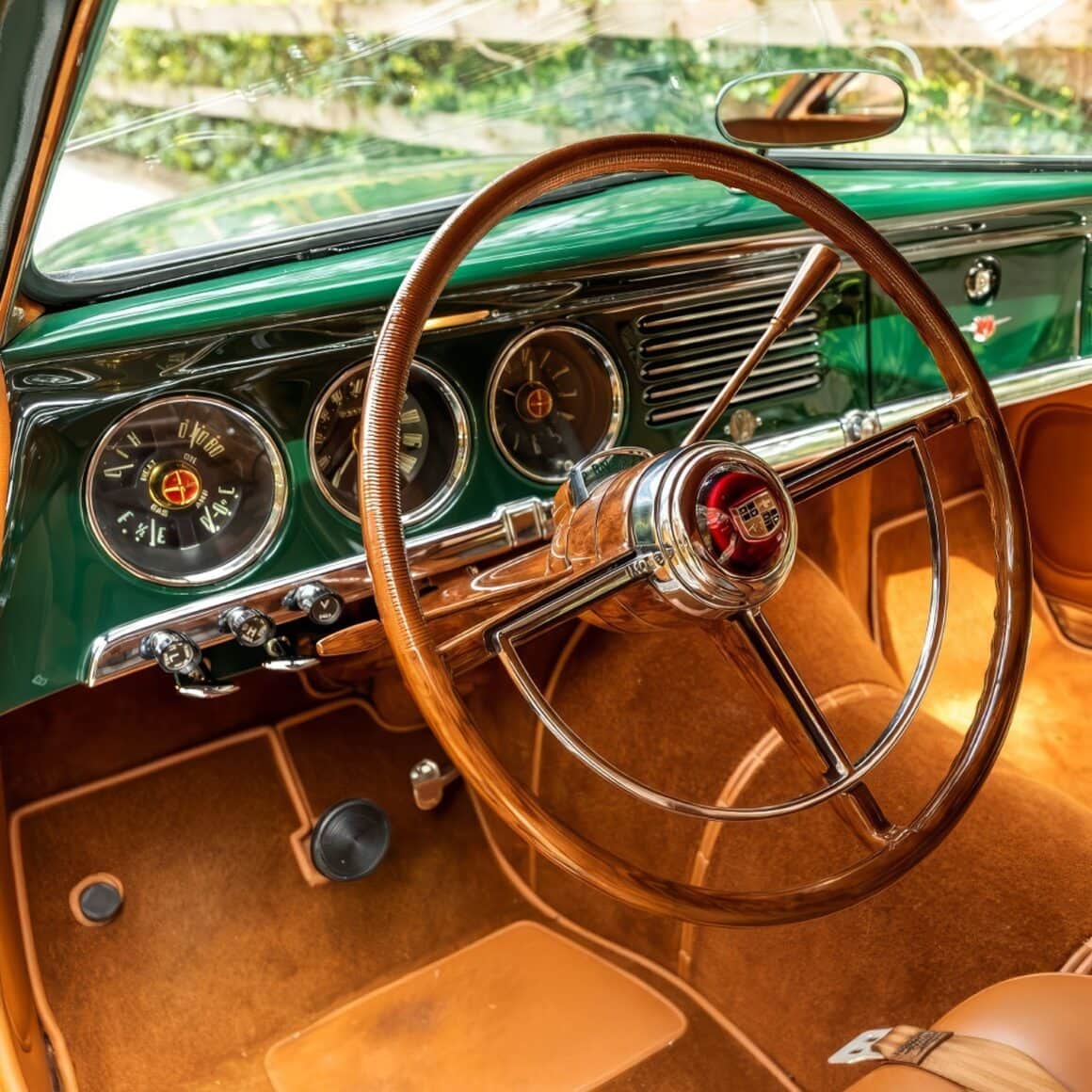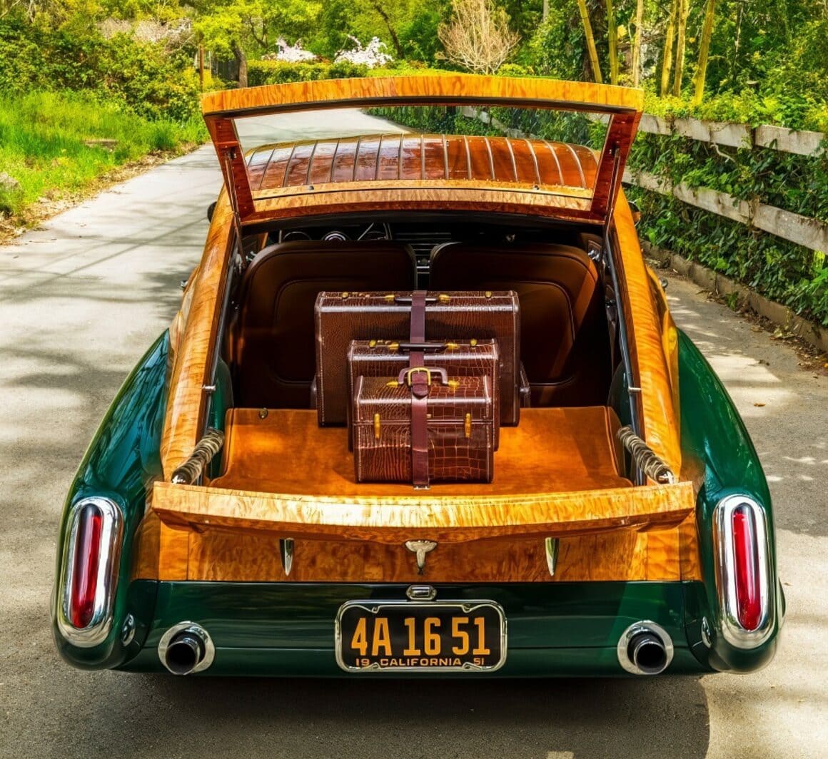 L’intérieur a été confié à Sid Chavers, de Santa Clara, en Californie qui a fabriqué des sièges baquets sur mesure, recouverts de cuir beige avec des empiècements en fourrure grise. Le tableau de bord de la Studebaker de 1951 a été refait par Redline Gauge Works. Il a restauré l’apparence des instruments d’origine et modernisé les composants internes. Un volant de Studebaker de 1954, reproduction fidèle, provenant de Shrock Brothers, spécialiste des pièces détachées pour Studebaker a été installé. Lucky 7 Customs a appliqué une peinture imitation bois sur le volant et la colonne de direction. L’accessoire parfait pour cet intérieur fut déniché par Dennis chez un brocanteur de Washington, un ensemble de bagages vintage en cuir façon alligator a été récupéré, destiné à être rangés sur la plage arrière. Le résultat final est devenu un Custom véritablement unique … Il figurera probablement en tête de la liste des meilleures Studebaker, mais aussi des meilleurs Woodies pour la plupart des gens…