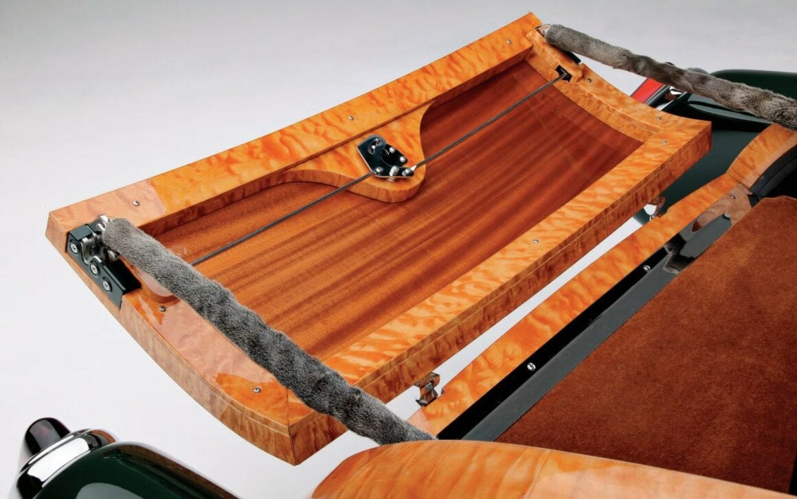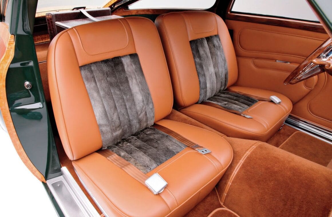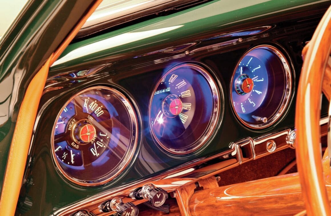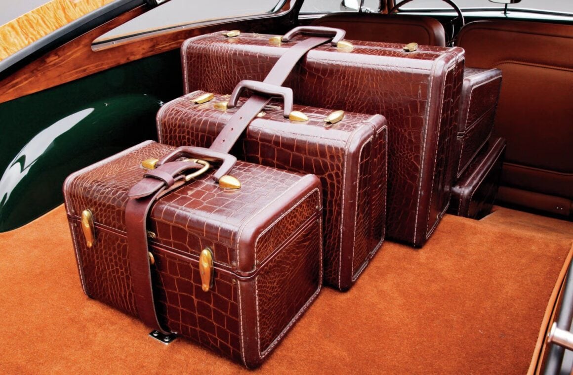 L’intérieur a été confié à Sid Chavers, de Santa Clara, en Californie qui a fabriqué des sièges baquets sur mesure, recouverts de cuir beige avec des empiècements en fourrure grise. Le tableau de bord de la Studebaker de 1951 a été refait par Redline Gauge Works. Il a restauré l’apparence des instruments d’origine et modernisé les composants internes. Un volant de Studebaker de 1954, reproduction fidèle, provenant de Shrock Brothers, spécialiste des pièces détachées pour Studebaker a été installé. Lucky 7 Customs a appliqué une peinture imitation bois sur le volant et la colonne de direction. L’accessoire parfait pour cet intérieur fut déniché par Dennis chez un brocanteur de Washington, un ensemble de bagages vintage en cuir façon alligator a été récupéré, destiné à être rangés sur la plage arrière. Le résultat final est devenu un Custom véritablement unique … Il figurera probablement en tête de la liste des meilleures Studebaker, mais aussi des meilleurs Woodies pour la plupart des gens…