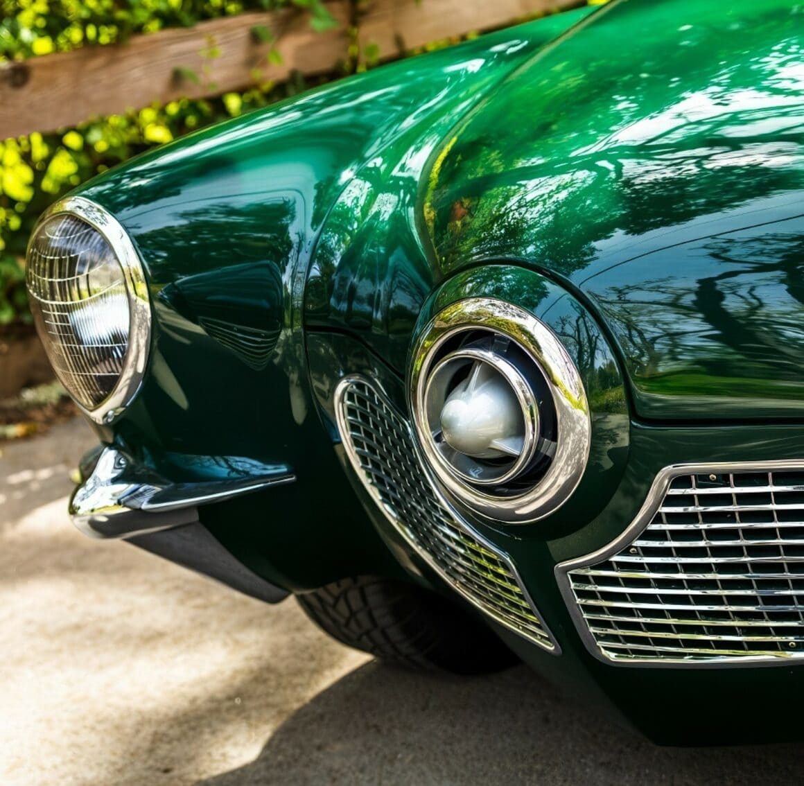 Celle-ci se déroulait simultanément à la vente de la collection de feu Joe MacPherson qui avait lui aussi surestimé ses capacités et s’est suicidé ruiné… Ce projet inachevé avait été initié par Doug Carr de “Woodn’Carr”, le seul jusque là à y avoir gagné des dollars. Déjà transformée d’une berline en Fastback (d’après des croquis de Thom Taylor découpés du magazine Hot Rod sans payer de droits d’usage), elle était dotée d’une carcasse de carrosserie en bois. Le toit avait été abaissé et les ailes arrière élargies avec des feux arrière, des enjoliveurs personnalisés et des phares de Ford 1937… Une voiture aussi atypique méritait un moteur tout aussi exceptionnel. Dennis Varni a un temps envisagé d’y installer un moteur Cadillac pour créer sa propre version de la Studillac. Il s’agit des “Coupés Stude” à moteur Cadillac, construits sur mesure au milieu des années ’50… Puis il s’est souvenu du système d’admission unique qu’il avait déniché lors d’une bourse d’échange il y a des décennies.