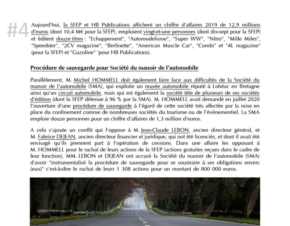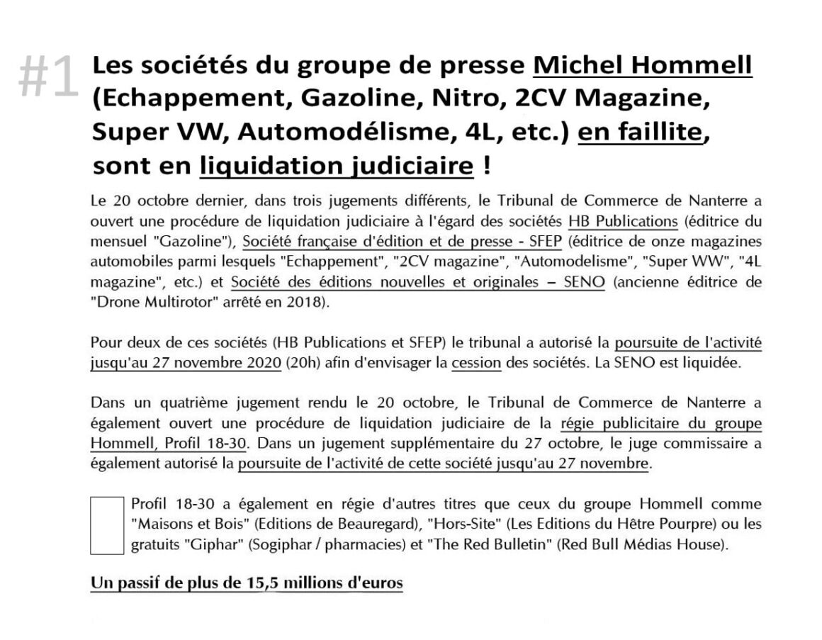 En finale, la totalité de la délation créée me visant, étant mensongère et diffamatoire, le couperet judiciaire s’est retourné contre l’entièreté du Groupe Michel Hommel avec la totalité de ses titres magazines automobiles, une enquête minutieuse a eut lieu en retour et la totalité du Groupe Editions Michel Hommel a été déclaré en faillite, ce qui a abasourdi la presse automobile française. Pressentant que la presse “papier” était, de plus, en déclin, j’avais anticipé la déroute générale qui allait également frapper les diffuseurs tels “Presstalis” en reconvertissant mes titres en numérique, 3 titres en 1 seul avec un “NO-LIMIT” de l’espace et la traduction incorporée de toutes les langues du monde… GatsbyOnline/ChromesFlammes/SecretsInterdits est devenu leader du Web, (200.000 abonnés) quoiqu’en tentant malgré-tout un renouveau plus luxueux avec deux nouveaux mags “papier” 1″ChromesFlammes” et 2“Gatsby”...