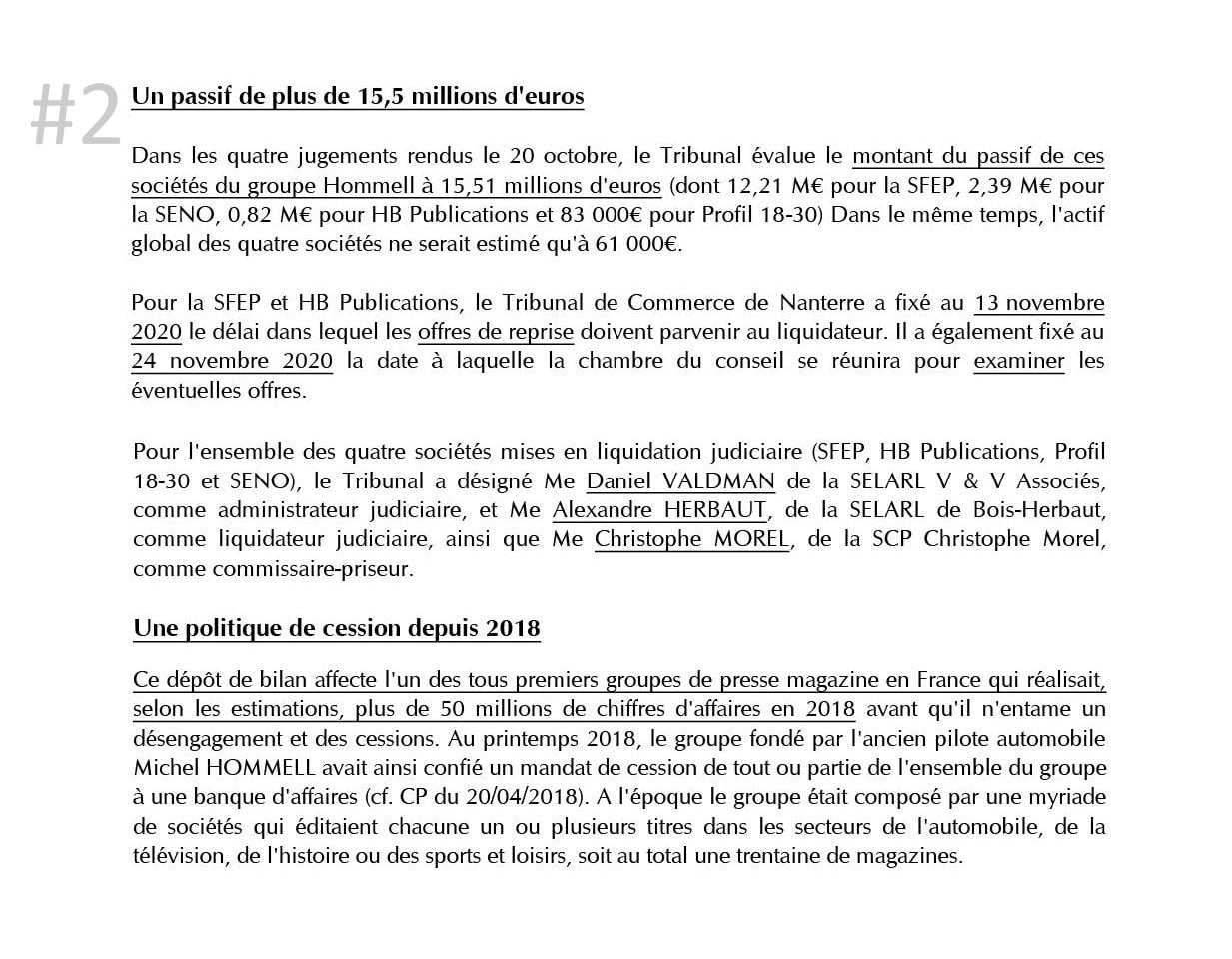 En finale, la totalité de la délation créée me visant, étant mensongère et diffamatoire, le couperet judiciaire s’est retourné contre l’entièreté du Groupe Michel Hommel avec la totalité de ses titres magazines automobiles, une enquête minutieuse a eut lieu en retour et la totalité du Groupe Editions Michel Hommel a été déclaré en faillite, ce qui a abasourdi la presse automobile française. Pressentant que la presse “papier” était, de plus, en déclin, j’avais anticipé la déroute générale qui allait également frapper les diffuseurs tels “Presstalis” en reconvertissant mes titres en numérique, 3 titres en 1 seul avec un “NO-LIMIT” de l’espace et la traduction incorporée de toutes les langues du monde… GatsbyOnline/ChromesFlammes/SecretsInterdits est devenu leader du Web, (200.000 abonnés) quoiqu’en tentant malgré-tout un renouveau plus luxueux avec deux nouveaux mags “papier” 1″ChromesFlammes” et 2“Gatsby”...