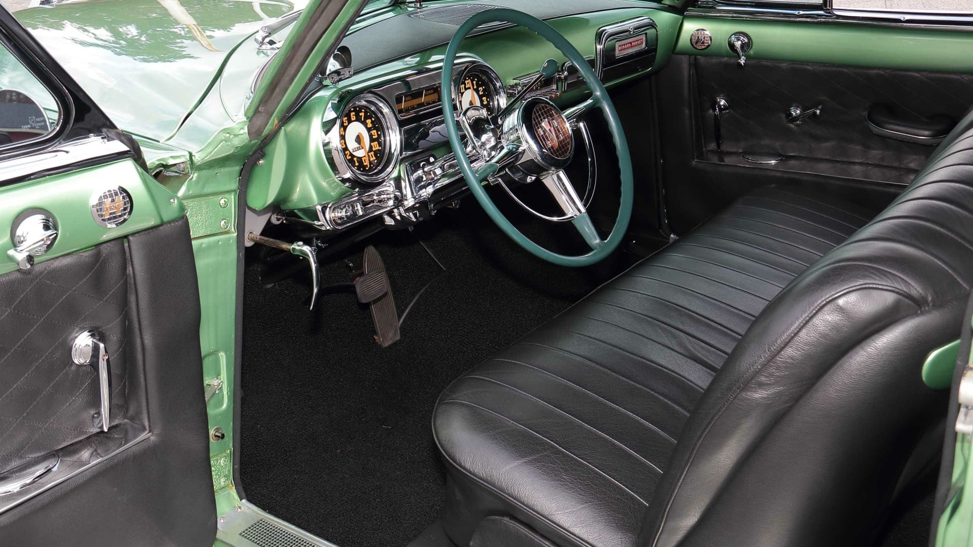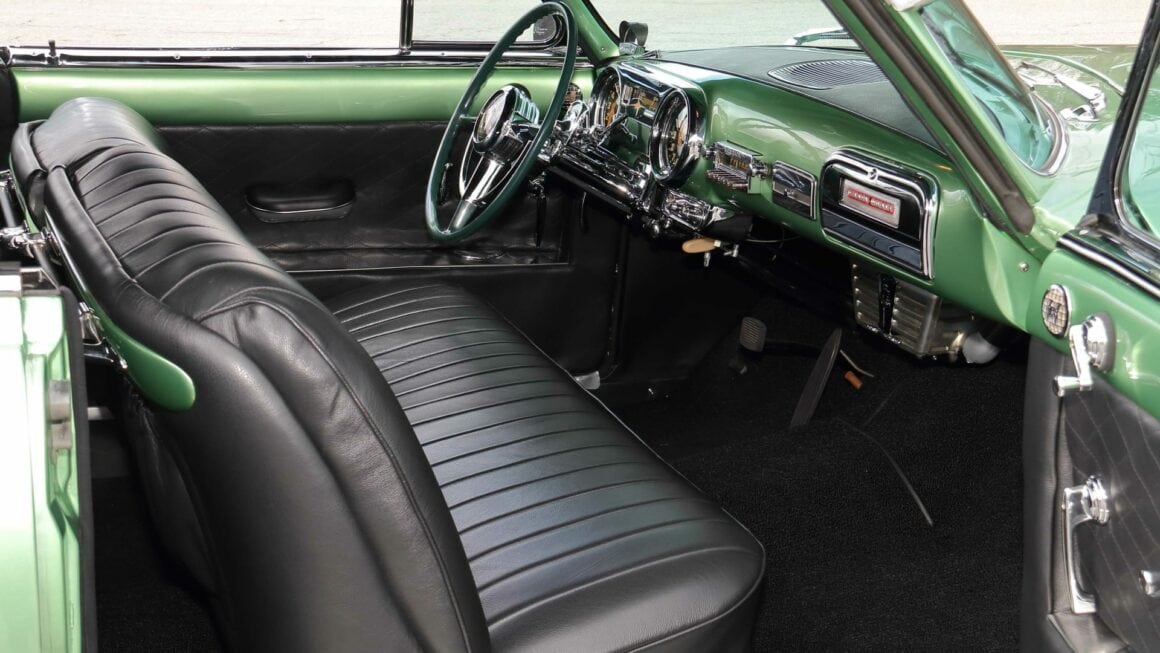 Elle restait la même, année après année. Finalement, le constructeur automobile américain s’est ainsi auto-exclu en raison de l’évolution constante des carrosseries boulonnées sur les mêmes vieux châssis des trois grands constructeurs Ford, General Motors et Chrysler… Triste ! Cette Hudson Hornet a été sur-restaurée à très frais/dépenses sans aucune limitation durant 12 ans en Suède pour un coût de 300.000 $ ! Ce cabriolet Hudson Hornet ’52, très rare est peint en “Gulf Green” avec un toit convertible vert foncé et un intérieur noir, le tout immaculé. Avec des lignes de carrosserie élégantes et fluides et les roues arrières sous caches, la Hornet était super aérodynamique.