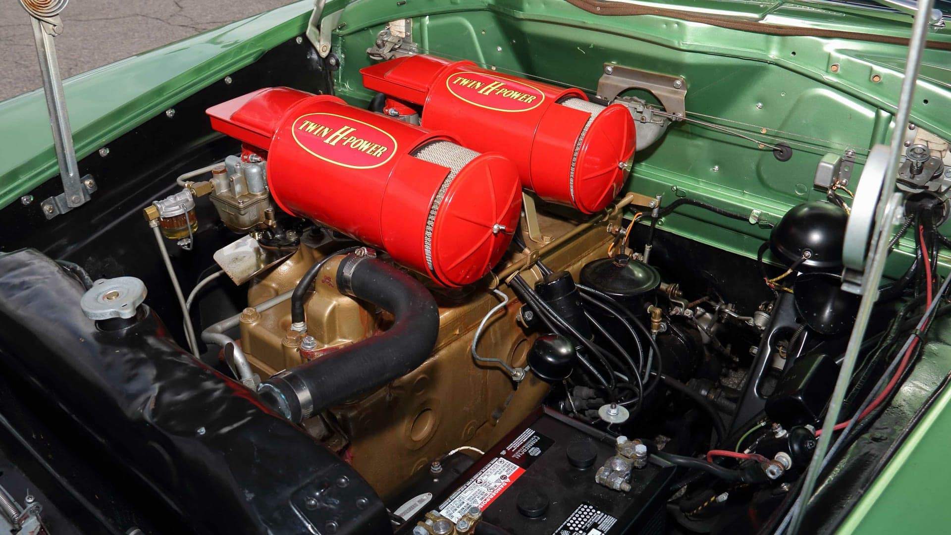 Grâce à une structure rigide et à un centre de gravité bas, la Hudson s’est avérée être la meilleure voiture américaine de son temps en matière de maniabilité. De plus, la voiture était incroyablement confortable grâce à son empattement long et à son poids. Ressemblant beaucoup à l’Hdudson Commodore 1948, la Hudson Hornet de 1952/1953 présentait toutefois diverses améliorations esthétiques. Pour l’année/modèle 1952, la ” Fabulous Hudson Hornet” était propulsé par le moteur six cylindres en ligne “Twin-H” à haute compression de 308ci (5,0 litres) avec une conception à tête en L et deux carburateurs à chacun un seul corps au sommet d’un collecteur d’admission double. À l’époque, c’était le plus gros moteur six cylindres au monde.