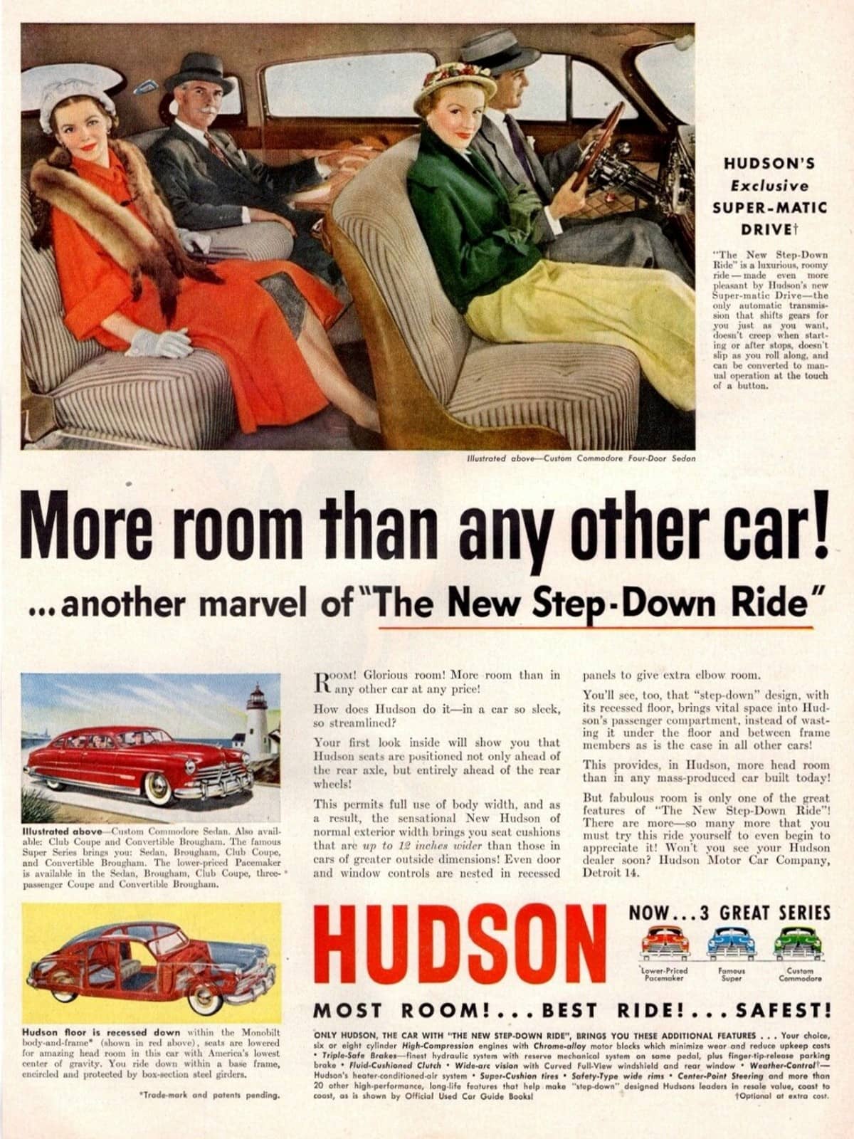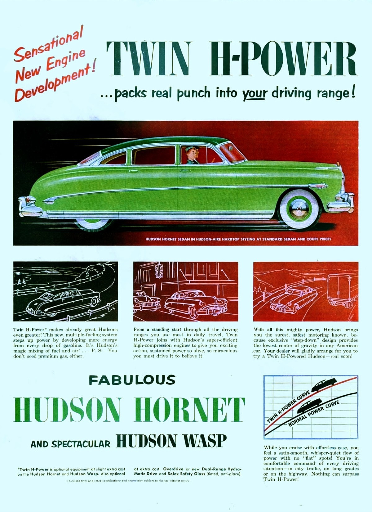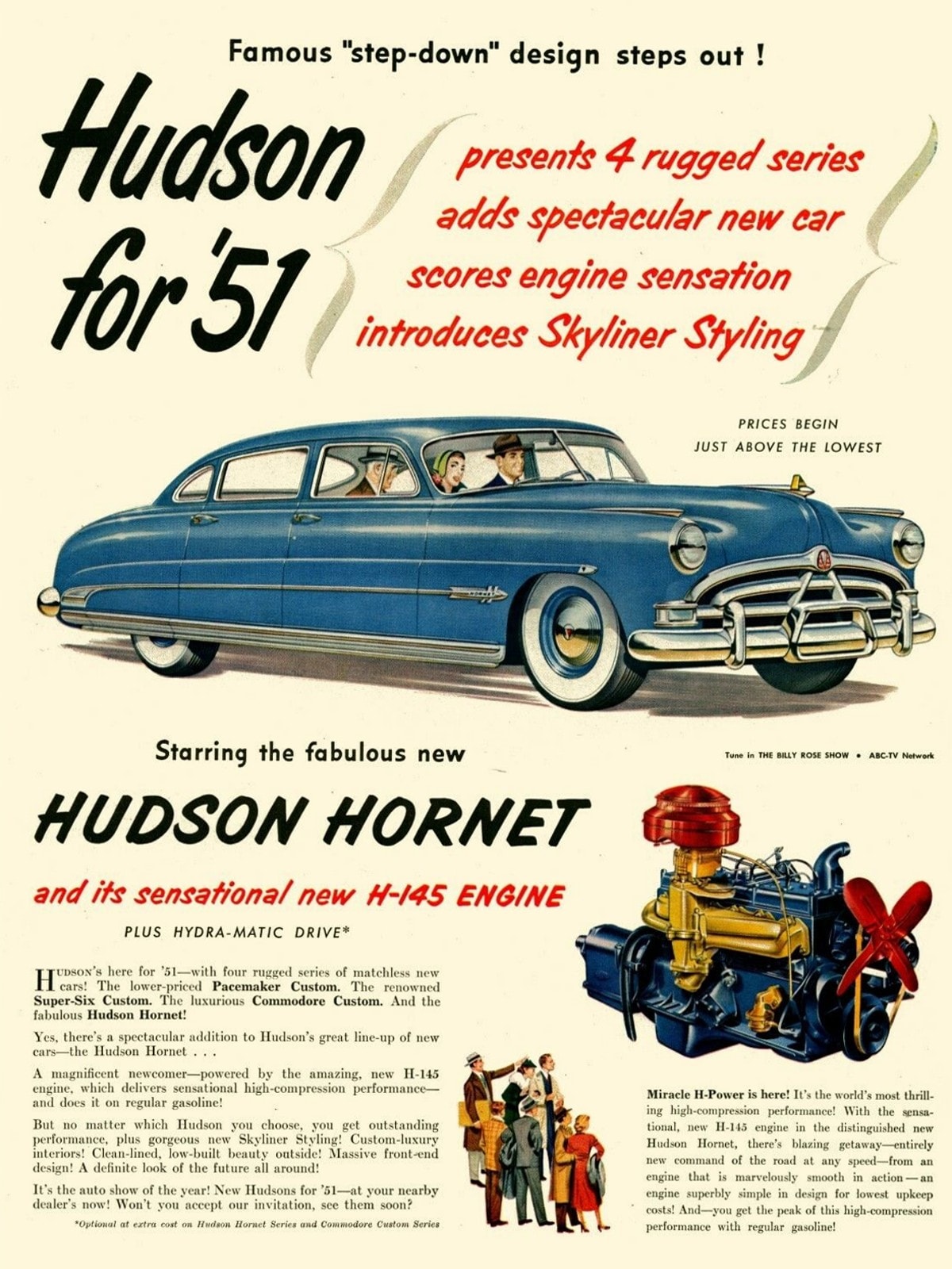 Les Hudson’s étaient les plus confortables automobiles de l’époque. Un nouveau moteur six cylindres en ligne 262ci a également fait ses débuts en 1948. Ce moteur à tête en L comportait un alésage presque “au carré” de 39/43 pouces, une compression de 6,5 : 1, et utilisait un Carburateur Carter, le tout permettant 121cv à 4 000 tr/min. Ce moteur sera agrandi en 1951 à 308ci avec une culasse en aluminium à haute compression (7,2: 1) “Power Dome”. La bête développait 145 cv à 3 800 tr/min. C’était le moteur six cylindres le plus gros et le plus puissant disponible dans une voiture américaine en 1951. Ce moteur agrandi n’était disponible que dans la Hornet de 1951, basée sur la Commodore à empattement de 124 pouces.