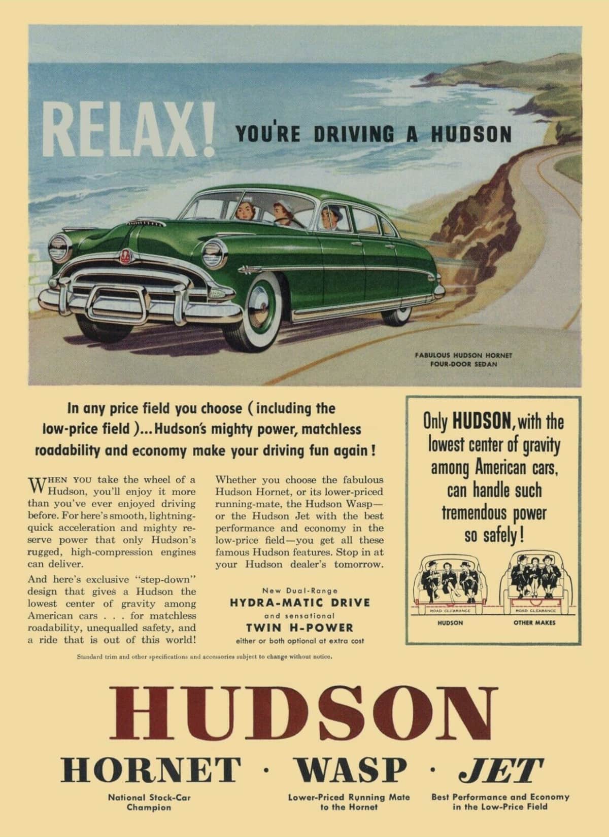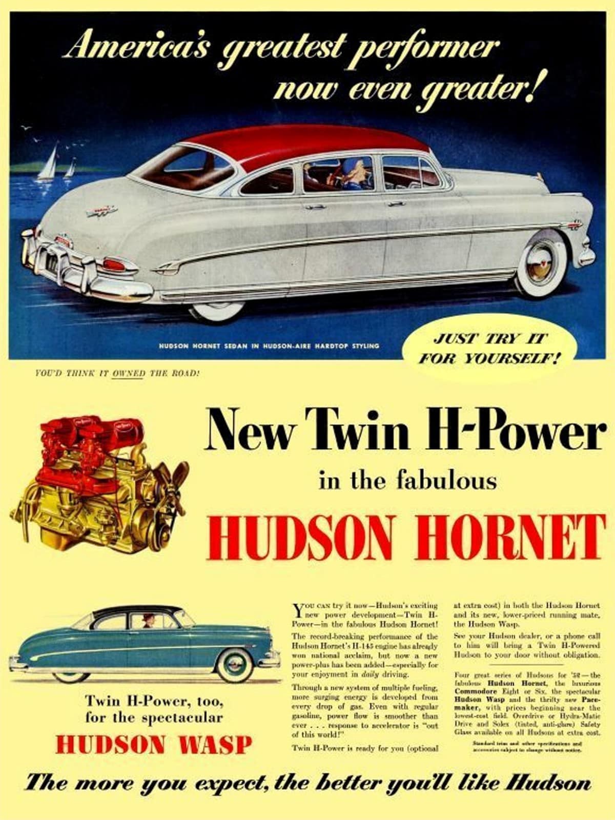 Entre 1951 et 1955, la Hudson Hornet a remporté plus de 40 victoires en NASCAR. De ce “haut fait d’arme” (sic !) typiquement Yankee qui perdure encore dans la saga des films “CARS” de Walt Dysney, Hudson s’est hissé en haut de l’affiche médiatique comme étant le tout premier constructeur automobile au monde à avoir réussi l’exploit d’enflammer l’univers des courses automobiles. Hudson a sur-conçu et sur-développé la Hornet qui s’est avérée presque invincible quand il s’agissait de courses de stock-car sur terre battue car peu de pistes de course étaient pavées ou asphaltées dans les années 1950. Bien que la Hudson Hornet a eu de nombreux succès en course, les ventes ont commencé à diminuer en raison de la conception monocoque de la voiture.