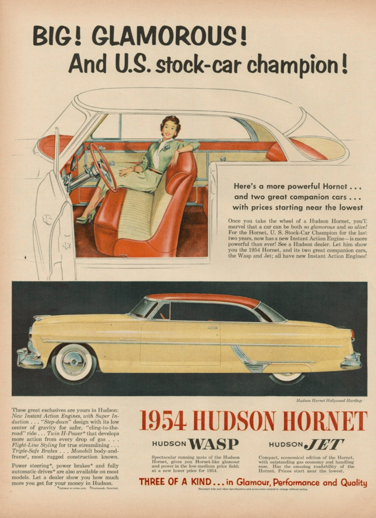 Pour pimenter les ventes de 1953, Hudson a offert un lifting mineur en déplaçant les supports verticaux derrière la calandre et en changeant l’ornement du capot en une fausse entrée d’air orientée vers l’avant. La nouvelle sellerie se présentait sous la forme d’un tissu de nylon à carreaux ou de cuir en option, et les autres options comprenaient une radio à bouton-poussoir à huit tubes (100 $), un pare-brise en verre Solex (42 $), une peinture bicolore (31 $) et une transmission automatique HydraMatic (176 $). La Hornet “step-down” a reçu ses changements les plus radicaux en 1954, qui serait la dernière année de production de Hudson avant de fusionner avec Nash.