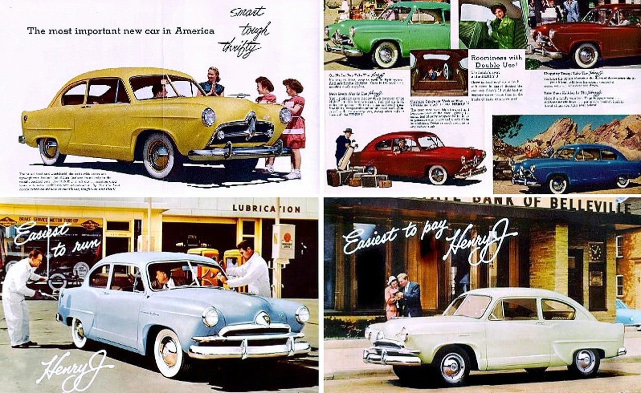 C’étaient les vases communiquant en quelque sorte ! Mais les fonds ainsi drainés pour lancer cette si laide petite chose ridicule qu’était la Henry-J, manquaient cruellement pour mettre au point un nouveau V8 performant et une voiture de grand format… Cette gaffe et d’autres… car il y en eut beaucoup, ont amené la Kaiser-Frazer Corporation dans des difficultés insurmontables…, la Henry-J a été un désastre… (les extraits des catalogues, vous aideront à comprendre). Après une poussée initiale relative en 1951 (nul n’est parfait), les ventes ont rapidement diminué (un sursaut humanitaire)…, dans sa dernière année : 1954, il n’y eut que 1.123 voitures vendues, le total de quelques années dépassant malgré-tout les 100.000 ventes…, mais une chose curieuse s’est produite sur le chemin du cimetière : les Hot-Rodders étaient enthousiastes de la mécanique de la Henry-J…, ils avaient découverts que le six cylindres de l’Henry-J était très rapide (aux normes standards, s’entend)…, n’oubliez pas qu’on est en Amérique, pays des basse-cours et cul-terreux habitués à rouler dans des voitures monstrueuses (pachydermiques) de 3 tonnes ou dans des Pick-up anémiques et agricoles…, ce qui signifie que les misérables 80 chevaux-vapeur obtenus comme par magie d’un bloc en fonte de 161ci à longue course (sic !), rendaient cette petite horreur, semblable à une torpille capable d’un zéro à 100 km/h en 13 secondes…, ce qui était époustouflant en 1951. Quelques Henry-J “de course” ont été dûment construites afin d’en faire connaître les performances au public médusé…, mais ces engins ainsi bricolés ne prouvaient rien du tout…