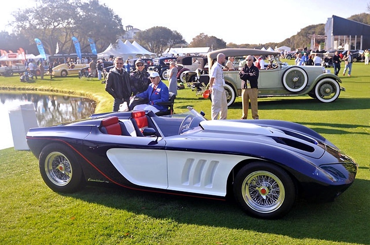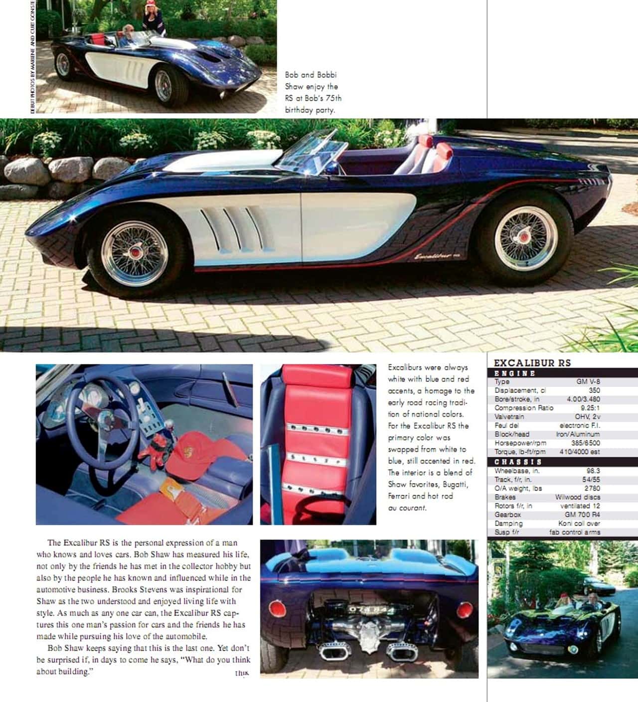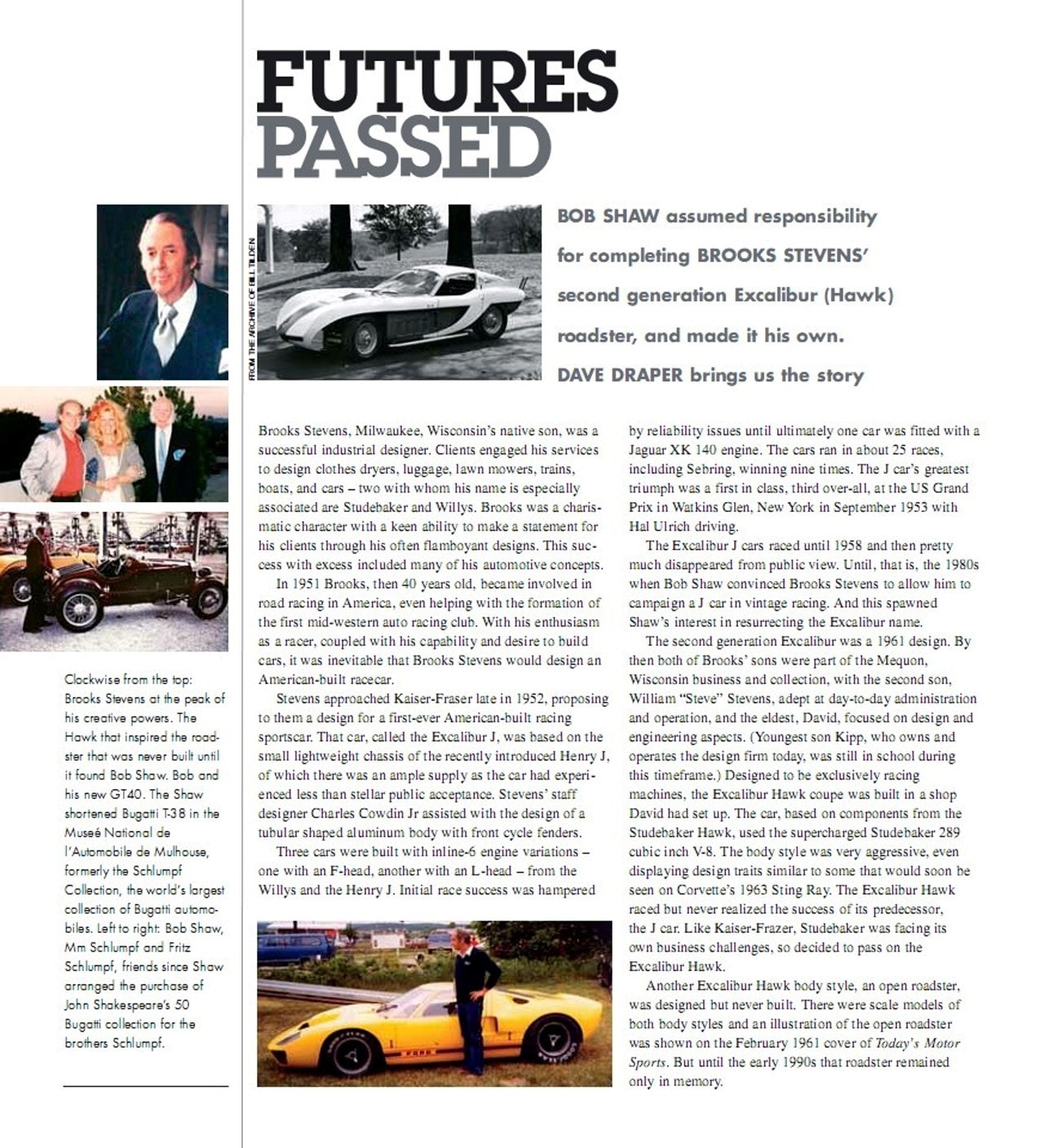 Brook Stevens a ainsi été prouvé qu’il était aussi compétent que les Européens dans la création de véritables voitures de sport, capables de concourir le week-end et d’être conduites relax, en ville, la semaine… et cela à partir de composants de masse de tous les jours de production… Il a été propriétaire de quelques voitures extraordinaires, y compris des Bugatti, une Type 38 et une 51 Grand Prix, ainsi que d’une authentique Ford GT40 qui a été utilisée en course. Bob Shaw, 75 ans, est resté un grand passionné de l’automobile…, en 1963, il avait négocié, au nom des frères Schlumpf, l’achat de plusieurs Bugatti auprès de John Shakespeare, propriétaire à cette époque d’une des plus grandes collections d’automobiles (Aujourd’hui, la collection fait partie du Musée National de l’Automobile à Mulhouse, France). Bob Shaw a également été propriétaire de diverses marques anglaises comme Morgan, MG, Jaguar, Rolls Royce et Bentley…, ajoutez à cela des Ferrari et quelques Françaises comme des Renault Alpine… et vous cernerez ce que cet homme sait sur les voitures. Jusqu’à ce que, dans les années 1980, Bob Shaw réussit à convaincre Brooks Stevens de lui permettre de rouler dans une des trois Excalibur-J dans une course vintage. Comme vous venez de le lire ci-avant, les Excalibur-J ont donc couru jusqu’en 1958…, puis ont disparu de la vue du public… et cela a engendré plus que de l’intérêt… : l’envie d’en posséder une, en conséquence directe de son temps passé dans le siège de l’Excalibur-J ! Bob Shaw, complètement accroc du sport automobile vintage, a décidé que l’ultime hommage à son ami Brooks Stevens serait de construire le Roadster Excalibur Hawk qui n’avait jamais existé… et d’être en mesure de courir avec cet engin mythique dans divers évènements historiques automobiles (comme on le dit vulgairement : c’était du flan caramel)…
