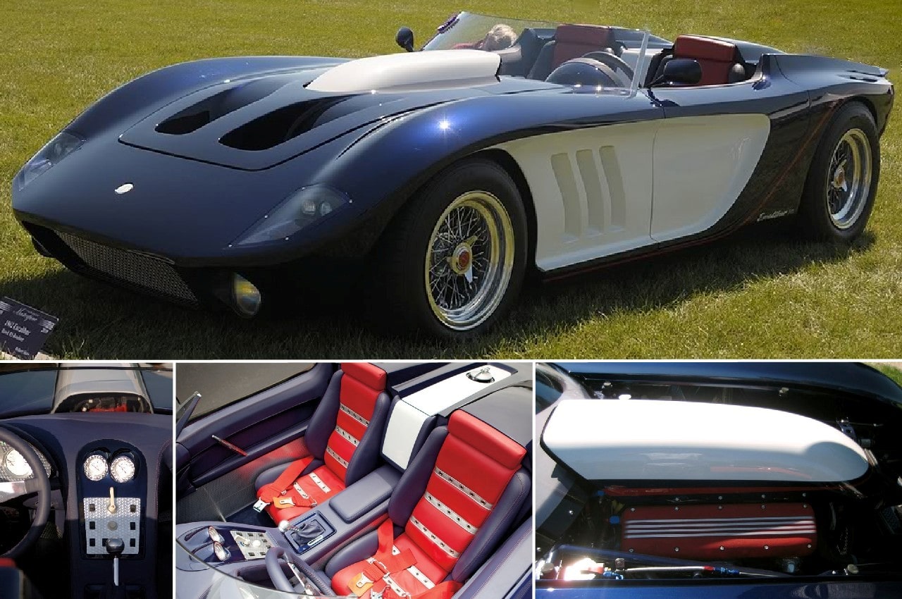 Donc, après 5 ans dont on ne sait strictement rien…, en 1985, il a contacté son ami et manufacturier expert : Chuck Rahn, à Scottsdale, en Arizona, ancien pilote sur l’Excalibur-J (belle brochette de spécialistes), pour construire le châssis et la voiture à l’aide des plans originaux de Brooks Stevens et de ses dessins…, mais aussi avec le prêt de l’Excalibur Hawk Coupé afin d’en réaliser des moulages… Comme le projet avançait vite (je suspecte que sous tout le charabia qui m’a été débité en tranches épaisses… et dont je me fais un plaisir de retranscrire ci-après à votre spéciale attention…, que la base de cet engin est une Dodge Viper accidentée, donneuse de ses éléments vitaux… et que la carrosserie est celle d’une Barrister égarée, construite par Georges Barris, amplement modifiée pour donner l’apparence d’un vague look de l’Excalibur Hawk Coupé)…, Brook Stevens qui en était aux dernières années de sa vie (tout le monde est mortel, ne vous en faites pas, votre tour viendra aussi), a toutefois demandé à Bob Shaw d’inclure quelques nouveaux traits de sa conception en fonction de ses années d’expérience (d’où mes suspicions d’un bidouillage intégral)…. Herb Grasse, designer pour Ford, Chrysler, Nissan, et autres, qui habite non loin de Chuck Rahn a été consulté pour la conception d’une expression “design” plus contemporaine pour le Roadster Excalibur Hawk (ce qui ne veut rien dire de concret) :