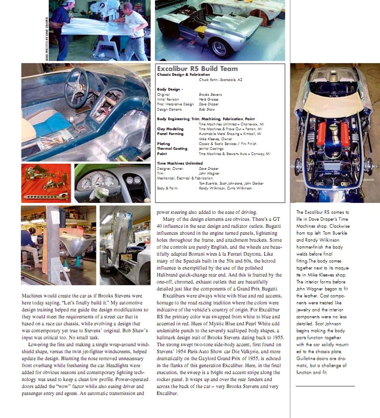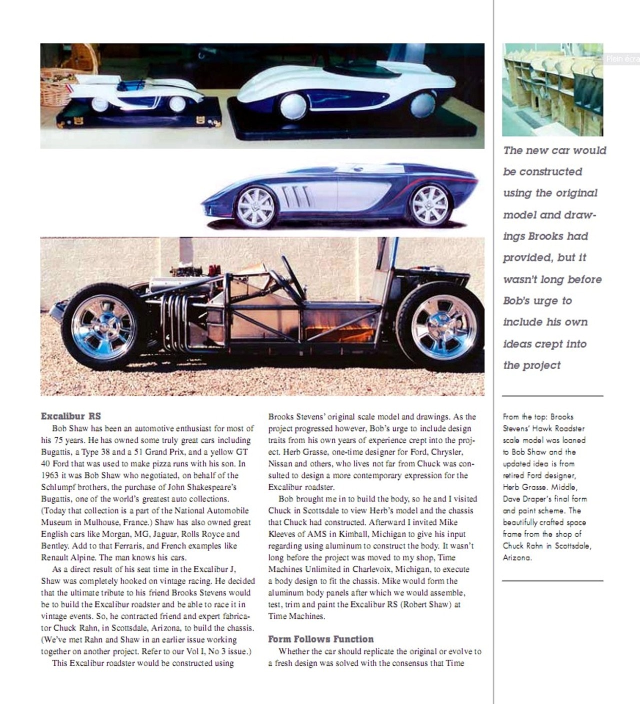 “Bob m’a contacté pour construire la carrosserie, j’ai ensuite visité Chuck Rahn à Scottsdale pour visualiser le châssis que Chuck avait construit. Par la suite, j’ai invité Mike Kleeves de l’AMS à Kimball, Michigan, pour me donner son apport en ce qui concerne l’utilisation d’aluminium pour construire la carrosserie. Il n’a pas fallu longtemps avant que le projet s’installe dans ma boutique : Time Machines Unlimited àCharlevoix, dans le Michigan, afin d’exécuter une carrosserie qui s’adapte au châssis. Mike formant les panneaux de carrosserie en aluminium. Après quoi nous avons tout assemblé, testé la voiture, et réalisé la peinture. Si la voiture devait reproduire l’originale, qui n’a jamais existé…, le résultat n’est pas la finalité…, car on a évolué vers une conception nouvelle…, ce qui a généré des problèmes, tous résolus avec un consensus général, stipulant que Time Machines créerait la voiture comme si Brooks Stevens était ici aujourd’hui et disait : “Let’s go !”… Ma formation dans la conception automobile a guidé les modifications de conception, afin qu’ils répondent aux exigences du tramway basé sur un châssis de voiture de course, tout en élaborant un modèle qui reste fidèle aux dessins de Brook Stevens… Et avec Bob Shaw cela a été trop critique. Ce n’était pas une mince tâche”… (vous ne me croirez pas, mais j’ai pleuré en retranscrivant cela) ! Cette Excalibur Hawk Roadster RS se veut donc être l’expression personnelle d’un homme qui connaît et aime les voitures (rechute.., j’ouvre ici une petite pause pour sécher mes larmes…, puis je reviens)…. Bob Shaw a mesuré sa vie, non seulement par les amis qu’il a rencontrés dans le hobby des collectionneurs d’automobiles, mais aussi par les gens qu’il a connu dans le secteur automobile. Brooks Stevens a été une source d’inspiration pour Bob Shaw qui aurait aimé vivre sa vie avec style…, Bob Shaw ne cesse de dire que c’est la dernière re-création, parce qu’il a maintenant 75 ans…, pourtant, ne soyez pas surpris si dans les jours à venir il dit : “Que pensez-vous de reconstruire une Gaylord…?” Pour ma part, je m’en tape les cuisses…, étant particulièrement fatigué de retranscrire tout ce toutim, je me simplifie la vie en publiant ci-après, les 4 pages de présentation (en anglais) de l’Excalibur RS, qui je vous le souligne…, non seulement n’a jamais existé…, mais n’est nullement une copie de cette voiture…, qui plus est, elle a été affublée d’une “certaine” quantité de pièces dénaturant l’œuvre de Brooks Stevens… qui ne dira strictement plus rien, étant décédé…