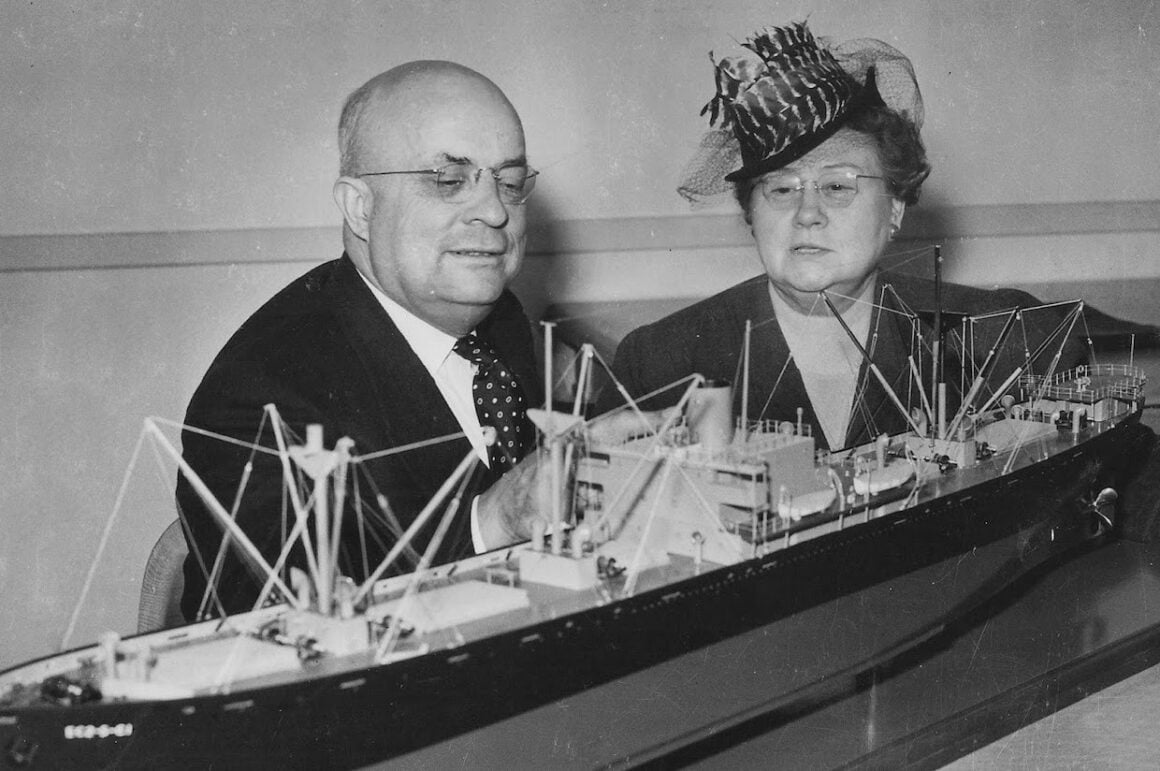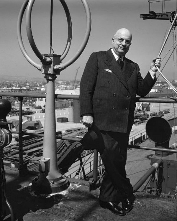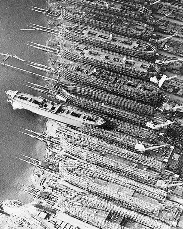 C’est aussi celui qui a la réputation la plus sulfureuse. Dans les années 1930, on ne compte plus les commissions d’enquêtes mandatées par le Congrès pour violations de la législation fédérale sur le travail. A lui seul, le chantier de l’Hoover Dam sera entaché de 10.000 procédures ! A chaque fois, Henry Kaiser parviendra à échapper aux poursuites, menant à Washington un lobbying actif, n’hésitant pas à recourir aux “causeries radiophoniques” pour prendre le public à témoin, faisant de chacun de ses chantiers autant d’exploits humains . A Oakland, en Californie, où il a ses bureaux et où il réside avec sa famille, il prend soin chaque Noël d’inviter chez lui tout son personnel, mais aussi ses voisins et tous ceux qui le souhaitent, pour une gigantesque garden party, peaufinant ainsi son image – réelle au demeurant – d’homme simple et accessible. L’industriel restera toute sa vie fidèle à la Californie, se faisant construire en 1935 une belle propriété non loin d’Oakland où il se livre à l’une de ses grandes passions : le ski nautique. Le préfabriqué, l’assemblage rapide, la spécialisation : ces recettes qui ont fait le succès des Six Compagnies, Henry Kaiser va les mettre au service de son activité la plus célèbre : la construction des Liberty et des Victory ships. A l’automne 1940, l’industriel propose aux autorités fédérales de construire pour le compte des Anglais, désormais seuls en guerre contre l’Allemagne, les bateaux de transport qu’ils réclament à cors et à cris. Malgré le manque total d’expérience de Kaiser dans le domaine de la construction navale, Roosevelt accepte, en grande partie semble-t-il afin de préserver les capacités de production des autres chantiers navals en prévision de l’entrée en guerre des Etats-Unis. Dès la fin de l’année 1940, les deux chantiers navals que Kaiser a créés à Richmond et Portland sont opérationnels.