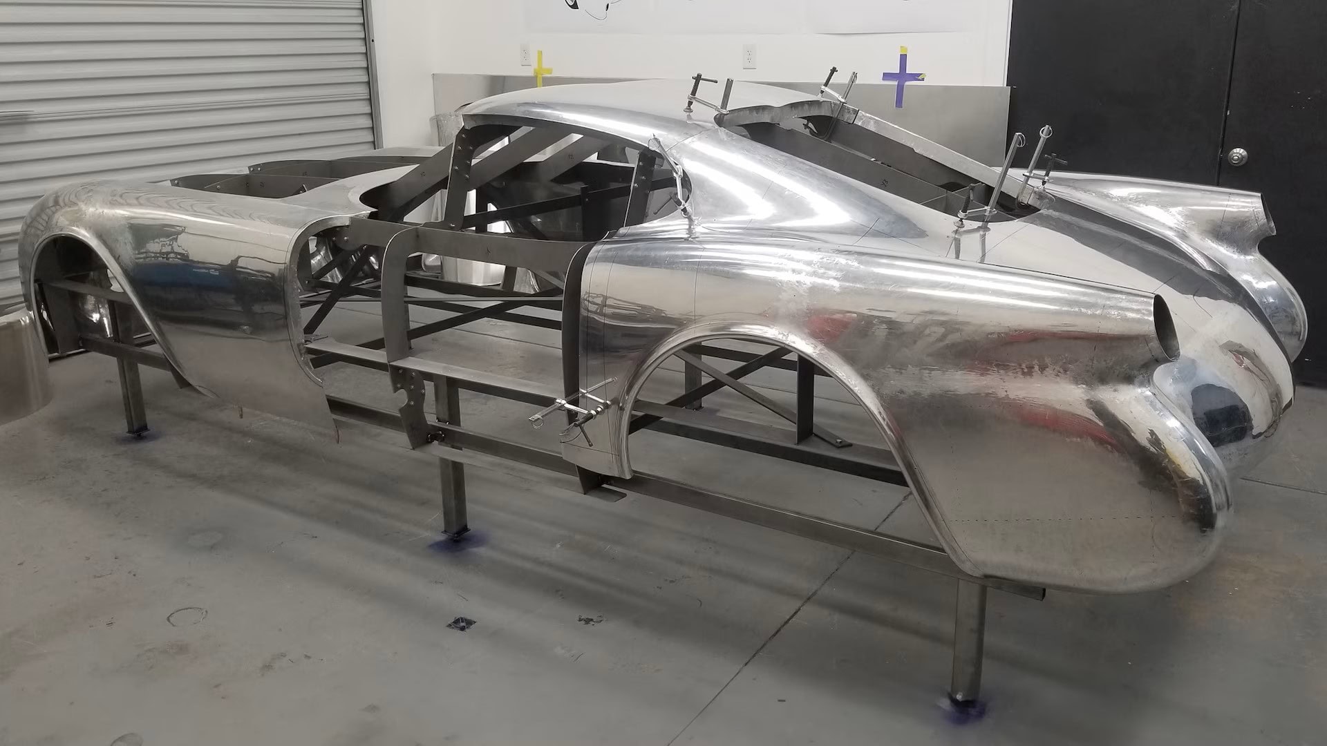 Mais le vrai défi a été de travailler avec des ingénieurs pour trouver le bon équilibre entre forme et fonction. “Bien que notre attention se soit portée sur la forme, il était important de s’assurer que tout fonctionnait correctement” m’a dit Dave. Des centaines d’heures ont été passées à façonner la coque extérieure en aluminium de type 3003, en utilisant des carrossiers de la vieille école pour y parvenir. Le plancher et le bas de la voiture ont été construits à l’aide d’une structure renforcée en aluminium type 6061 plus épais qui a été prise en sandwich pour créer une structure monocoque.
