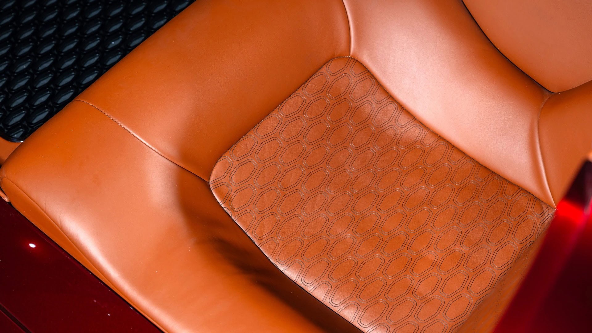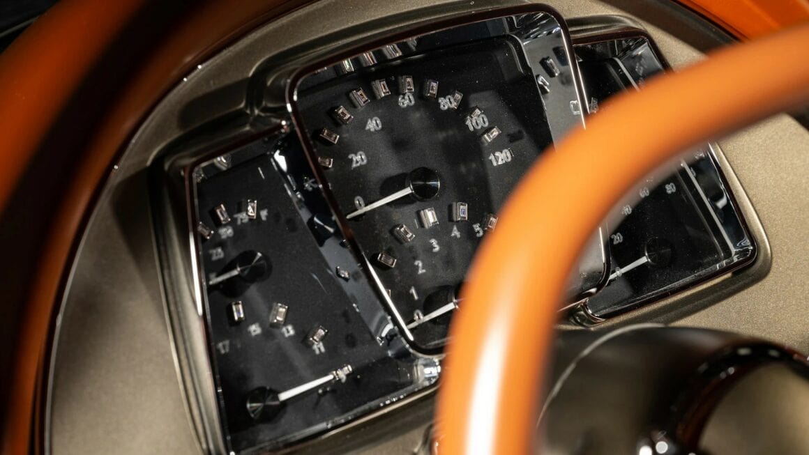 C’était pour maintenir l’aspect super exclusif de la voiture. Le système d’échappement est aussi unique que le reste, avec des collecteurs 3-en-2-en-1 fabriqués en interne incorporant un seul tube en acier inoxydable de 3po qui utilise des tarières au lieu d’un silencieux traditionnel. Comme le reste du projet, l’échappement était une nouvelle façon de voir comment les Hot Rods sont généralement construits. La majorité de l’intérieur a été imprimée en 3D et enveloppée de cuir de couleur terre de Sienne. Les anses et les nacelles du tableau de bord ont été inspirées par les premières Corvette’s.