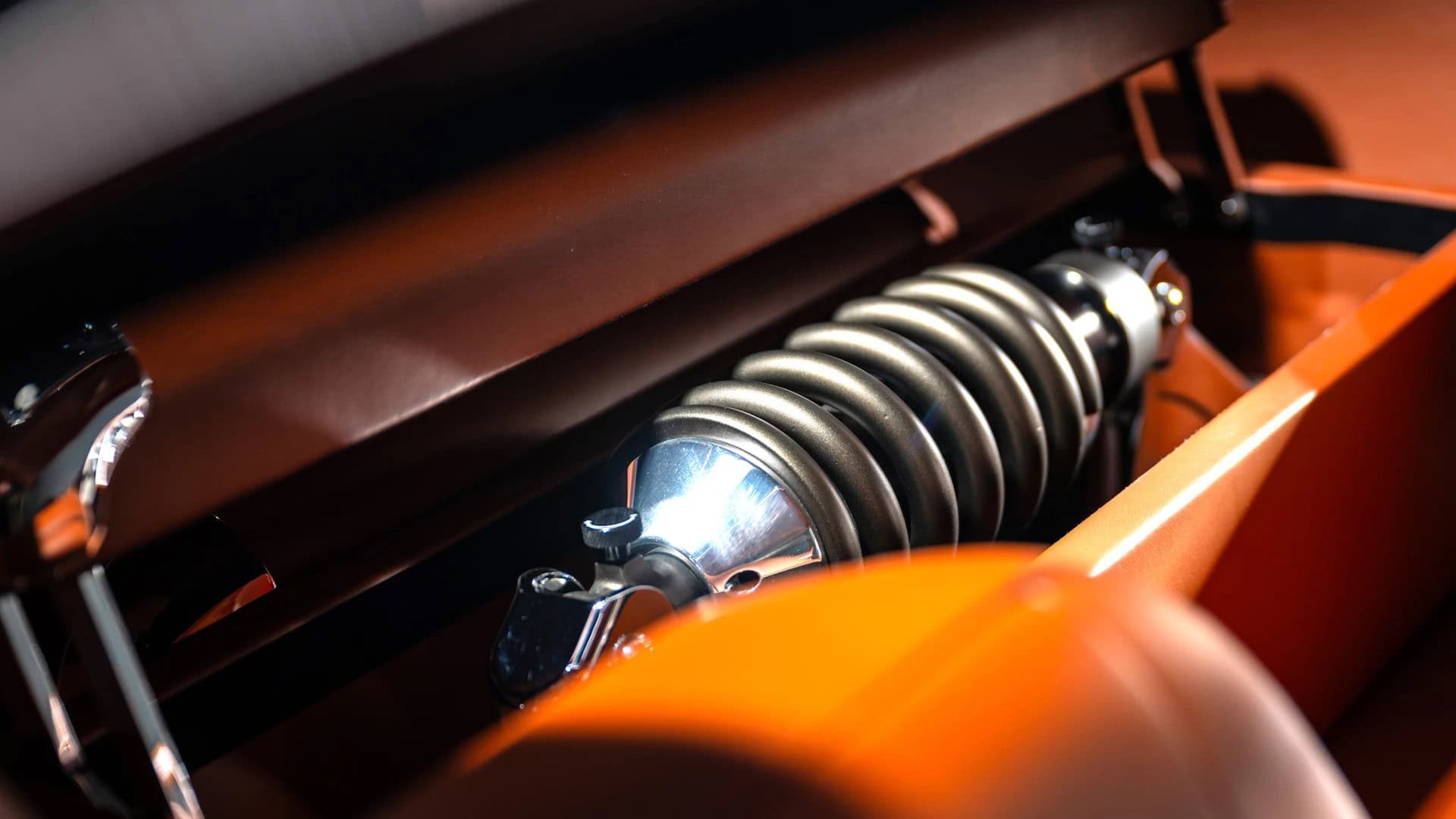 La suspension est inspirée des conceptions de la Formule 1 et de l’Indy Car, mais n’utilise qu’un seul ressort, monté horizontalement. La suspension avant est dotée d’un bras triangulaire sur le dessus qui se connecte au cône avant, d’un bras en H qui se connecte au carter d’huile renforcé, de tiges de poussée et d’une barre stabilisatrice en deux parties couplées au milieu. La suspension a une sensation organique qui intègre l’approche “forme et fonction” de la construction. La suspension arrière utilise une conception similaire avec un seul ressort et une connexion inférieure à bras en H à la boîte-pont.