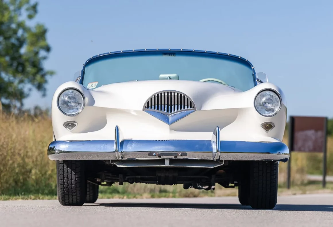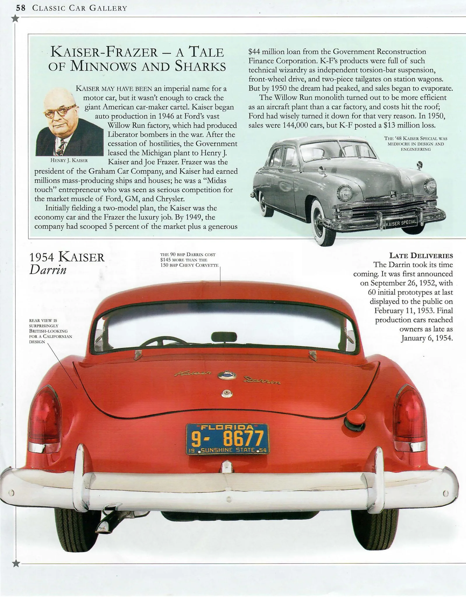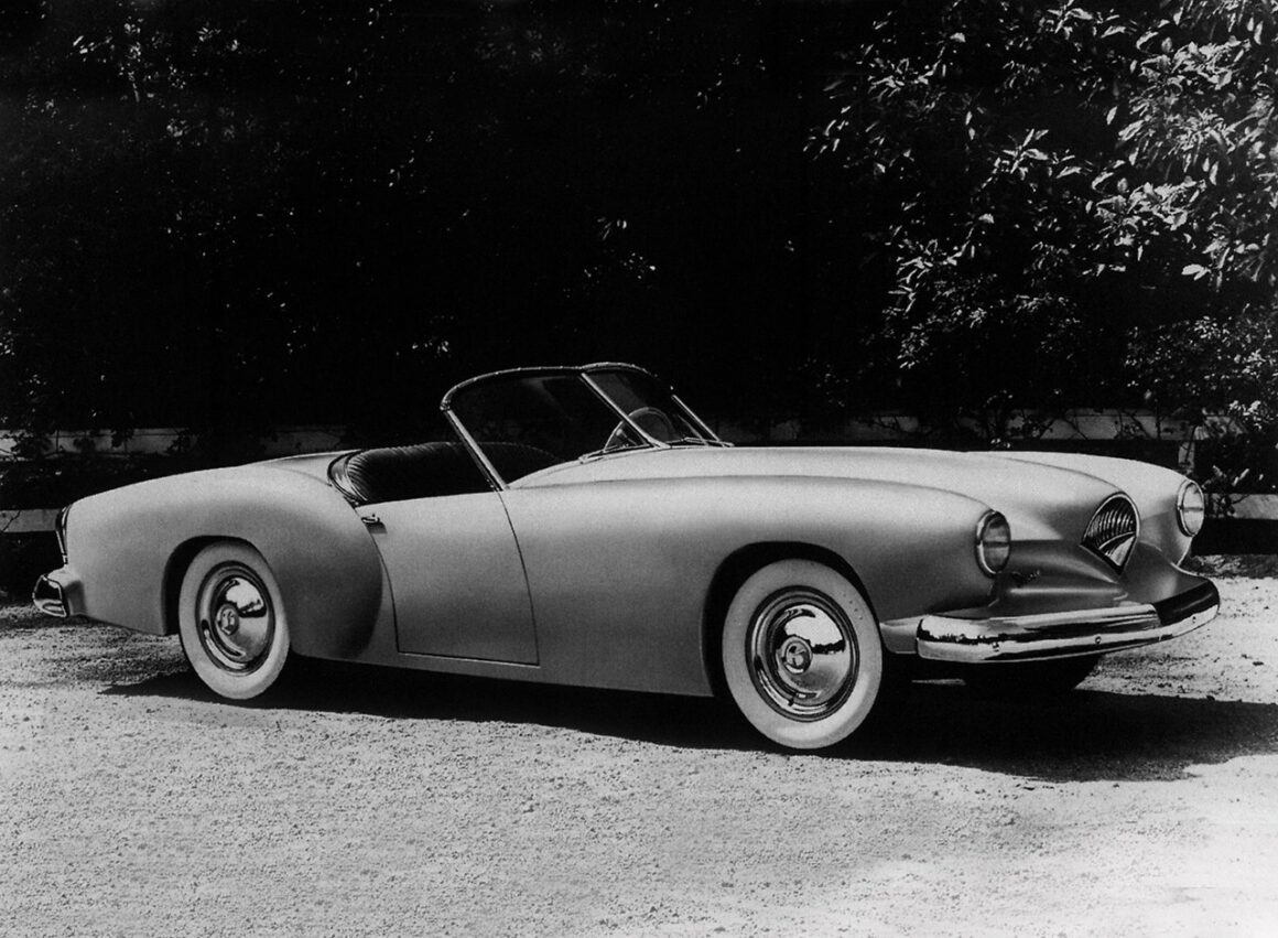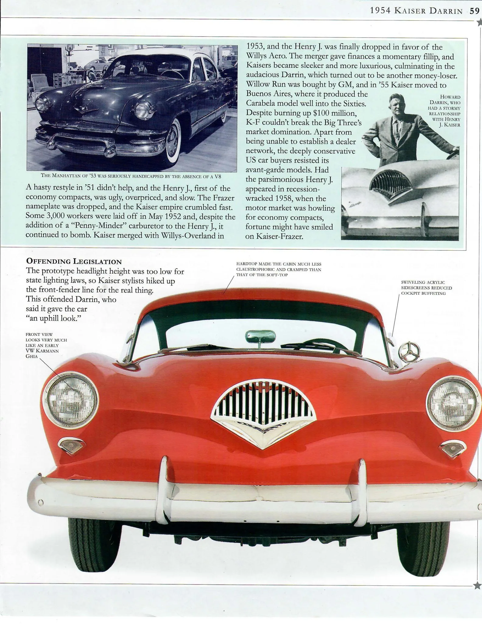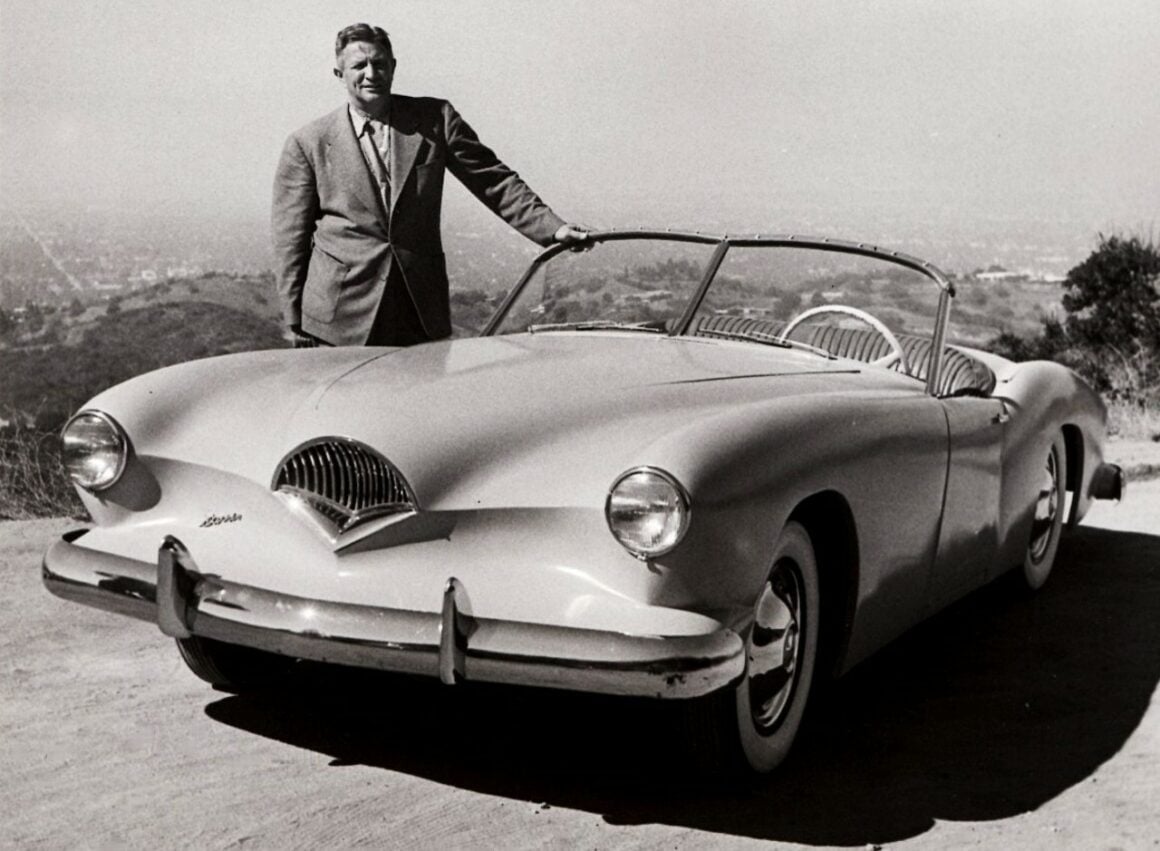En 1942, alors que “la guerre” donne opportunément l’occasion à l’Amérique de consolider son rôle de larron en foire, le magnat de la construction, Henry J. Kaiser décide de se lancer dans le secteur automobile militaire avec l’invention de la Jeep qui lui sera détournée, le renvoyant au rôle clownesque de celui qui a des idées mais se les fait voler. Il s’associe alors à Joseph W Frazer pour fonder la Kaiser-Frazer Corporation qui devient Kaiser Motors suite au départ de Frazer en 1949. Howard “Dutch” Darrin, concepteur de génie méconnu, est débauché en 1952 de chez Packard pour rejoindre à nouveau la direction des ingénieurs au sein de Kaiser (de forts désaccords avec le dirigeant l’avaient fait quitter le groupe en 1946). Il va donc travailler deux années avec obstination pour engendrer en 1954 une des plus laides voiture “de sport” 2 places en fibre de verre de l’univers connu à l’époque.