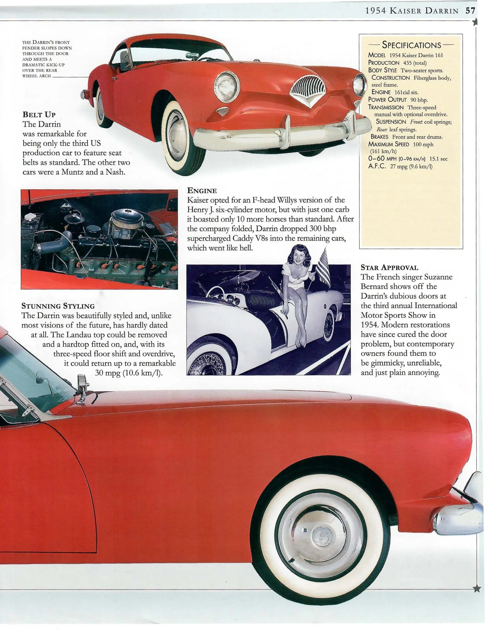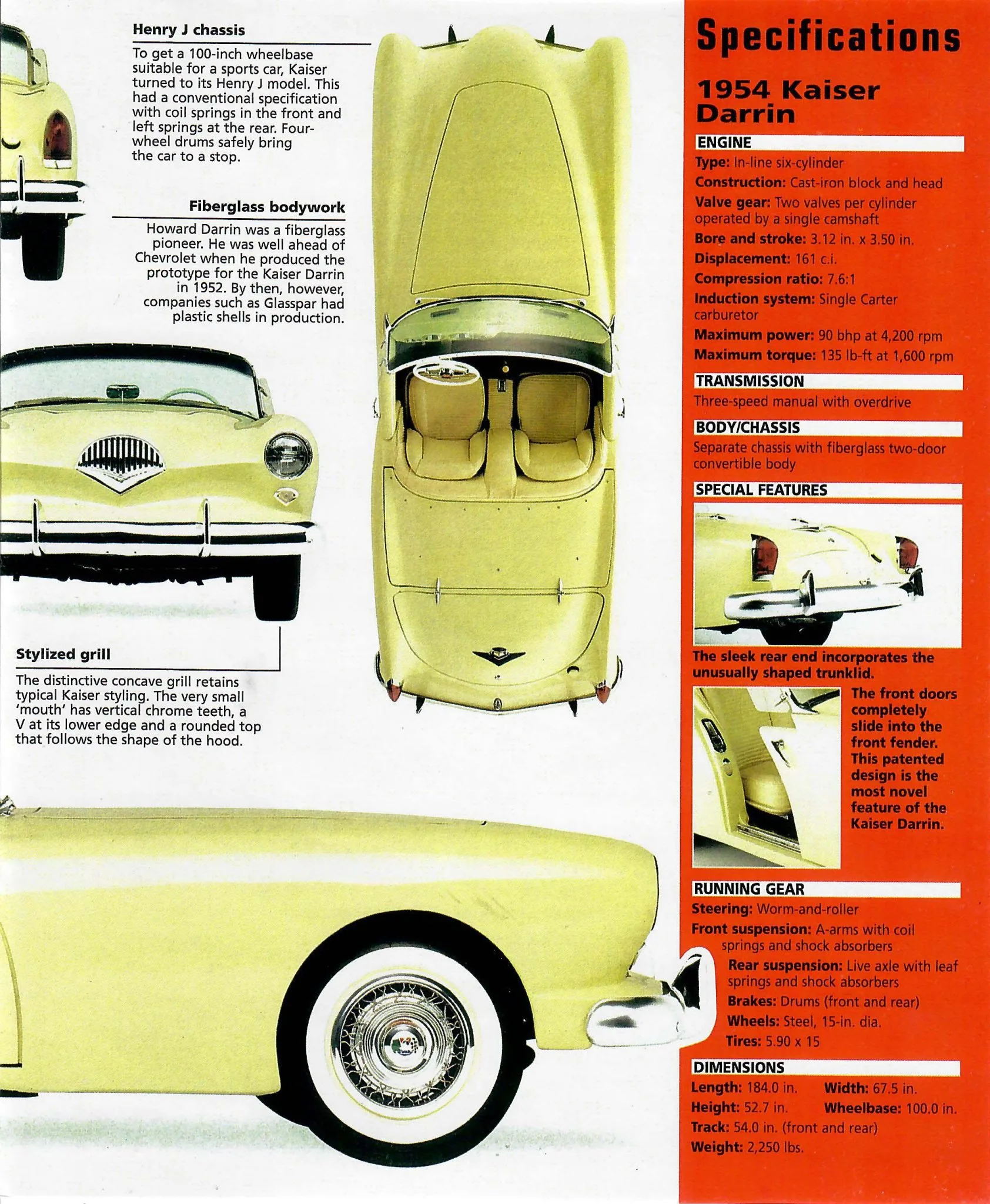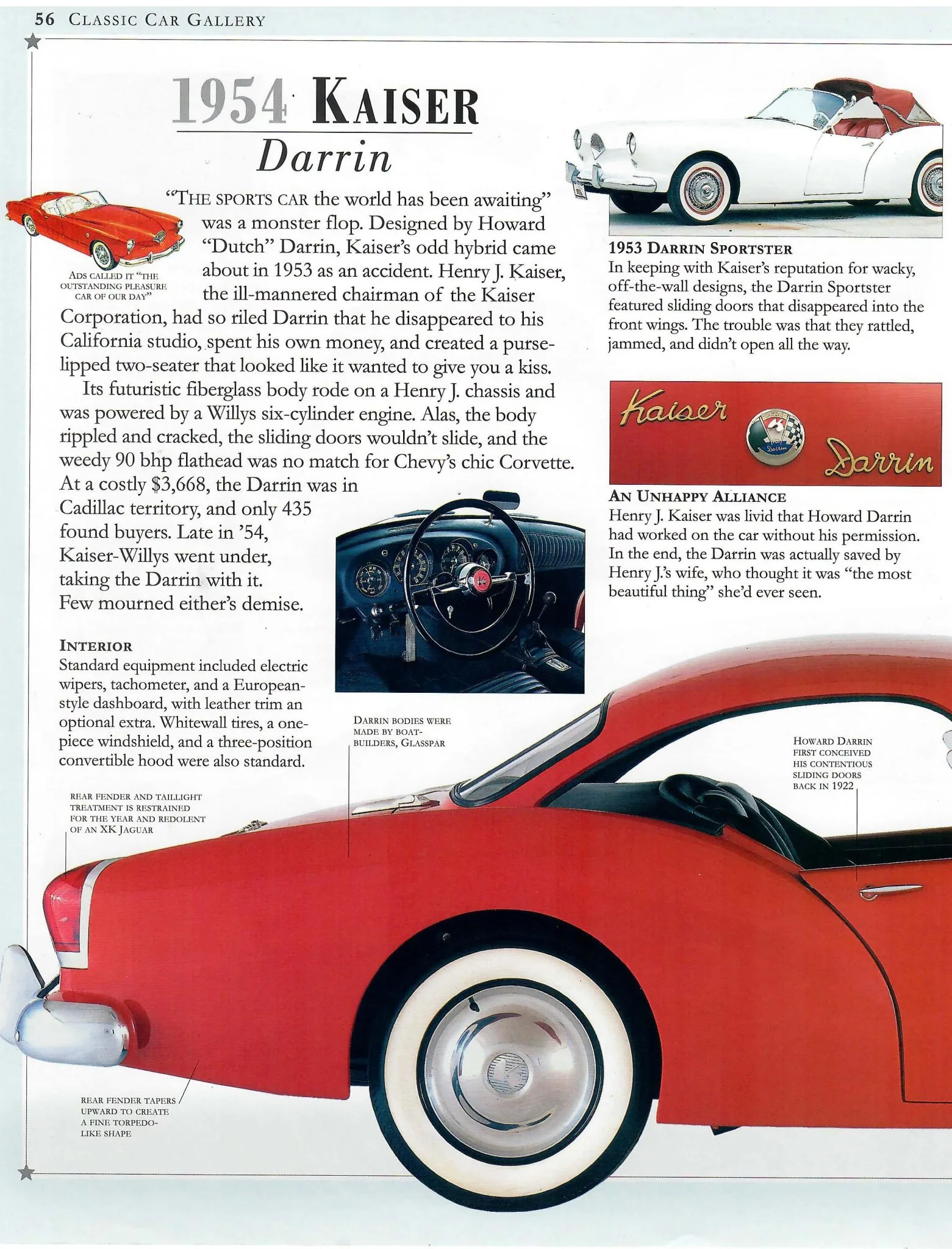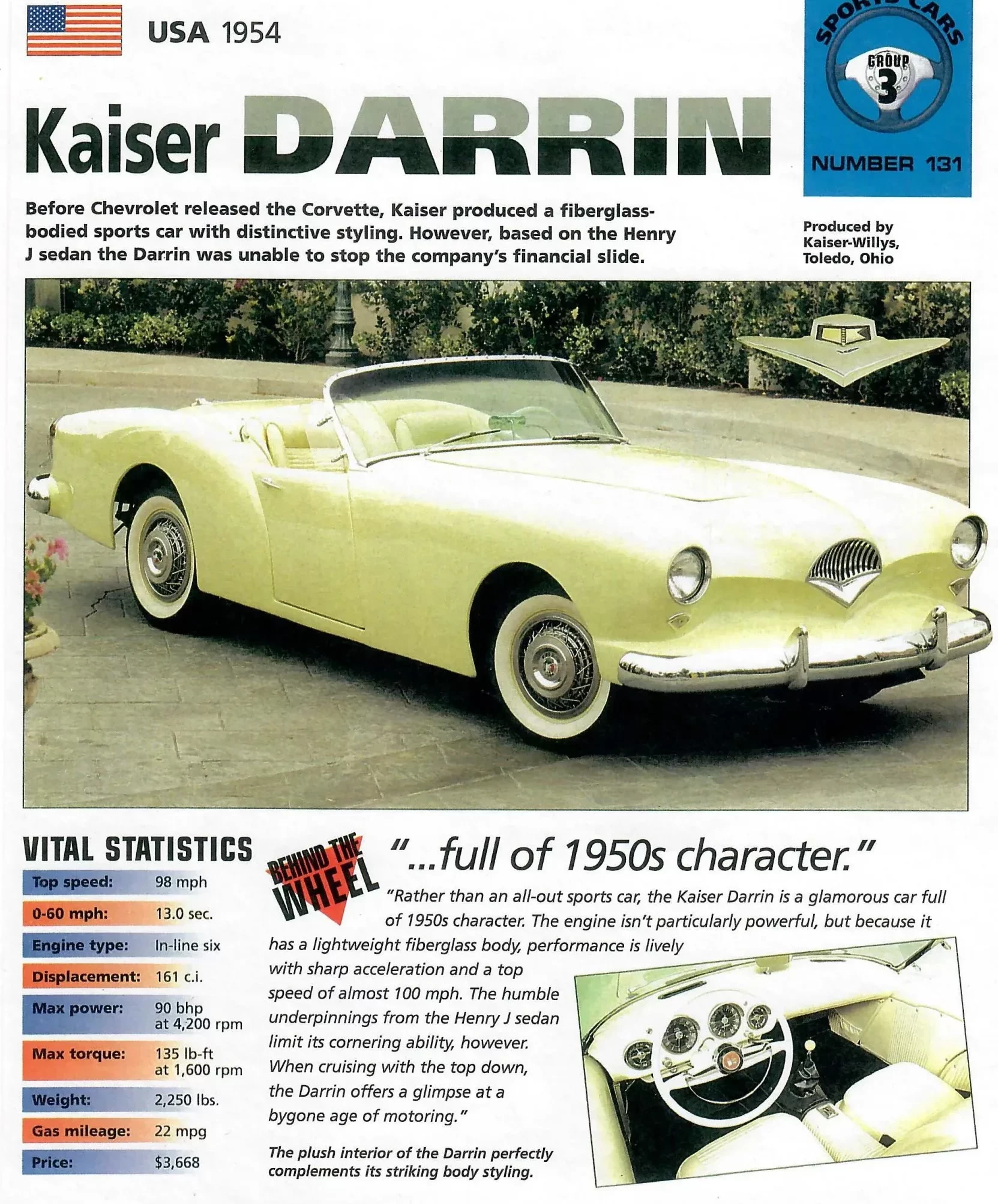 – La Kaiser Darrin est une voiture américaine inhabituelle qui est beaucoup moins célèbre qu’elle ne mérite de l’être. La Darrin a été la première voiture de sport en fibre de verre produite en série dans le monde, ce qui signifie bien sûr qu’elle était aussi la première voiture de production à corps composite.