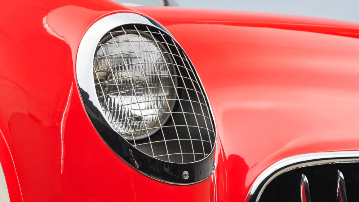 La carrosserie en fibre de verre a été peinte en Gypsy Red. Les roues en acier de 15 pouces sont dotées d’enjoliveurs chromés et sont montées avec des pneus Firestone Deluxe Champion à plis à plis inclinés. Un service effectué en mars 2019 par Gibson Auto & Electric de Portland, en Oregon, comprenait la reconstruction du maître-cylindre de frein et l’installation de nouveaux cylindres de roues et sabots de frein. Vendue 245.000 US$