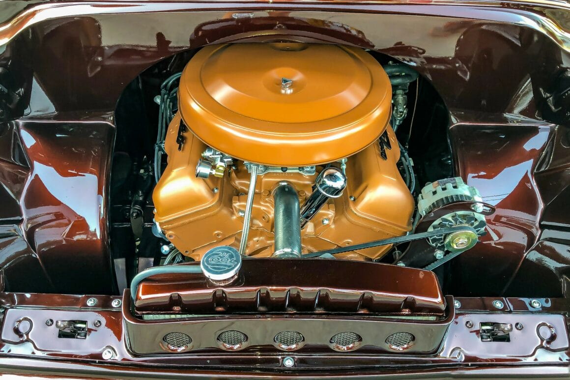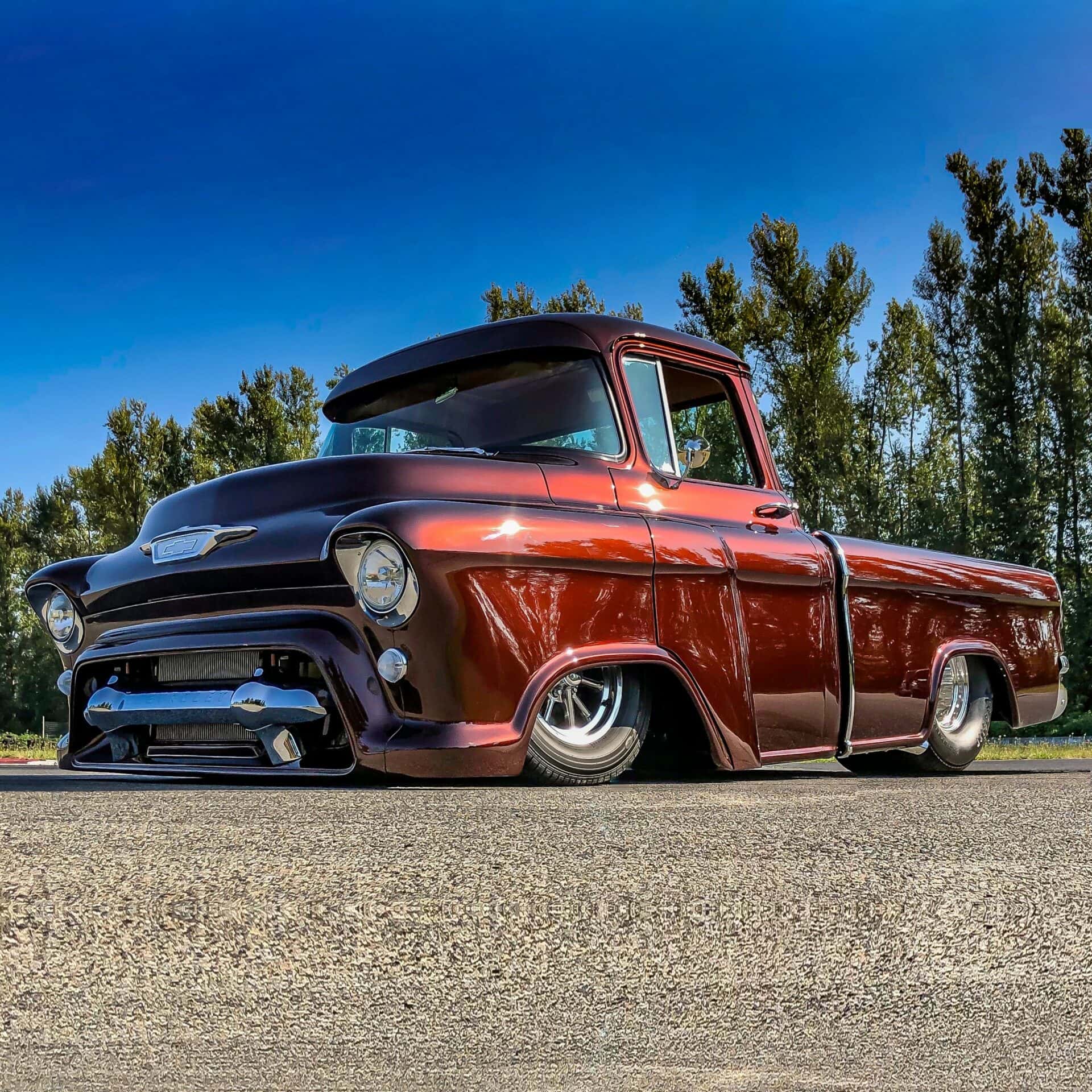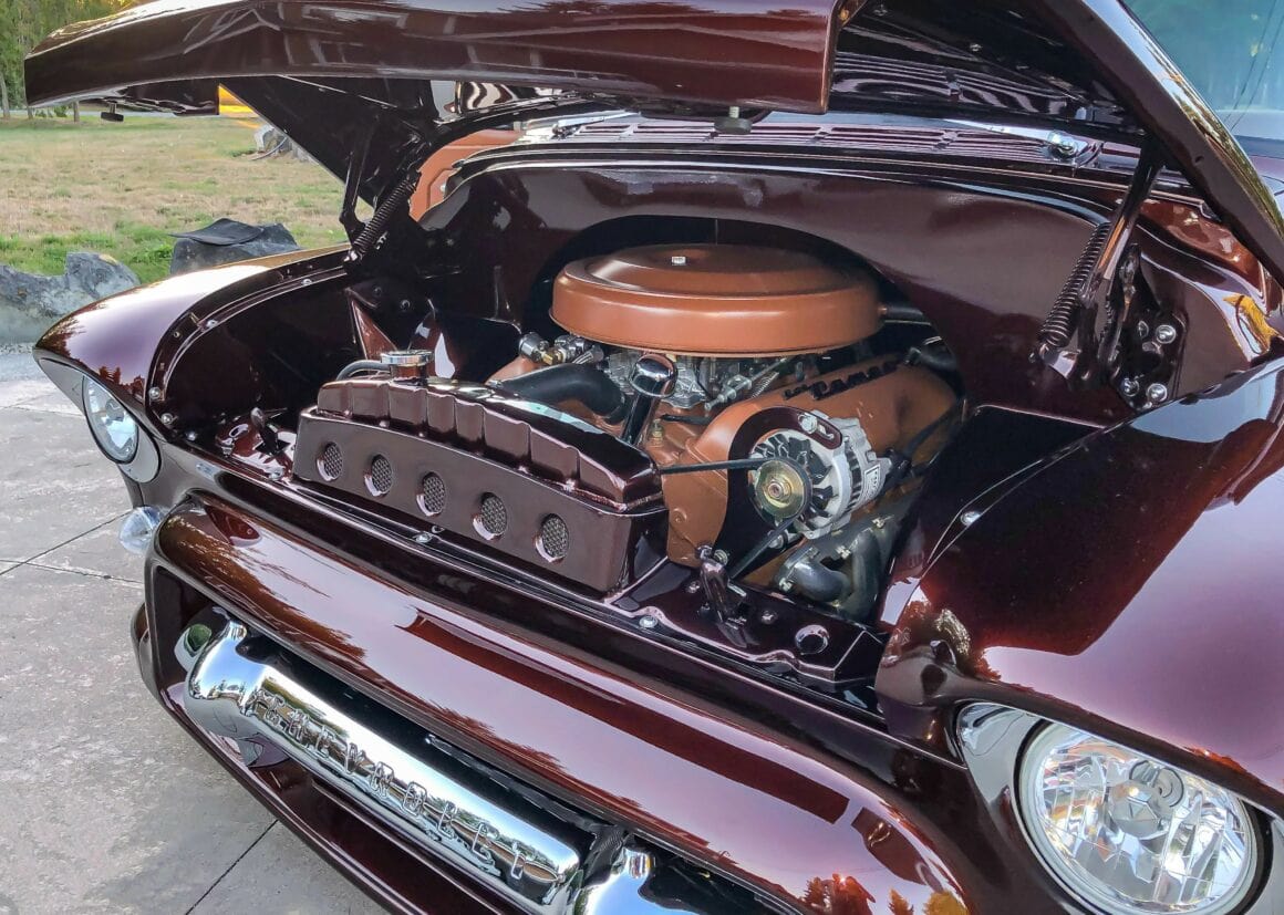 Tout d’abord, il y a la personnalisation des parois du Pick Up Cameo pour qu’elles s’intègrent parfaitement dans la cabine. Il y a une visière sur mesure pour suivre le contour de la cabine près du pare-brise. De nombreuses fabrications sur mesure ont été faites pour obtenir un look plus élégant. Toutes ces modifications sont attribuées à Nolan Hoffman et Mark Hoffman. De plus, des touches personnalisées aux montants des portes et au compartiment moteur ont contribué aux heures de carrosserie et de ponçage. En réalisant que les lumières de la cabine ont été retirées et remplies, vous pouvez voir que les modifications sont infinies. La peinture a été réalisée par Procraft Restoration de Duncan, en Colombie-Britannique, à l’aide de Custom House of Kolors, Rootbeer Tangerine. Les multiples couches de peinture et le ponçage sans fin donnent à ce camion une qualité de spectacle et une finition si profonde qu’on dirait que vous pouvez y tremper vos doigts. (Comme déjà écrit en Avant-Propos les apparentes griffures sur les flancs ensoleillés, est la réverbération du soleil dans les arbres qui se reflète sur la carrosserie)
