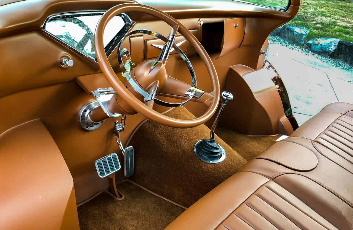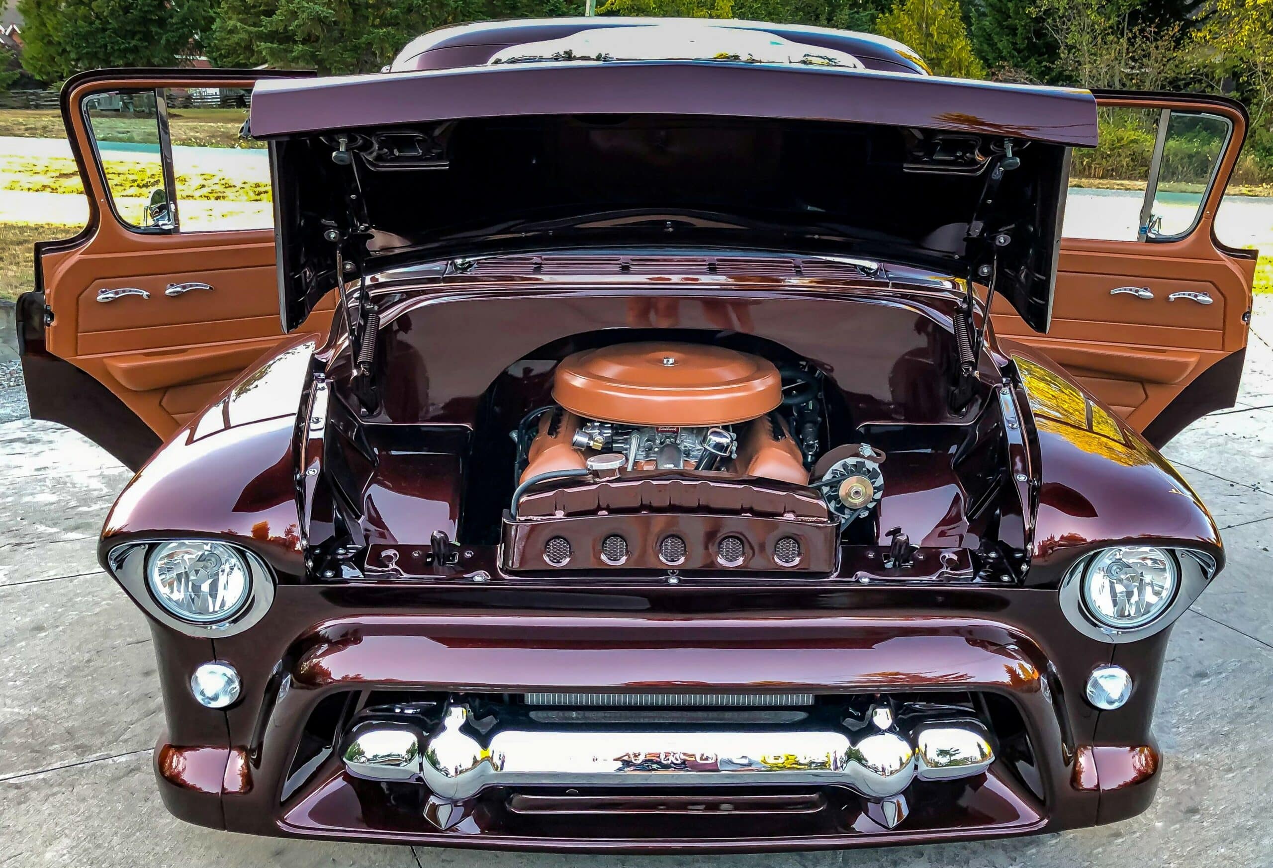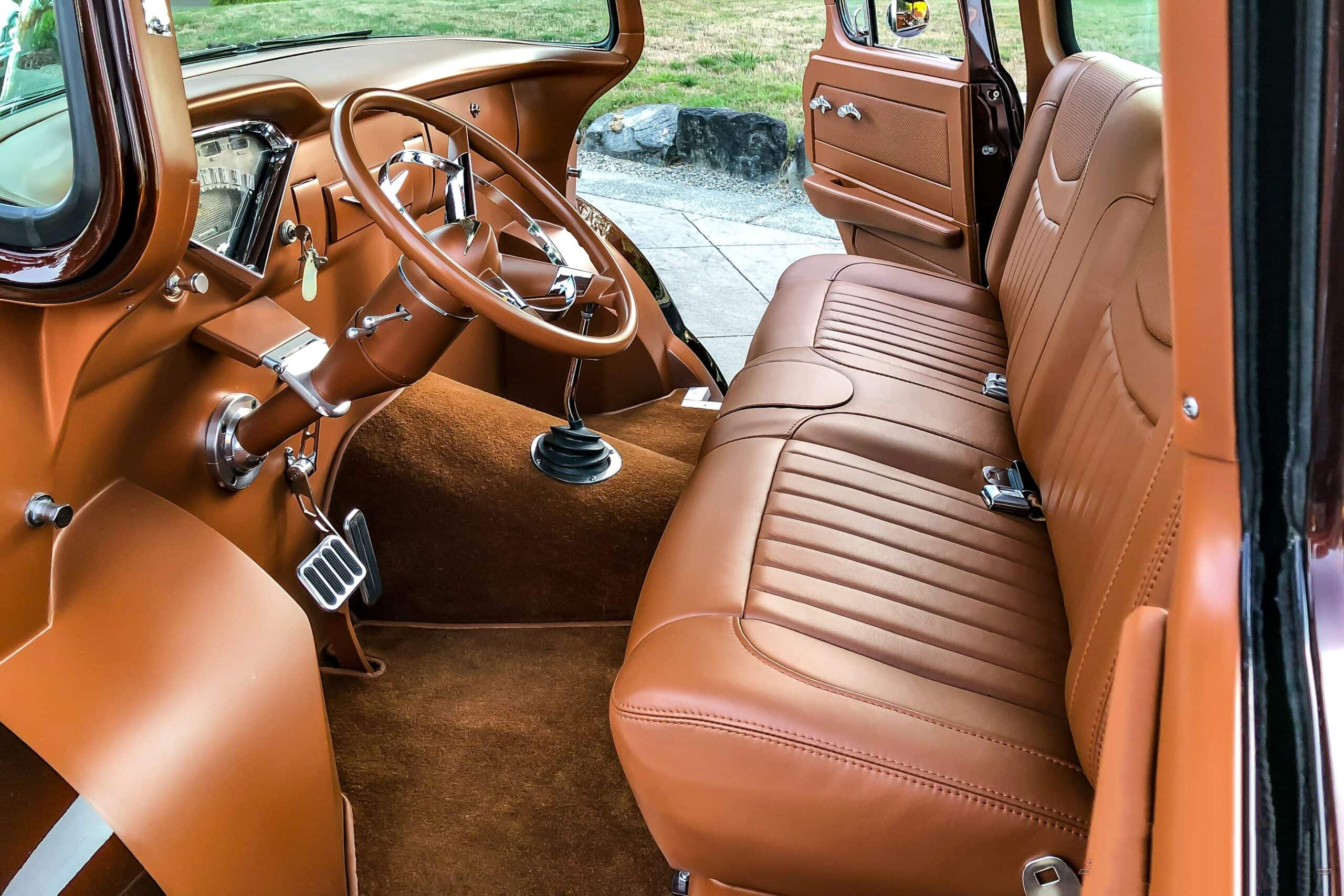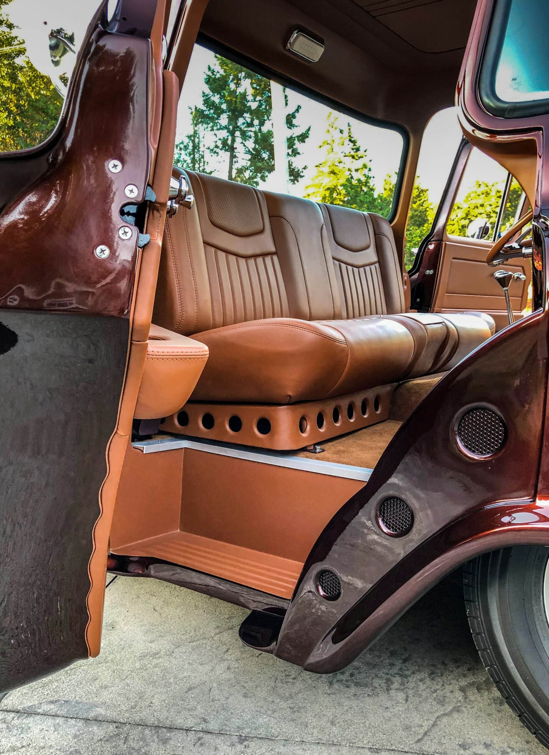 Gibbs a flashé sur un V9 472ci. Les doubles carburateurs Edelbrock aident à fournir de l’air et du carburant aux 510cv. Le pare-feu et le compartiment moteur ont été lissés pour faciliter l’installation du 409ci. La peinture et la fabrication à l’intérieur du compartiment moteur sont propres et minimalistes. Le moteur big bloc est boulonné à une transmission TCI Turbo 400 avec un convertisseur de couple de décrochage de 2800. À l’intérieur, l’intérieur qui n’a jamais été rêvé par quiconque a fouetté l’un de ces camions sur la route en 1955, a été modifié façon Rolls Royce par Geoff Horsfall, de Duncan, en Colombie-Britannique, qui a réalisé un job dans les détails extrêmement propre à l’intérieur en utilisant du cuir italien “cannelle”. Une colonne inclinable Flaming River avec une reproduction du volant Chevy 15″ de 56 aide Tug Boat à naviguer dans les virages. Un faisceau de câbles relie les éléments électriques, y compris les lumières LED. Le magnifique intérieur personnalisé de Geoff Horsfall de Duncan, en Colombie-Britannique, au Canada, offre une sensation étonnamment simple et chaleureuse.