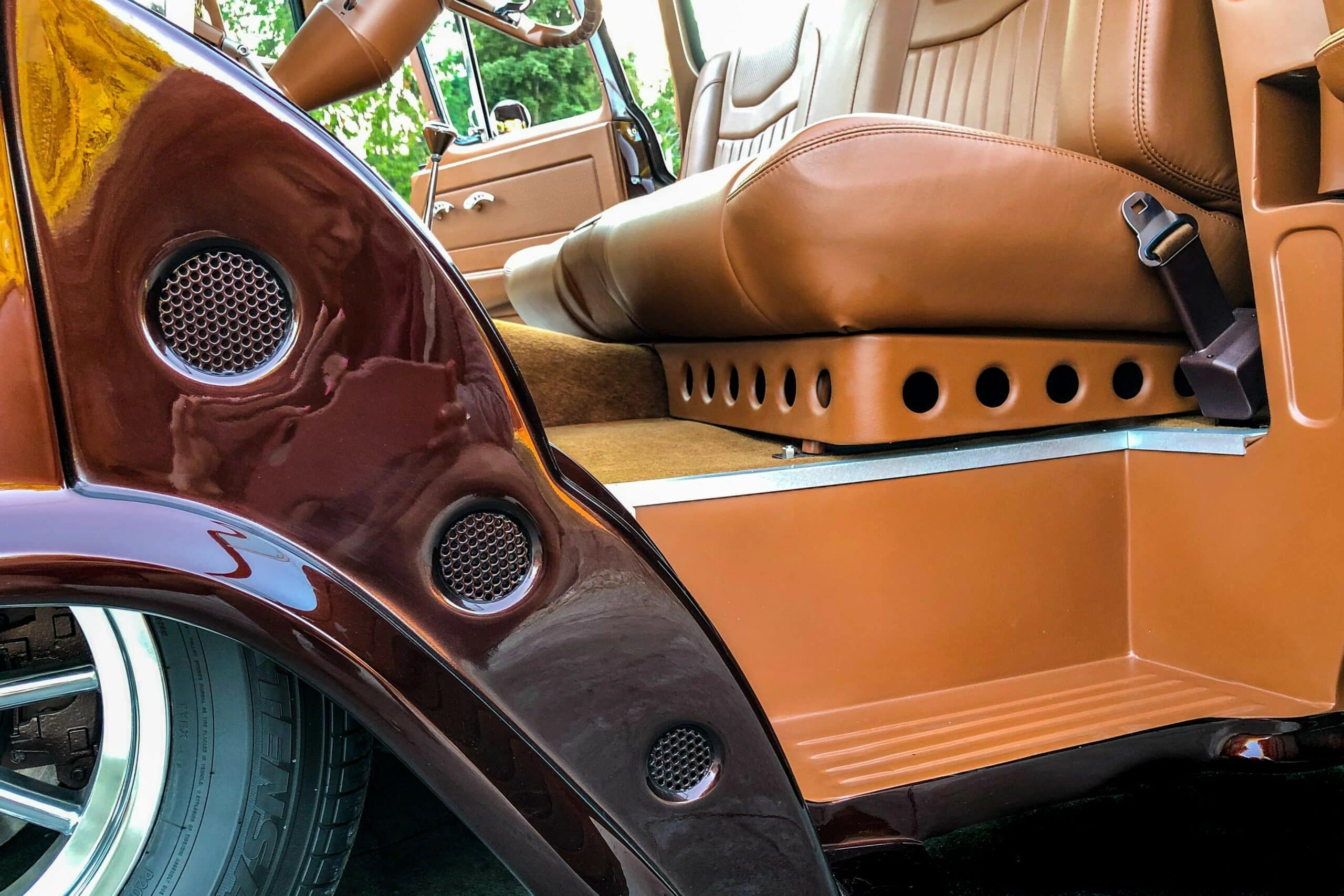 Les portes suicides sont un ajustement tueur. Pour être catalogué camion, vous devez avoir une plate-forme de camion, et l’espace de chargement façon Pick Up de Tug Boat est quelque chose que vous ne pouvez pas manquer. En utilisant du bois d’acajou africain, seize couches de Custom House of Kolor clear ont été posées sur les panneaux de bois pour créer une richesse profonde dans le bois. Le hayon n’a pas de chaînes ou de loquets pour aider à l’apparence lisse du camion. Avec ces boiseries, il y a de fortes chances que personne ne transporte une charge de gravier à l’arrière du remorqueur. Les ailes intérieures peintes en mandarine racine, brillent au soleil et nagent sans couture dans le lit en bois d’acajou après s’évaser pour couvrir les énormes pneus arrière. Les glissières polies entre les pièces de lit en bois créent une toile incroyable. Aucune doublure de lit de camion n’est requise ici… Ce qui distingue vraiment le remorqueur des autres constructions, c’est la carrosserie personnalisée. Il y a tellement de détails que beaucoup d’entre eux peuvent être facilement manqués.