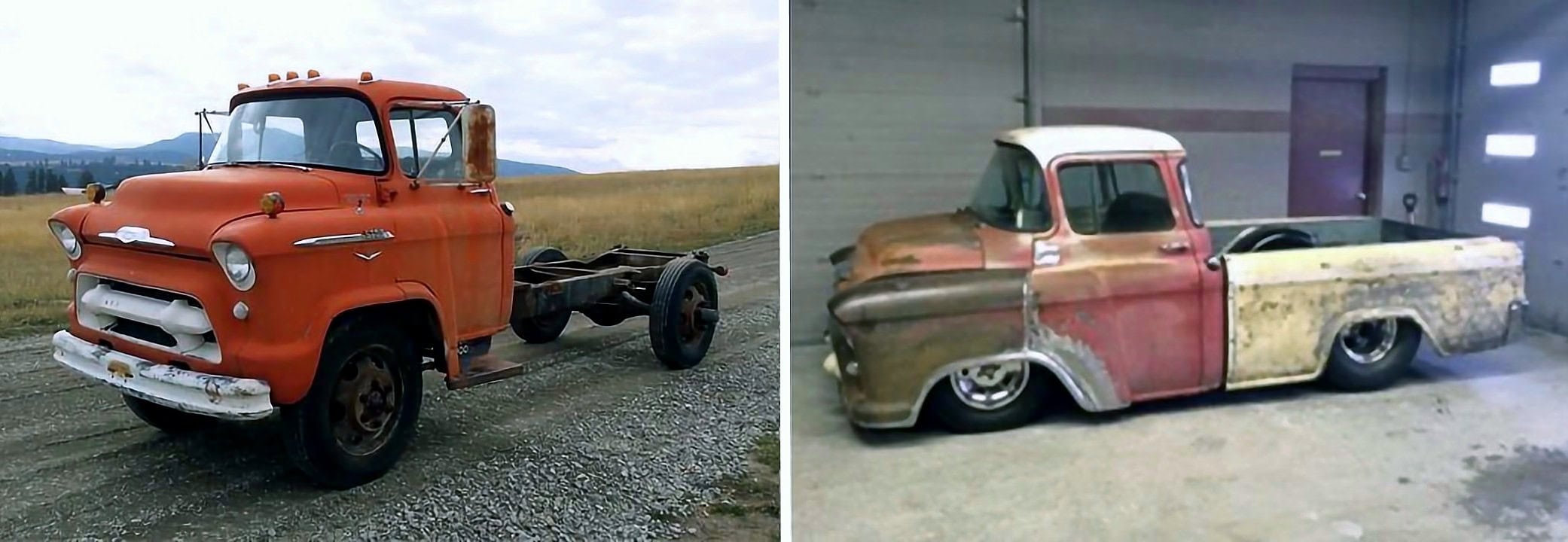 Ce “Remorqueur” a commencé son voyage dans le New Jersey. Avant que Darren n’achète la voiture, le nez retroussé de 1955 avait déjà été partiellement personnalisé mais inachevé. La cabine avait été modifiée pour s’adapter à une caisse de camion “Cameo”. Des tas de machins personnalisés ont été fabriqués pour abriter d’énormes pneus Hoosier 33 x 22,5 montés sur des jantes à l’ancienne. Des portes suicides personnalisées (et gigantesques) ont été installées, s’ouvrant “à l’ancienne” façon “Portes suicides”, mais le camion était loin d’être terminé. L’image de gauche ci dessous, montre à quoi ressemble un Chevrolet Snub Nose Cab Over de 1955. L’image de droite ci dessous bis est un projet commencé mais inachevé. Chaque Hot Rod doit commencer quelque part ; ce remorqueur a commencé sa vie personnalisée tout comme Bon Jovi, dans le New Jersey. Une inspection minutieuse des deux photos montre à quel point la personnalisation peut rendre fou et malade a eu lieu pour créer ce projet. Darren avait une vision de ce que pourrait être ce vieux camion à nez retroussé.