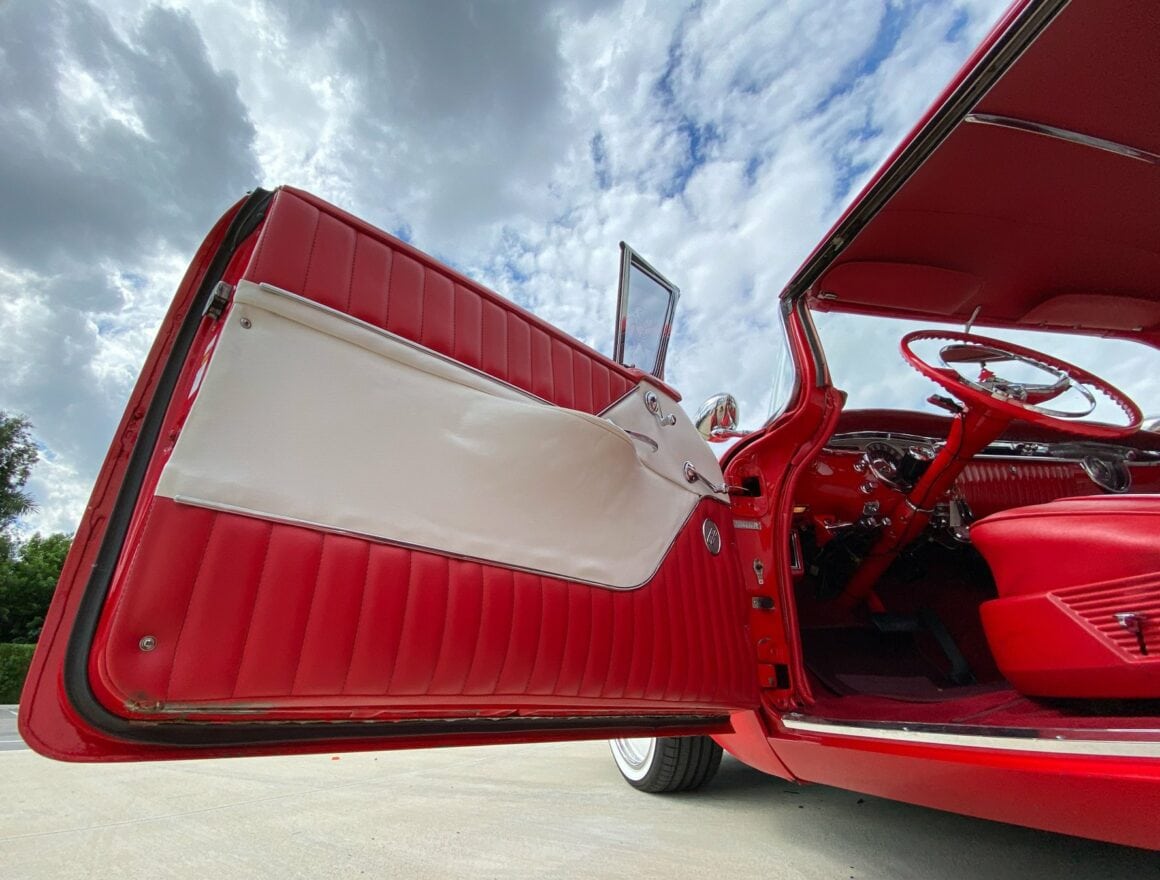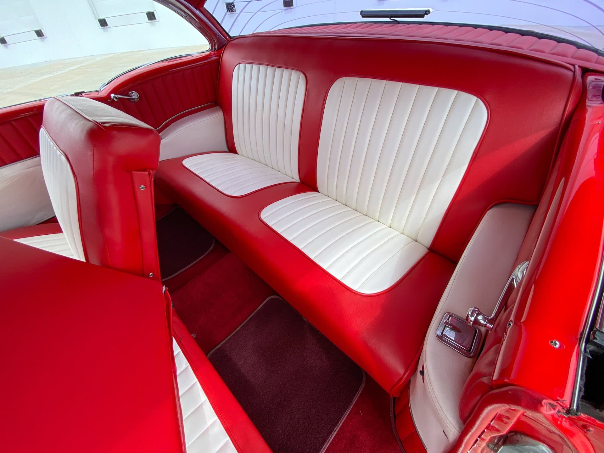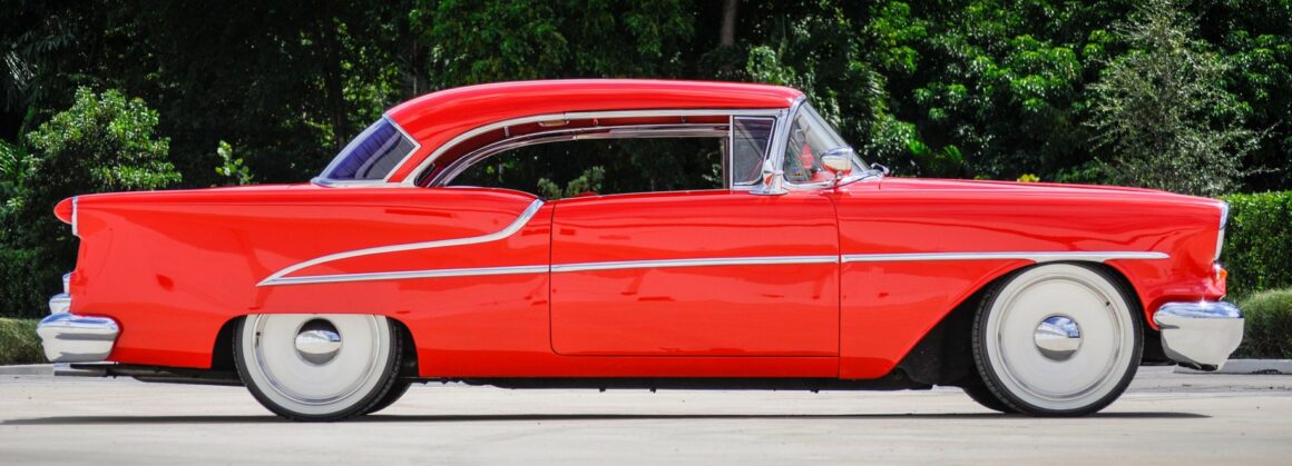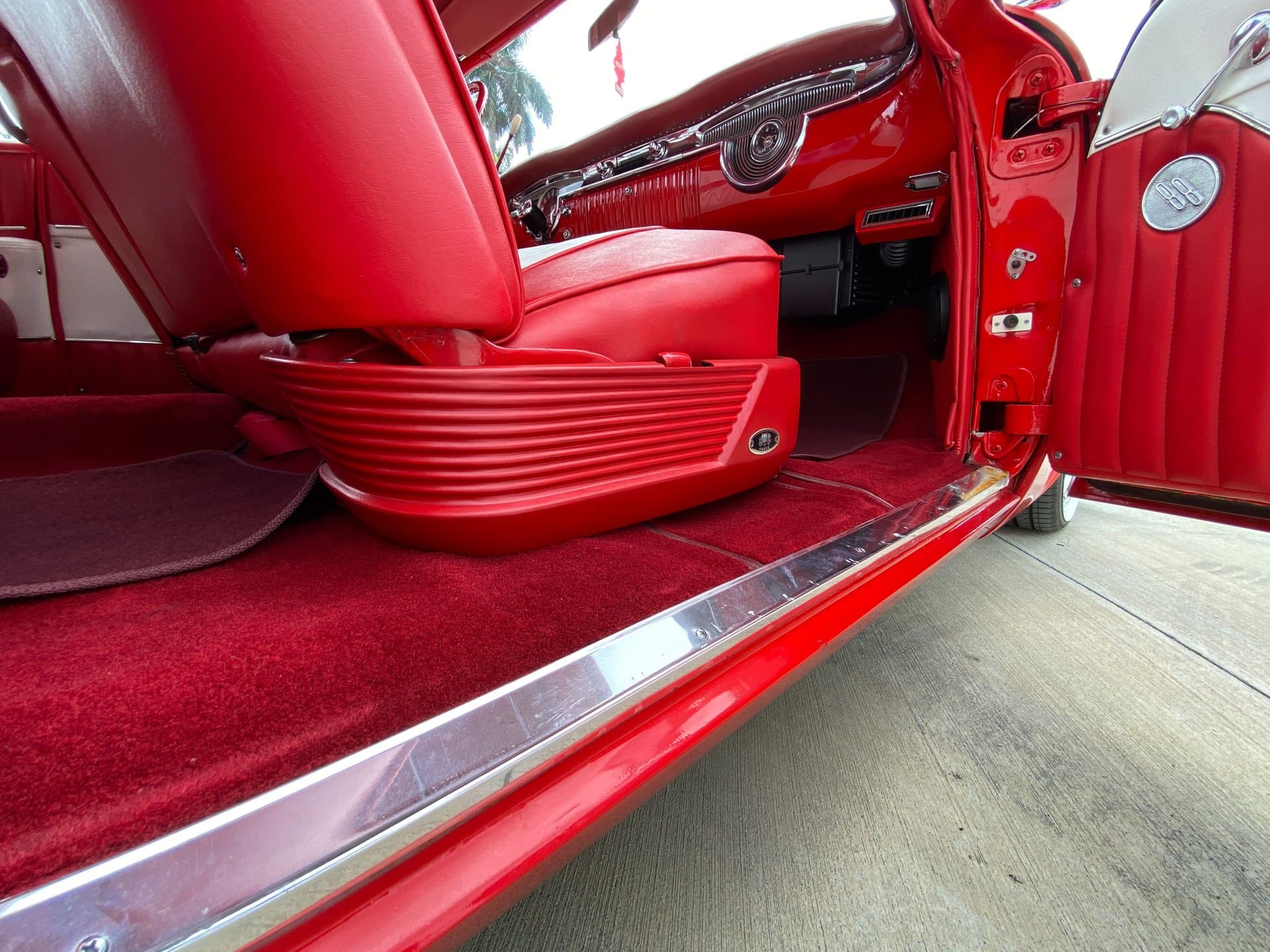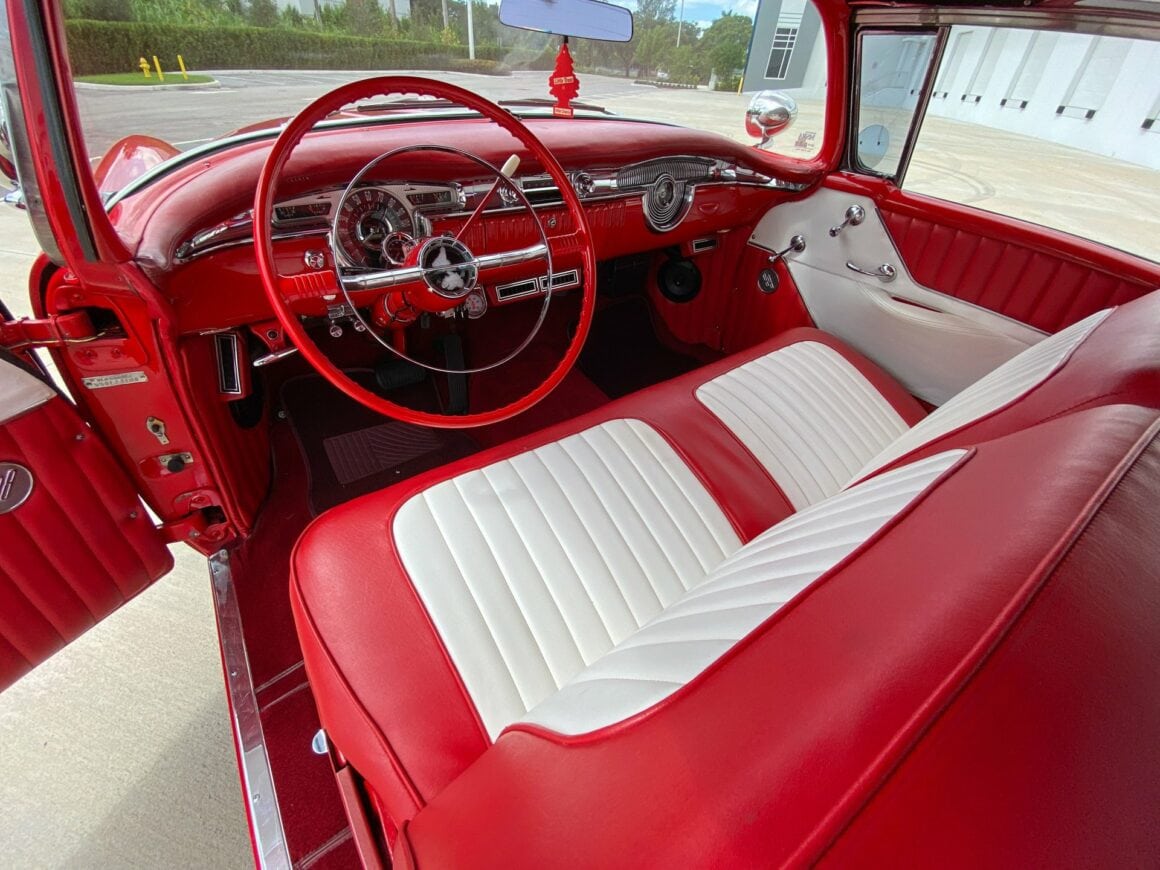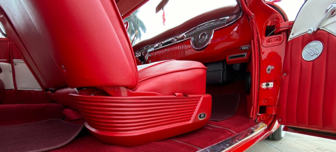 Vous avez tort et le tort tue car l’intérieur de la 1955 Oldsmobile Super 88 est aussi beau que l’extérieur ! Rouge et blanc tout du long et aussi en largeur XXL avec un joli tableau de bord rembourré. Pour compléter l’intérieur, il y a des lumières d’accentuation rouges partout. Dans la console centrale, vous trouverez des commandes de climatisation et de chauffage vintage, ainsi qu’une radio Alpine moderne qui sonne bien. Les sièges sont propres et sans imperfections. Prenez un moment pour détailler les photos ET lire mon texte AINSI QUE l’historique compleT…