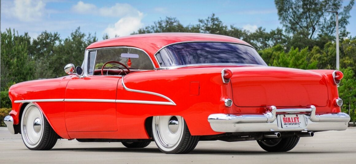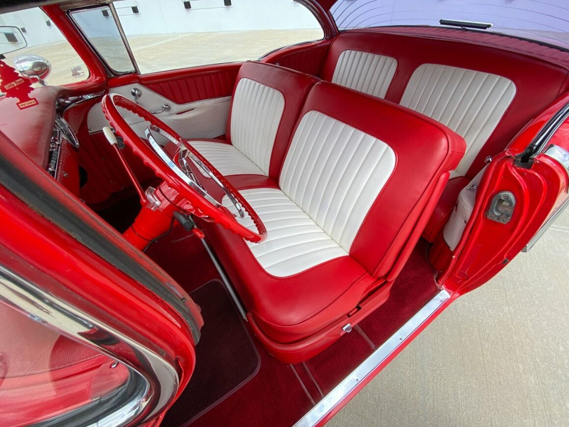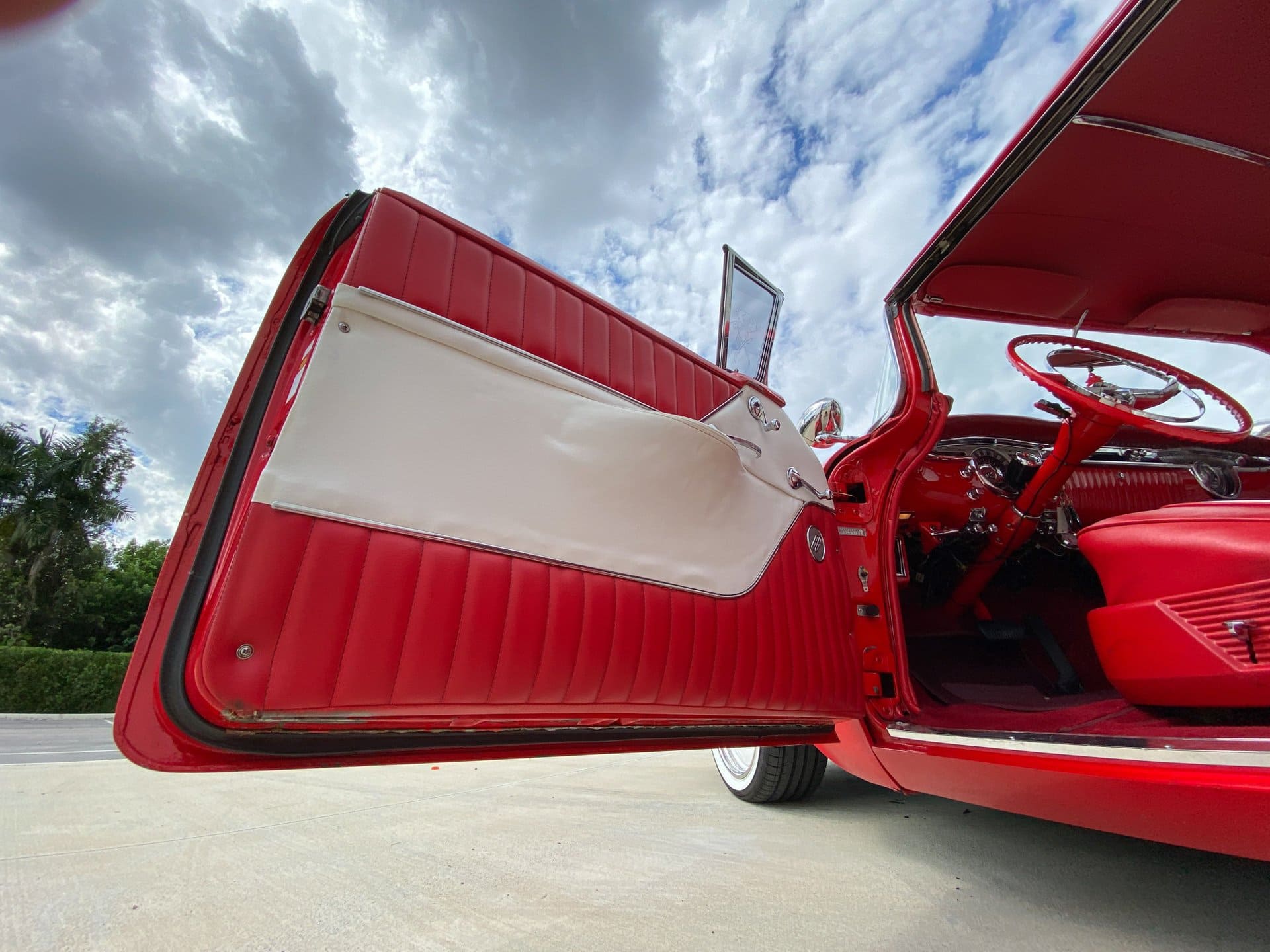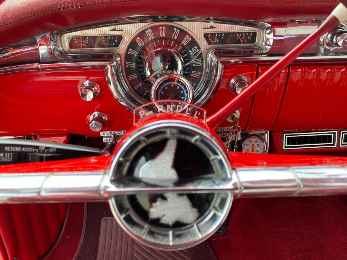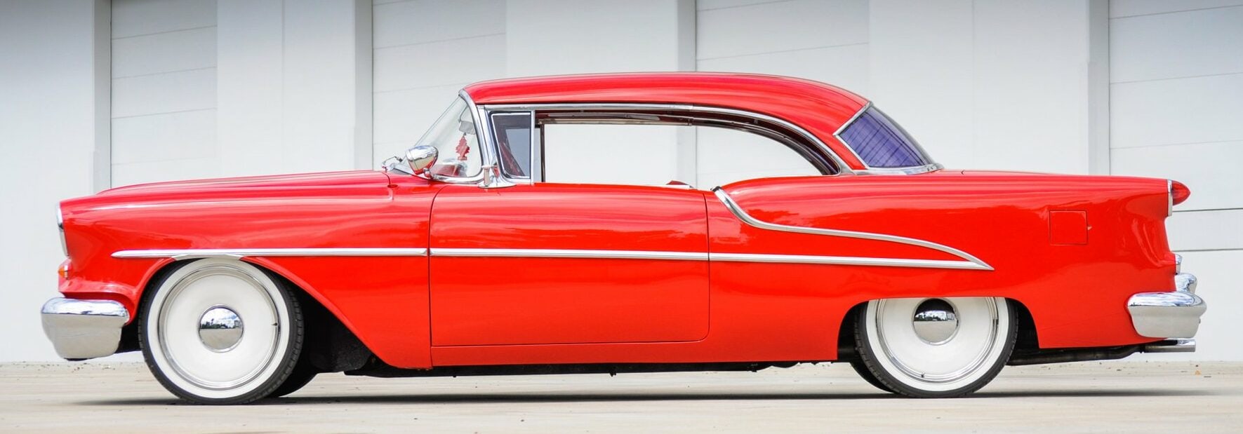 Vous avez tort et le tort tue car l’intérieur de la 1955 Oldsmobile Super 88 est aussi beau que l’extérieur ! Rouge et blanc tout du long et aussi en largeur XXL avec un joli tableau de bord rembourré. Pour compléter l’intérieur, il y a des lumières d’accentuation rouges partout. Dans la console centrale, vous trouverez des commandes de climatisation et de chauffage vintage, ainsi qu’une radio Alpine moderne qui sonne bien. Les sièges sont propres et sans imperfections. Prenez un moment pour détailler les photos ET lire mon texte AINSI QUE l’historique compleT…