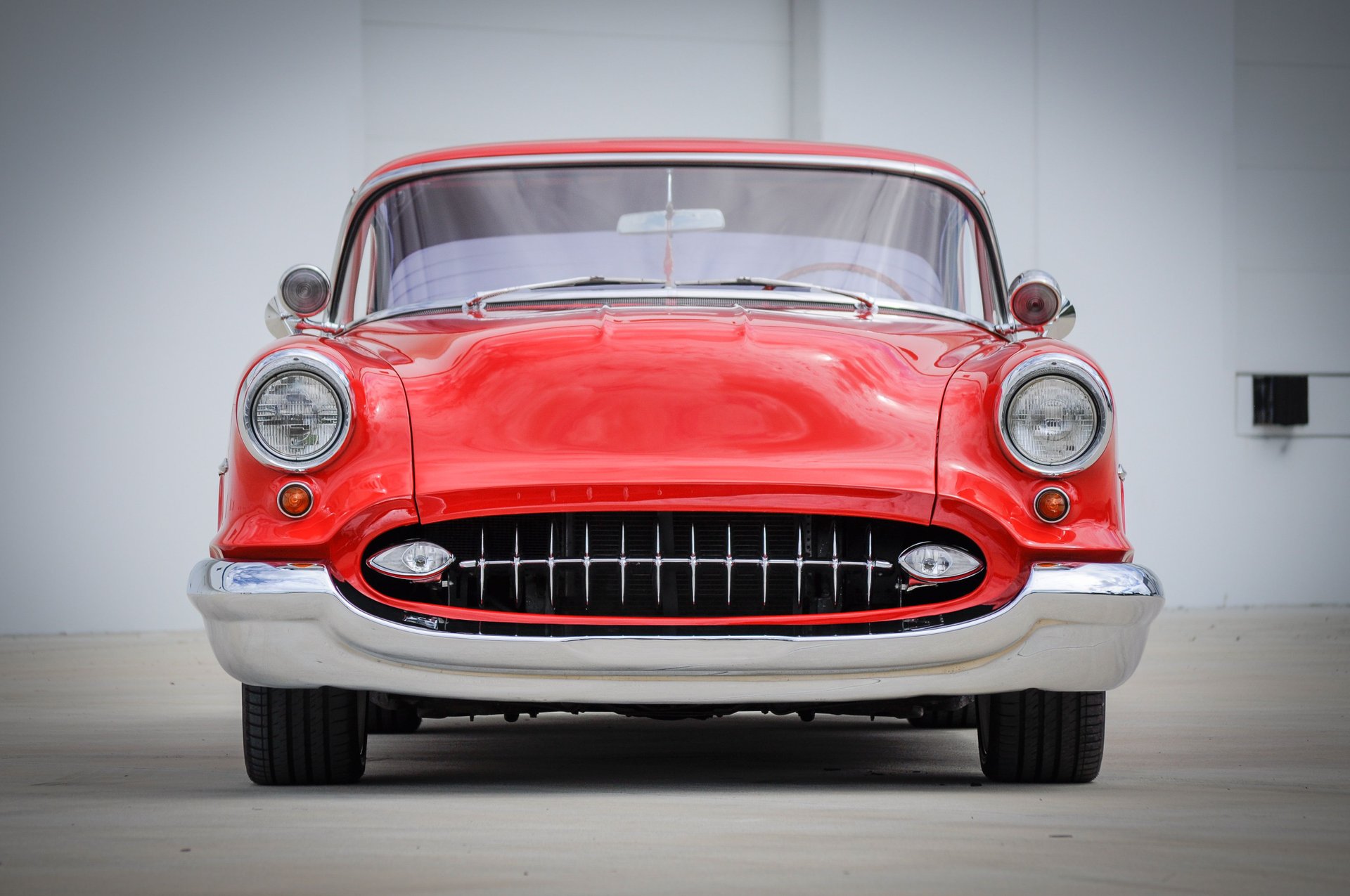 Un écusson “monde” révisé et l’ornement “fusée” ornaient un nouveau capot mis en évidence par deux nervures surélevées situées au centre au lieu d’une. Les passages de roue avant et les jupes d’ailes arrière qui avaient été équarries pour les Super 88 1954 sont devenus un design gracieux, arrondi et balayé vers l’arrière pour 1955. Les formes suivaient celles du cabriolet Ninety-Eight Starfire de 1954 et reprenaient les passages de roue du coupé Ninety-Eight Deluxe Holiday.