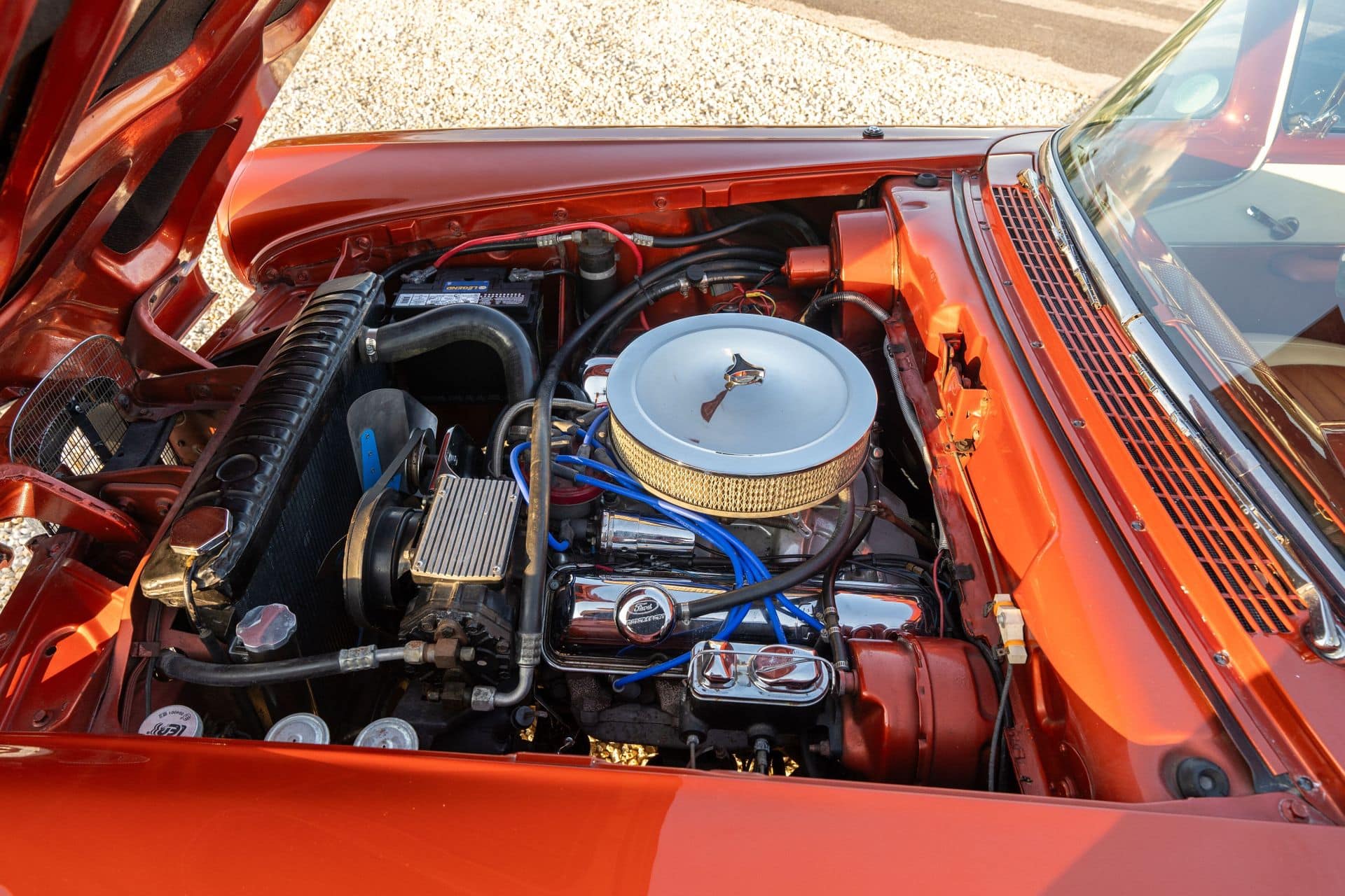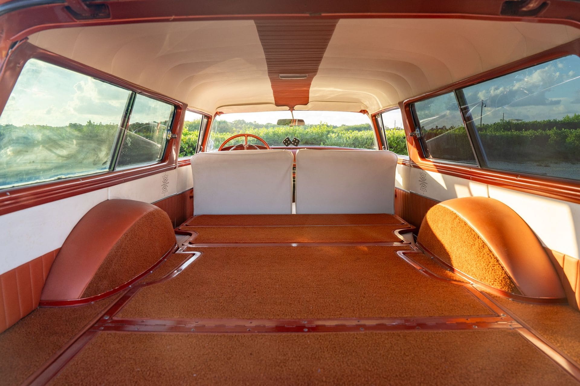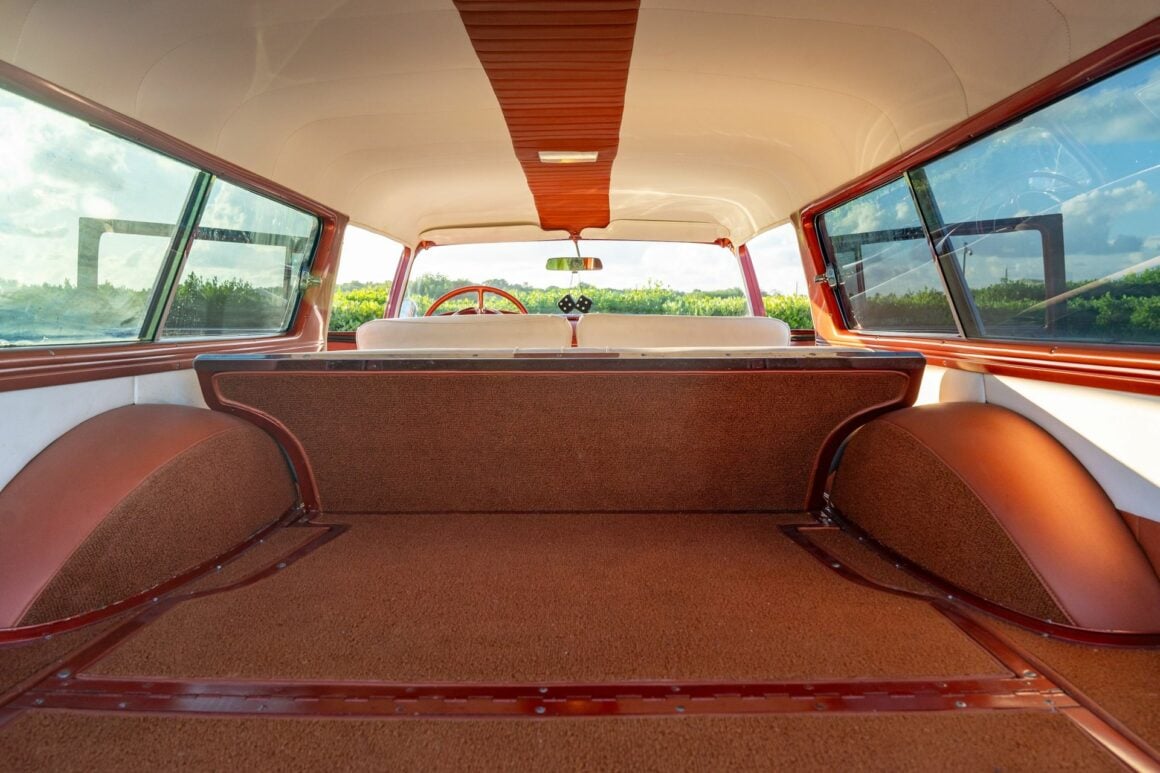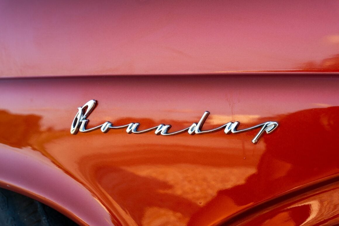 Les poignées ont été rasées, les emblèmes “Roundup” ont été laissés sur les ailes avant et les passages des roues arrière ont été recouverts de jupes d’ailes de style “cruiser”. La sellerie en vinyle bicolore orange et blanc est d’époque et de style Barris, avec des inserts plissés. L’état de la sellerie, de la moquette, de la garniture de toit et des garnitures intérieures sont excellents et tout fonctionne, les compteurs, les vitres/serrures électriques l’air conditionné et le chauffage ainsi que le système audio CD Jensen AM/FM. Le tableau de bord et le volant ont été peints de la couleur de la carrosserie.