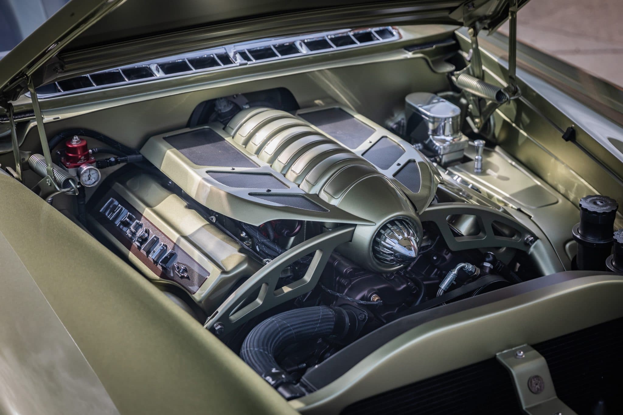 Le châssis Schwartz Performance G-machine comprend udes trains roulant sophistiqués fournis par Ridetech, une direction à pignon et crémaillère électrique et une suspension arrière et un différentiel indépendants issus d’une Viper 2009. C’est un Chrysler V8 Hemi 6L1 de 2009 qui a été installé couplé à une transmission automatique Chrysler à quatre vitesses. Des tuyaux d’échappement en acier inoxydable alimentent les silencieux Flowmaster. Des étriers de freins monoblocs Raybestos à quatre pistons saisissent chacun leurs disques ventilés !.