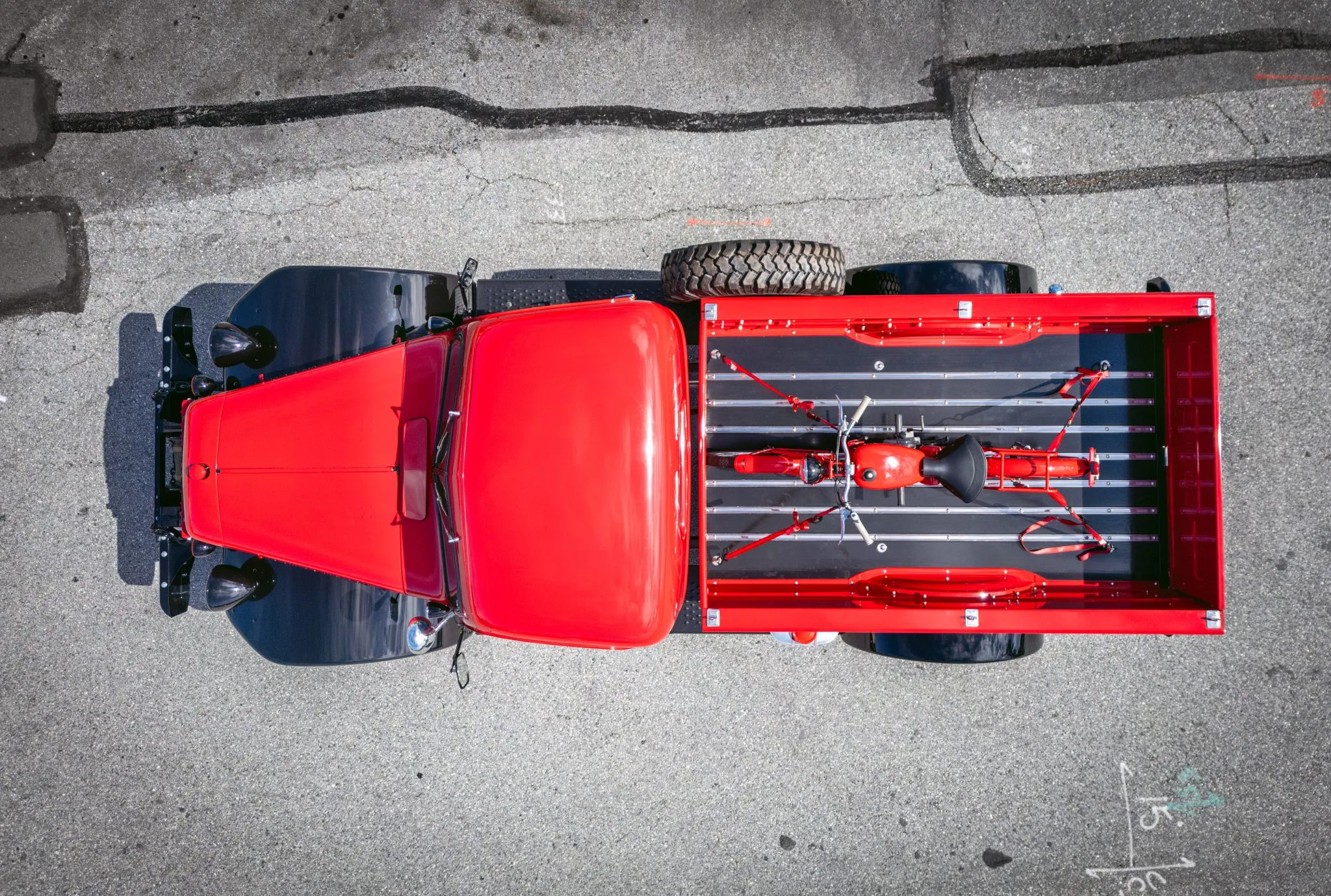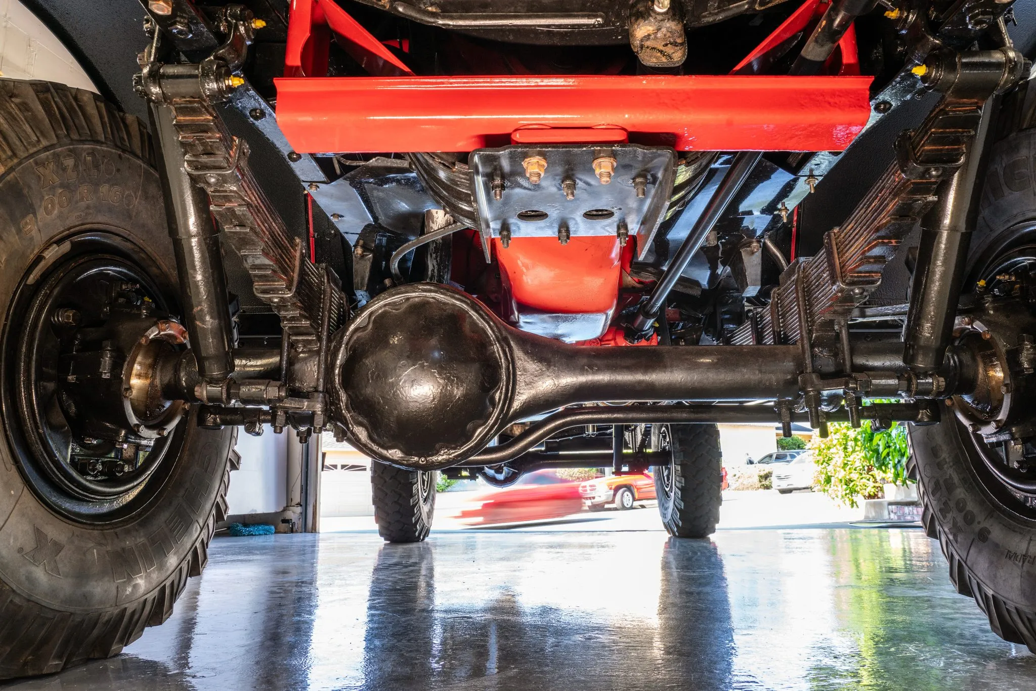 Tout le “bazar” étant connecté à une transmission manuelle T19 à 4 vitesses avec une boîte de transfert “divorcée” NP205 avec commande à double manche. (seuls les manches authentiques comprendront que je les vise). Les freins à pignons Wilwood se trouvent sur l’avant et l’arrière à destination des puristes, les autres, plus raffinés de payent des freins à disques assistés à chaque roue.