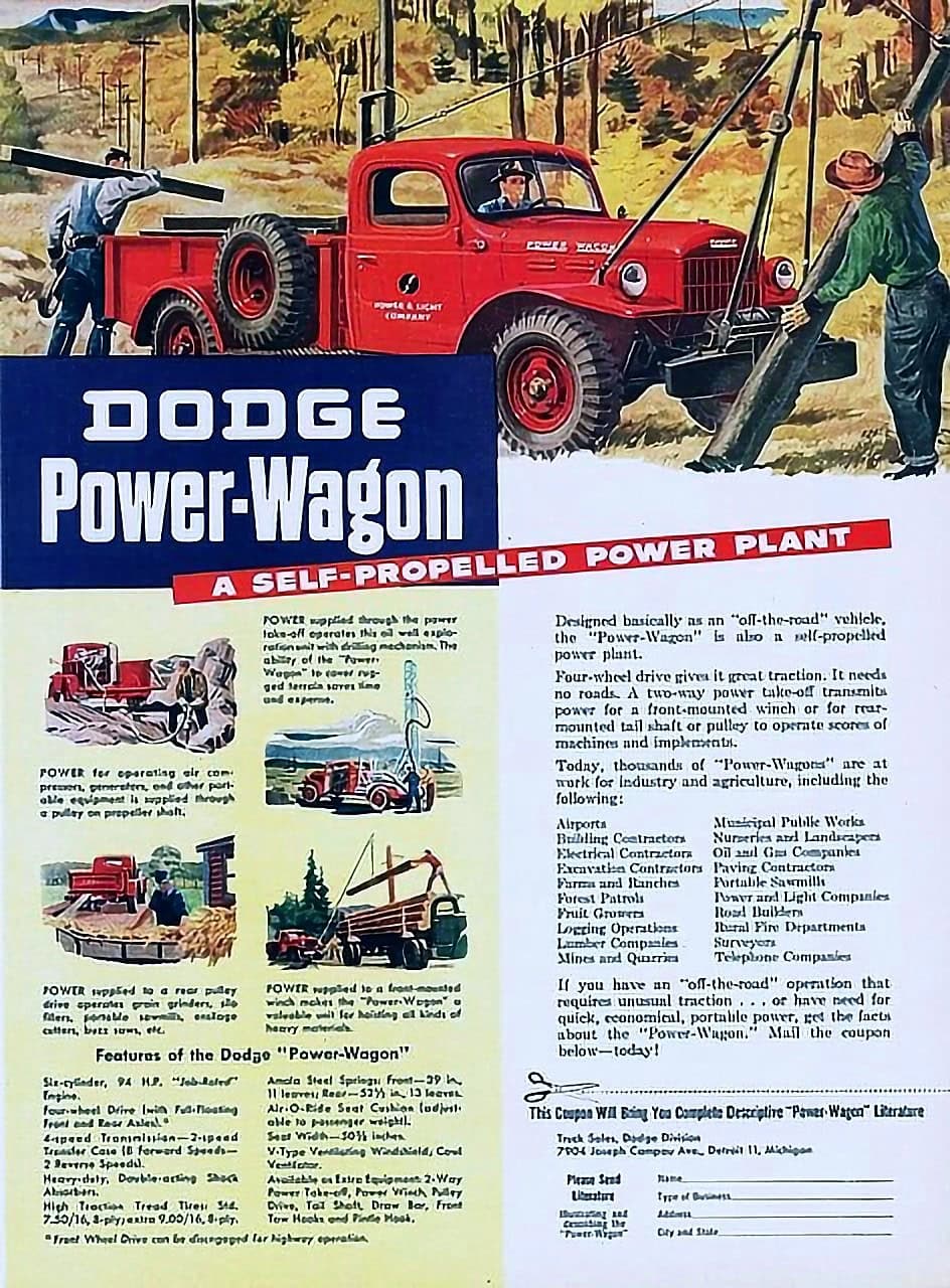 C’était une évidence de se tourner vers la nouvelle version civile de ce cheval de bataille à quatre roues motrices qu’ils connaissaient si bien pour la prochaine grande tâche de reconstruire leur nation et leur vie et de revigorer les industries de l’Amérique. Malheureusement, le Dodge Power Wagon a été abandonné en 1980 (la célèbre plaque signalétique a été réintroduite sous la marque Ram Truck en 2005).