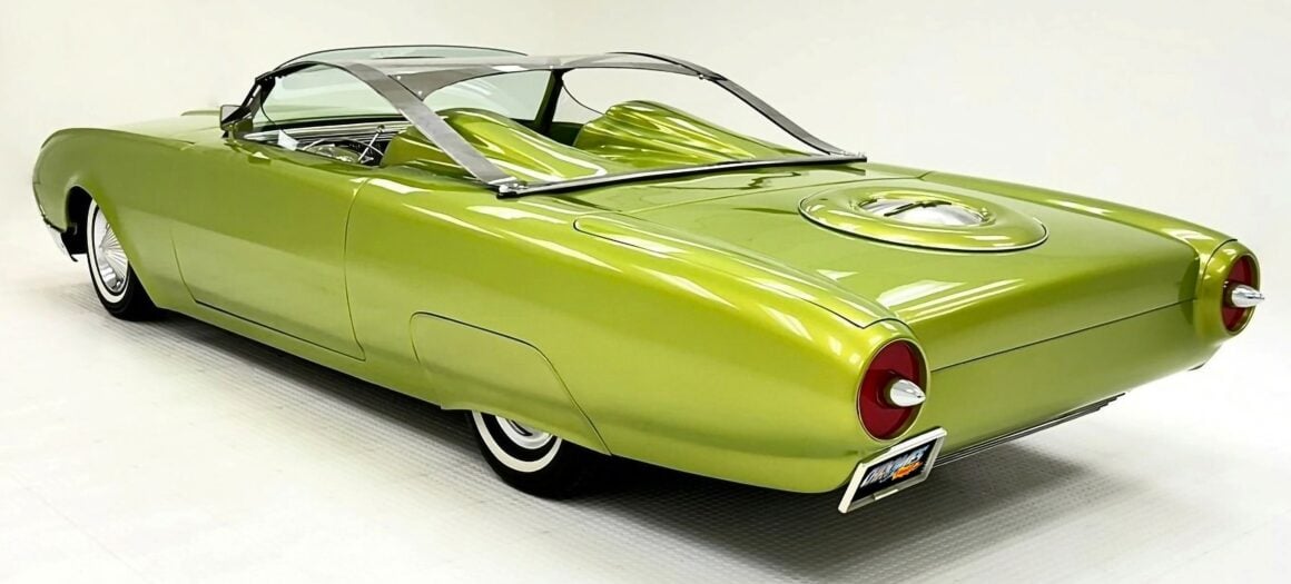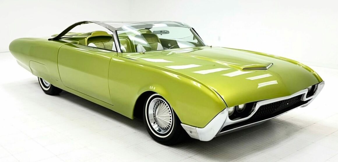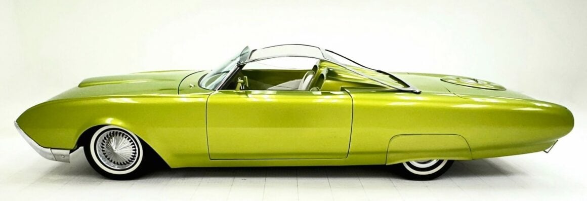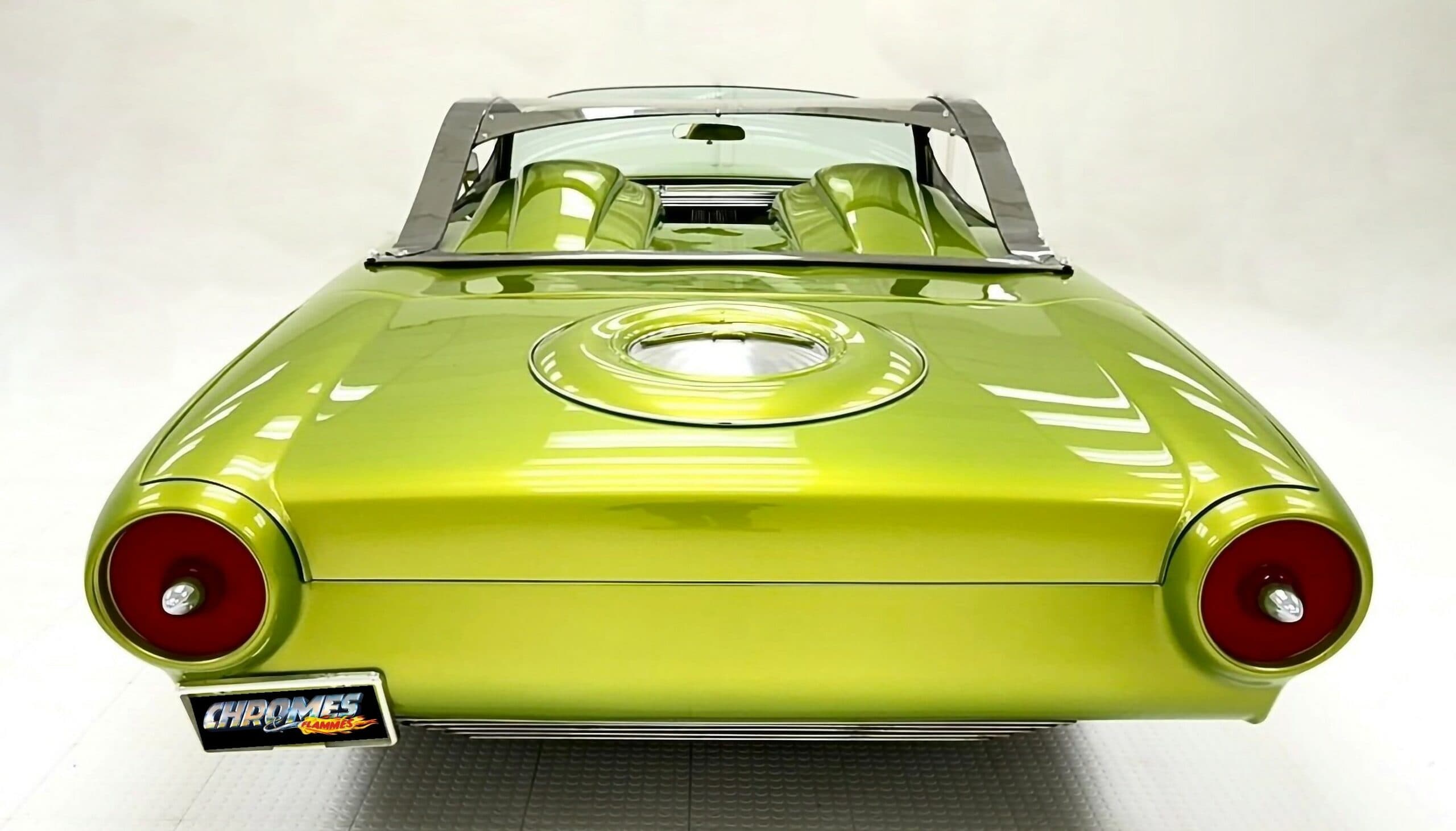 Voici une “Flintstone”, une Ford Thunderbird de 1962 hautement modifiée esthétiquement, mais qui est toujours reconnaissable comme une Thunderbird, quoique très, très loin de sa configuration d’origine. Elle a remporté de nombreux prix Best of Show et ce n’est pas une surprise. Entrons dans le vif du sujet… C’est la bagnole du jour et ça va vous changer des Hot Rod’s… Les lignes douces et la finition de cette voiture sont frappantes. La peinture de haute qualité est profonde et porte bien son nom d’Antifreeze Green Metallic. Et comme l’antigel, il a une lueur dedans… Chaque centimètre de la voiture a été personnalisé d’une manière ou d’une autre, y compris l’avant où la calandre chargée de la Thunderbird originale a été comme “nettoyée” avec les bords de capot redressés pour former “un front” au-dessus des phares. Mais il y en a assez ici pour reconnaître ses origines. Fini les pièces de garniture métalliques qui chevauchent le haut de l’aile à côté du capot. Tout a été fondu dans un flux continu de vert et il ne reste aucun emblème ou garniture.