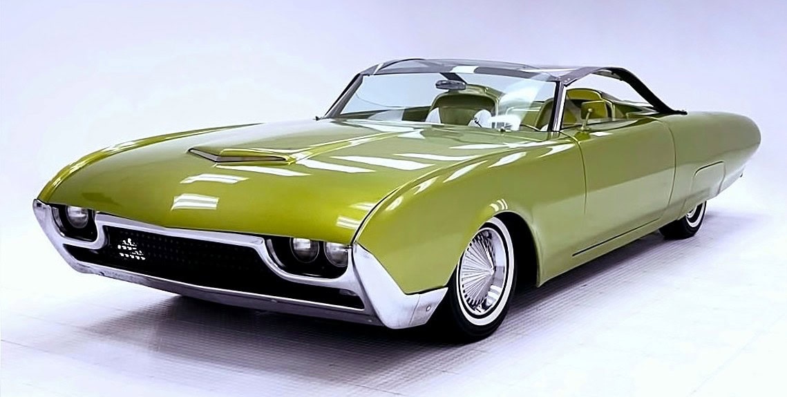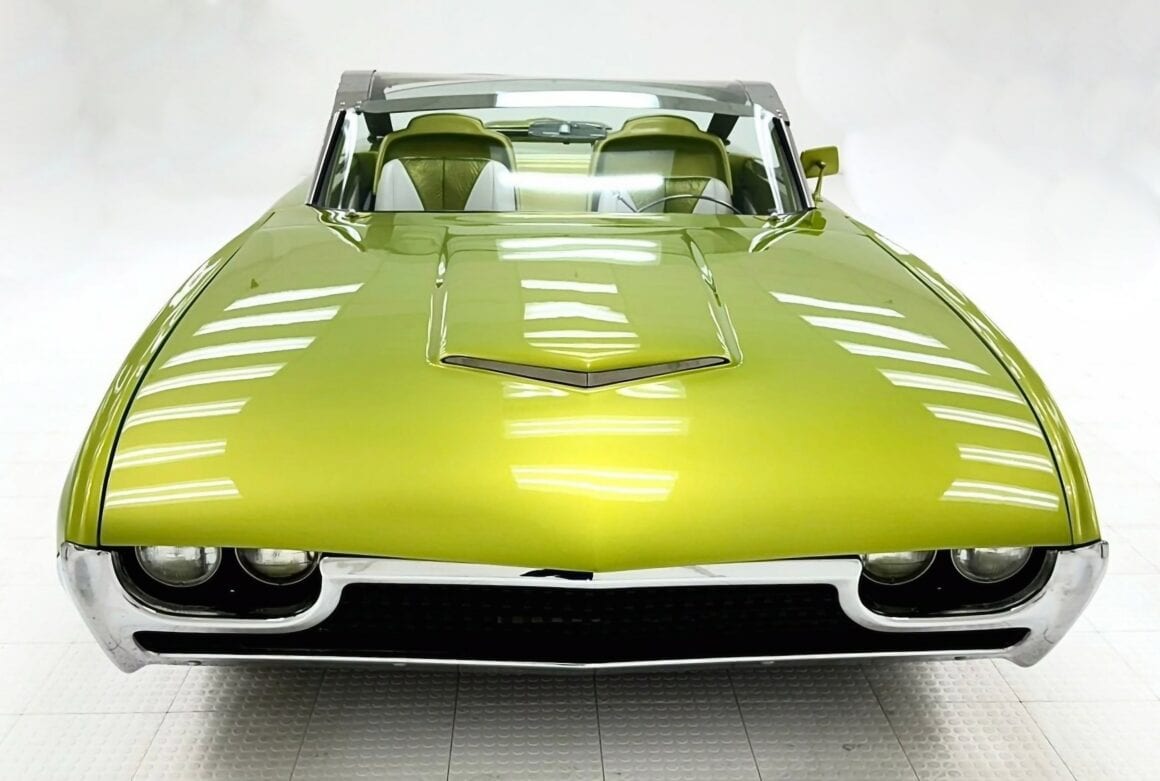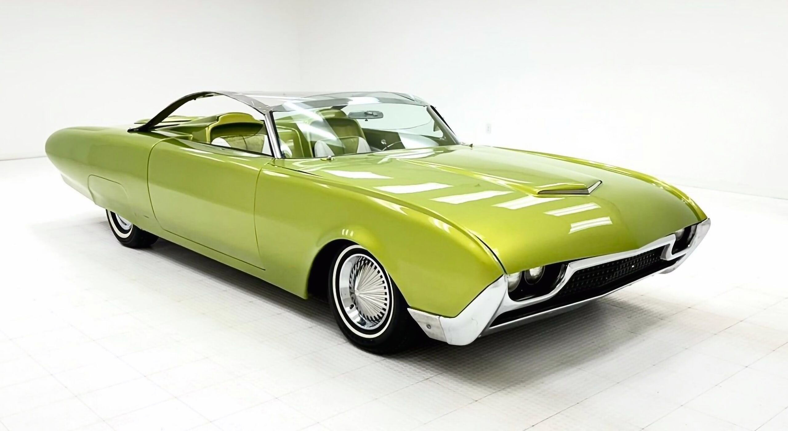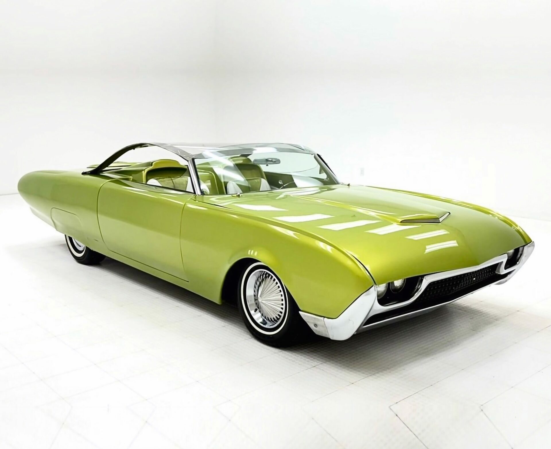 Voici une “Flintstone”, une Ford Thunderbird de 1962 hautement modifiée esthétiquement, mais qui est toujours reconnaissable comme une Thunderbird, quoique très, très loin de sa configuration d’origine. Elle a remporté de nombreux prix Best of Show et ce n’est pas une surprise. Entrons dans le vif du sujet… C’est la bagnole du jour et ça va vous changer des Hot Rod’s… Les lignes douces et la finition de cette voiture sont frappantes. La peinture de haute qualité est profonde et porte bien son nom d’Antifreeze Green Metallic. Et comme l’antigel, il a une lueur dedans… Chaque centimètre de la voiture a été personnalisé d’une manière ou d’une autre, y compris l’avant où la calandre chargée de la Thunderbird originale a été comme “nettoyée” avec les bords de capot redressés pour former “un front” au-dessus des phares. Mais il y en a assez ici pour reconnaître ses origines. Fini les pièces de garniture métalliques qui chevauchent le haut de l’aile à côté du capot. Tout a été fondu dans un flux continu de vert et il ne reste aucun emblème ou garniture.