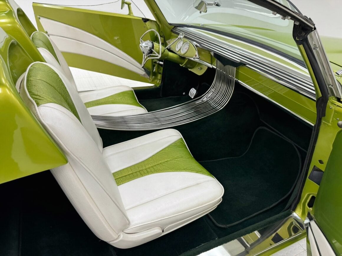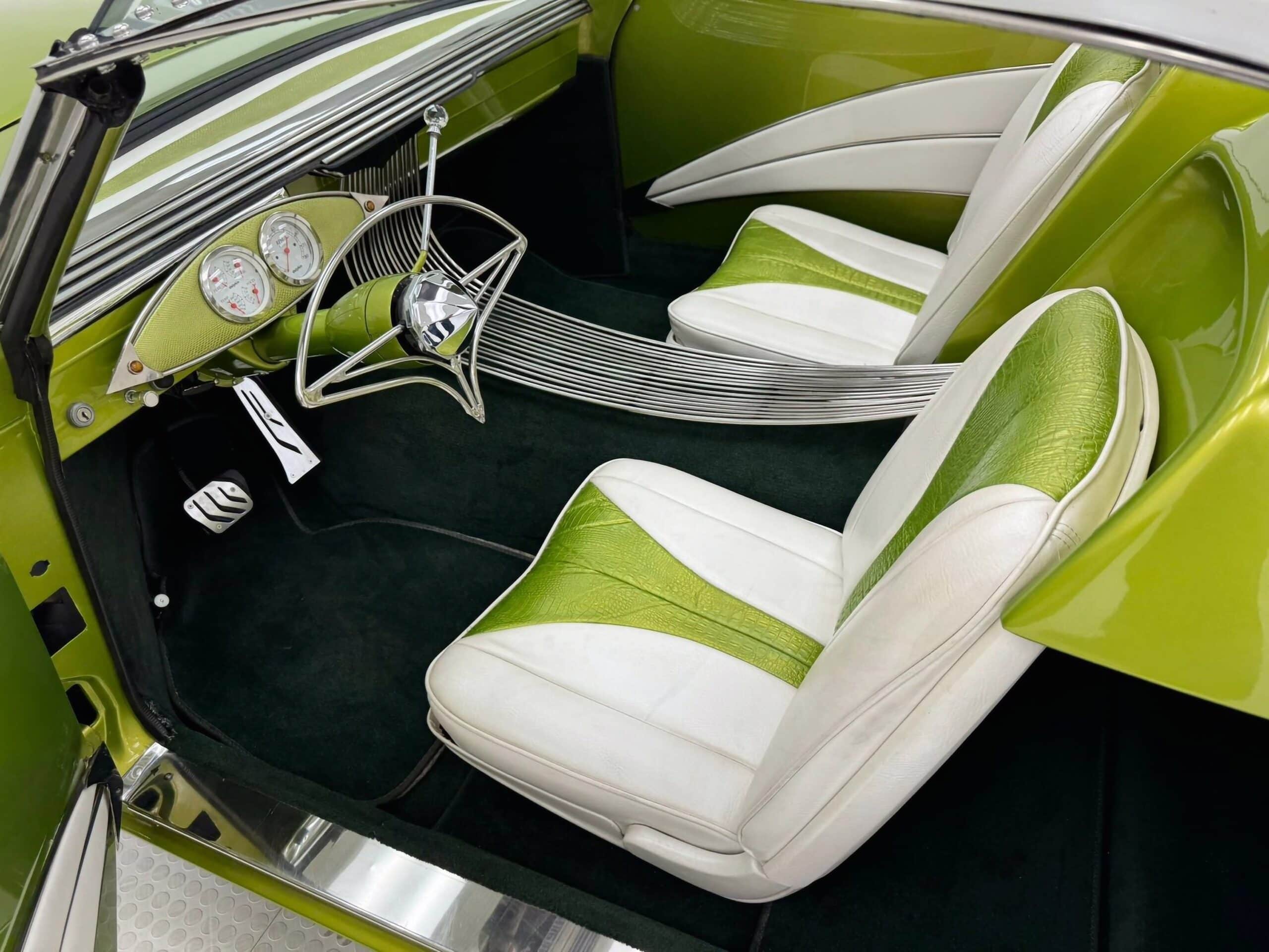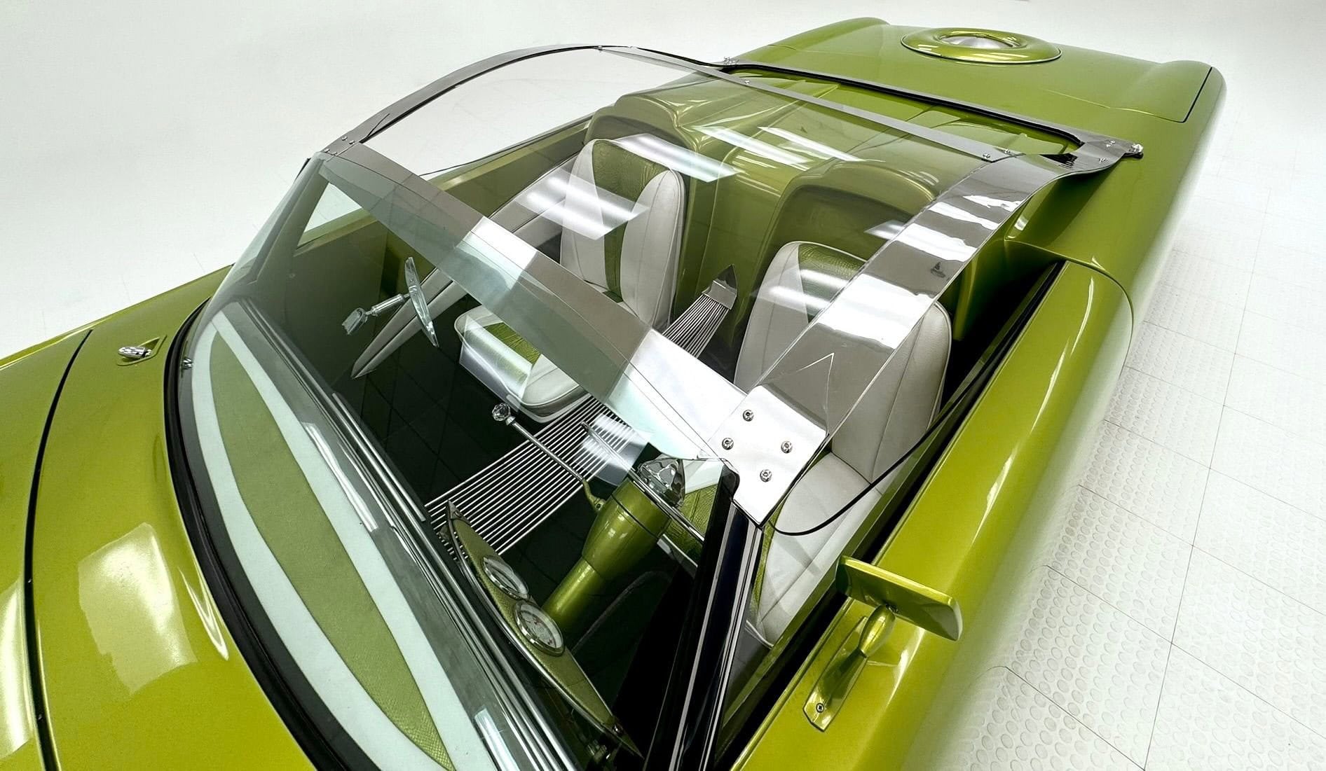 Le volant est un incroyable design en forme de croissant qui ne ressemble à rien de ce que quiconque à jamais vu… et en son centre se trouve un grand bijou chromé. La nacelle des compteurs est une sculpture autonome avec un support à motif de peau de serpent de teinte verte abritant deux compteurs Dolphin à face blanche et aiguilletée rouge. Le tableau de bord en métal déverse (dégouline) d’une console centrale qui tombe en cascade avec une série de tiges métalliques qui semblent “couler” entre les siège. C’est du pur spectacle, il n’y a pas de boutons, d’interrupteurs, de porte-gobelets ou quoi que ce soit d’autre sur la console. C’est tout simplement une œuvre d’art barnumnesque Californienne d’un goût discutable et d’ailleurs fort controversé. Un tapis vert à poils ras recouvre le sol où l’on trouve des pédales qui ont des plaques métalliques uniques avec des motifs en relief à l’intérieur. Le bloc moteur et les caches-soupapes sont peints en rouge vif pour faire hurler les amateurs de bon goût…