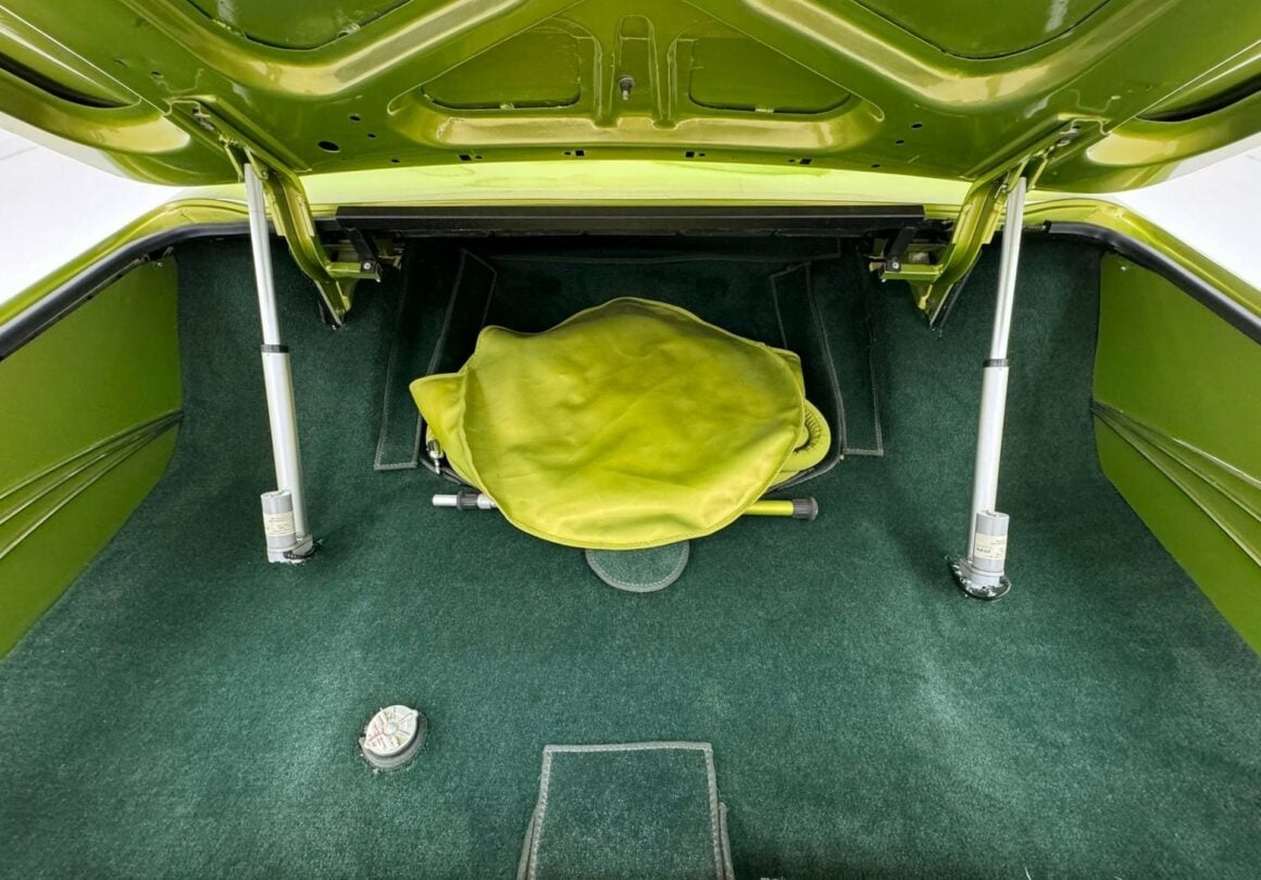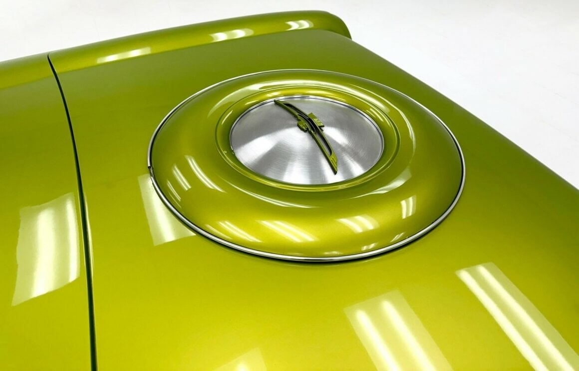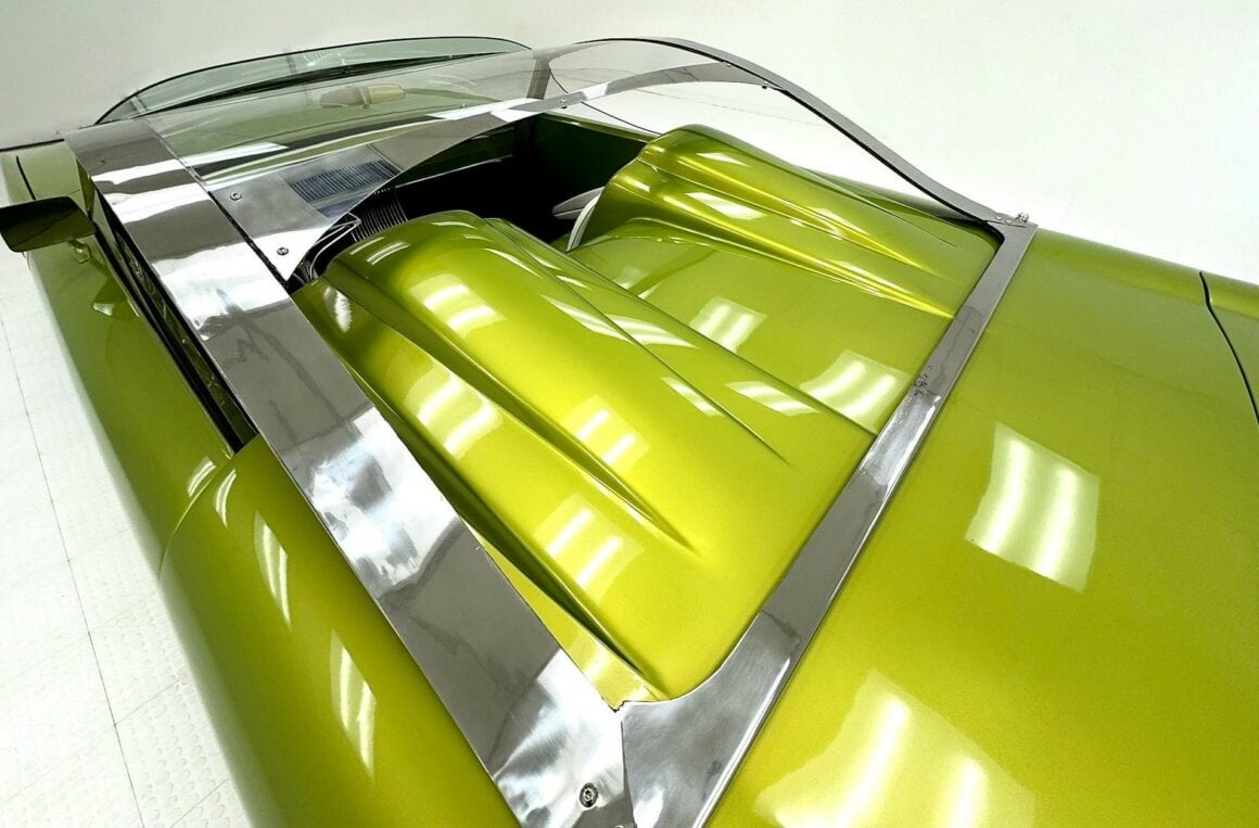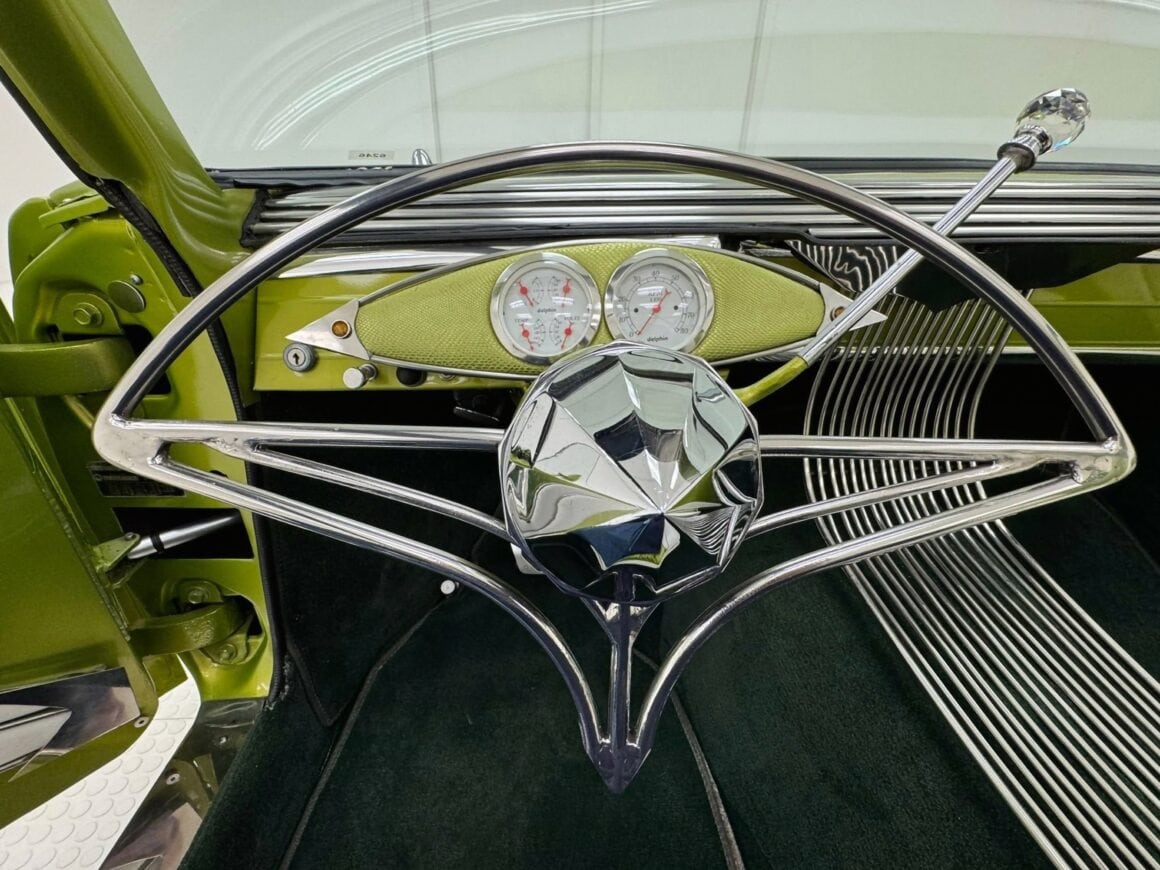 Le volant est un incroyable design en forme de croissant qui ne ressemble à rien de ce que quiconque à jamais vu… et en son centre se trouve un grand bijou chromé. La nacelle des compteurs est une sculpture autonome avec un support à motif de peau de serpent de teinte verte abritant deux compteurs Dolphin à face blanche et aiguilletée rouge. Le tableau de bord en métal déverse (dégouline) d’une console centrale qui tombe en cascade avec une série de tiges métalliques qui semblent “couler” entre les siège. C’est du pur spectacle, il n’y a pas de boutons, d’interrupteurs, de porte-gobelets ou quoi que ce soit d’autre sur la console. C’est tout simplement une œuvre d’art barnumnesque Californienne d’un goût discutable et d’ailleurs fort controversé. Un tapis vert à poils ras recouvre le sol où l’on trouve des pédales qui ont des plaques métalliques uniques avec des motifs en relief à l’intérieur. Le bloc moteur et les caches-soupapes sont peints en rouge vif pour faire hurler les amateurs de bon goût…