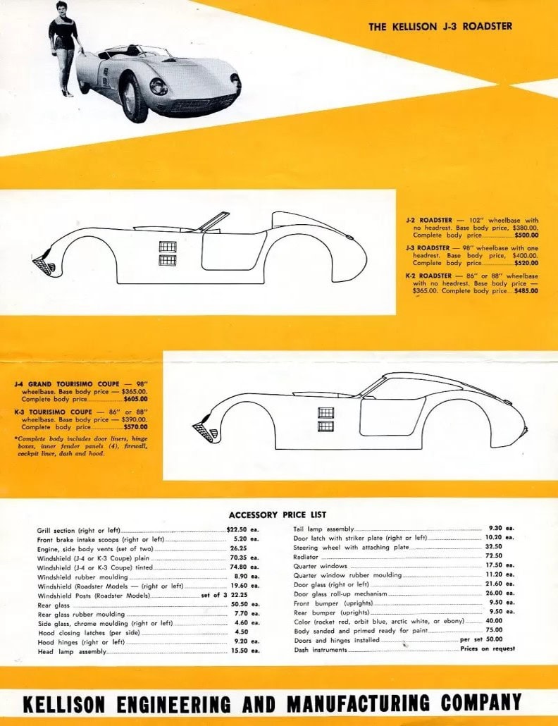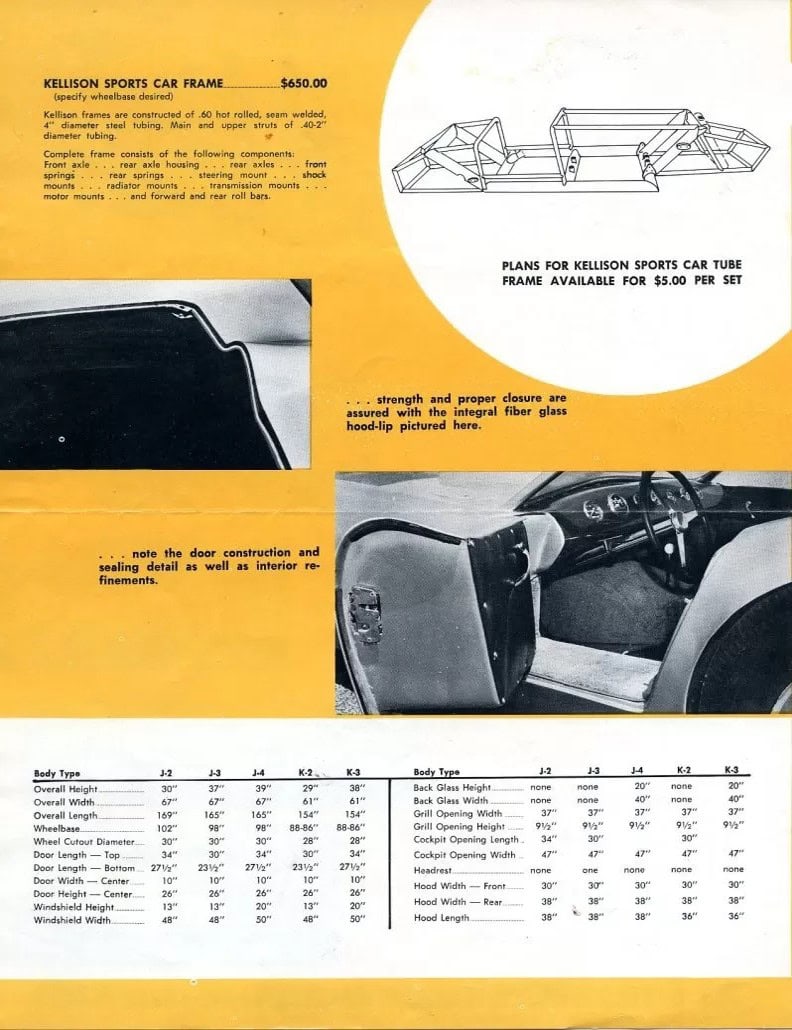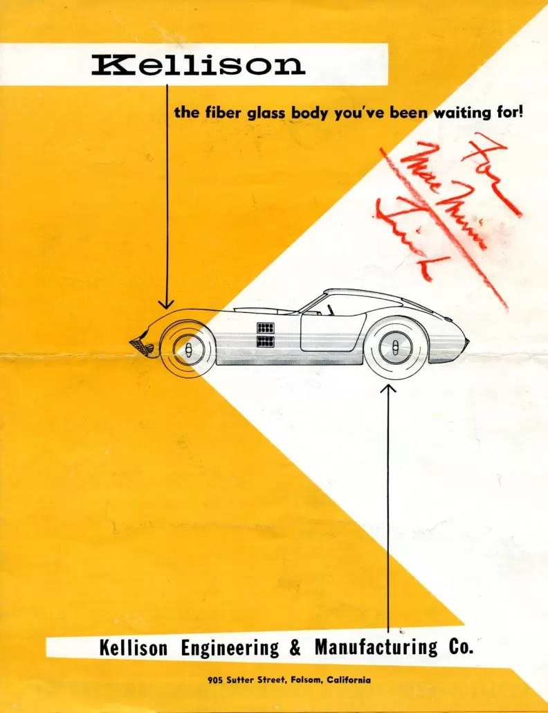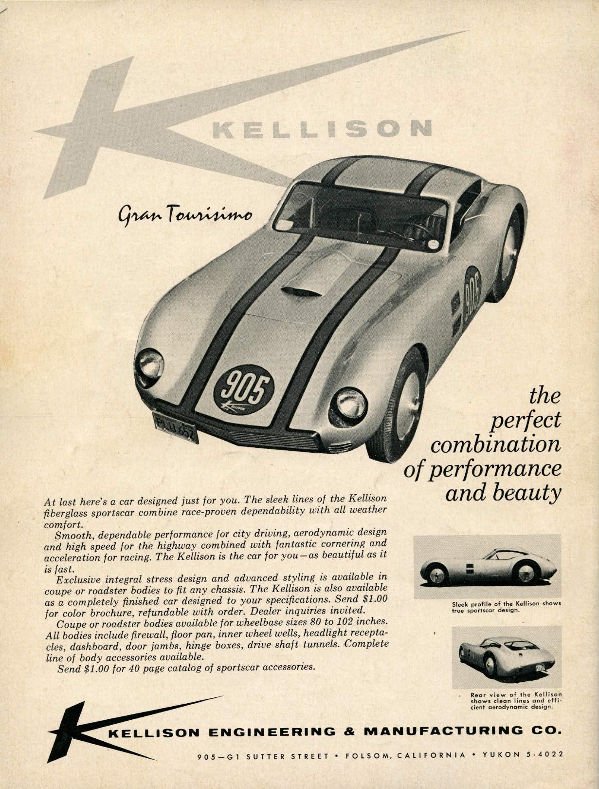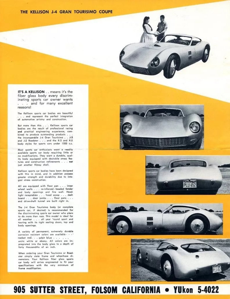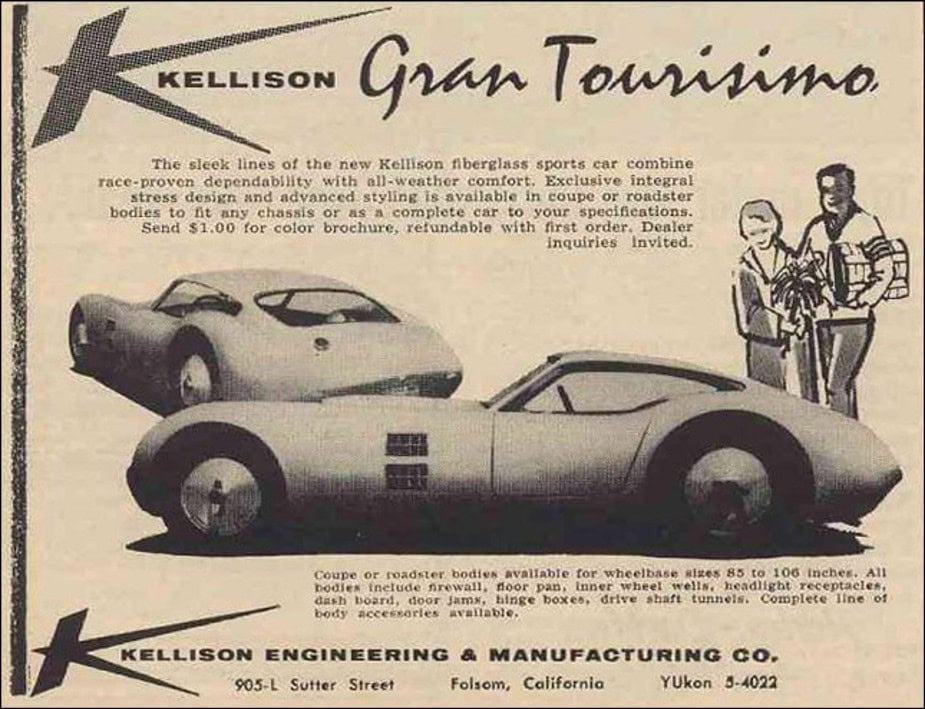 Vous vous en foutez royalement tout comme les Angliches rosbif se foutaient des Hindous et des macaques africains, tout comme les colons français en Afrique noire ?… Vous voulez quelque chose de si bas au sol pour paraitre un champion automobile que vous ne regarderez plus les gros nichons des serveuses de drive-in mais leurs moches rotules ?… Pas de Corvette de boulevard pour vous qui êtes à la recherche de l’avenir. La voiture que vous voulez est la Kellison… Eh bien, vous avez de la chance, car c’est la voiture que Jim Kellison a construite pour vous et beaucoup d’autres accros de la performance qui avaient soif de vitesse et d’audace. Faisant ses armes dans l’armée de l’air, Kellison a acquis une expertise avec la fibre de verre dès le début, devenant un pionnier du plastique offrant une large gamme de carrosseries de coupés et de roadsters ainsi que des conceptions de châssis tubulaires pour ses voitures.