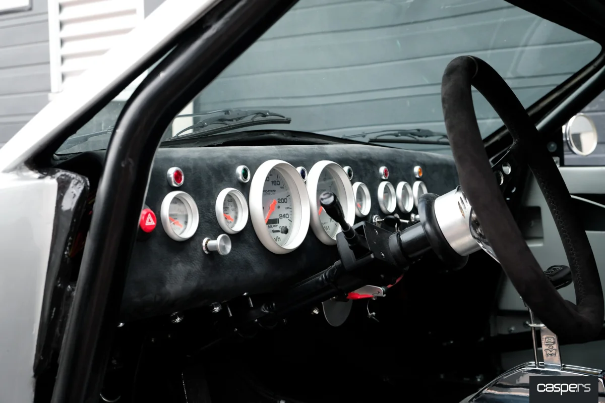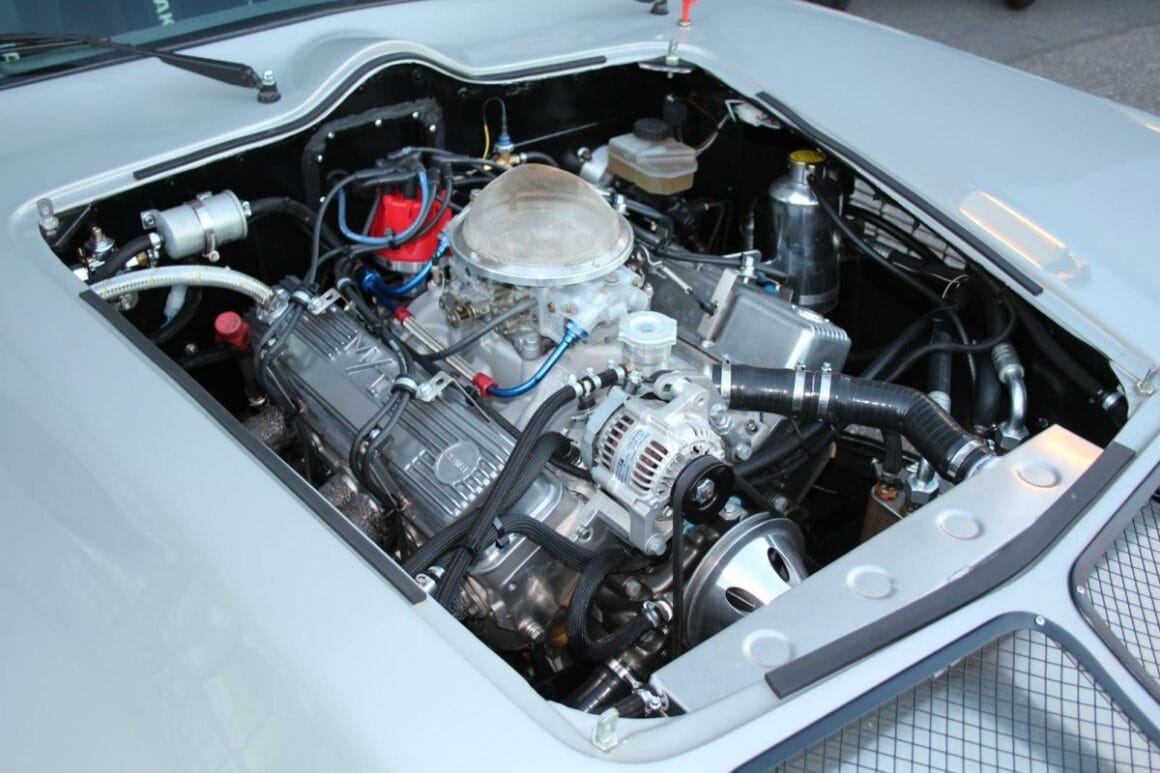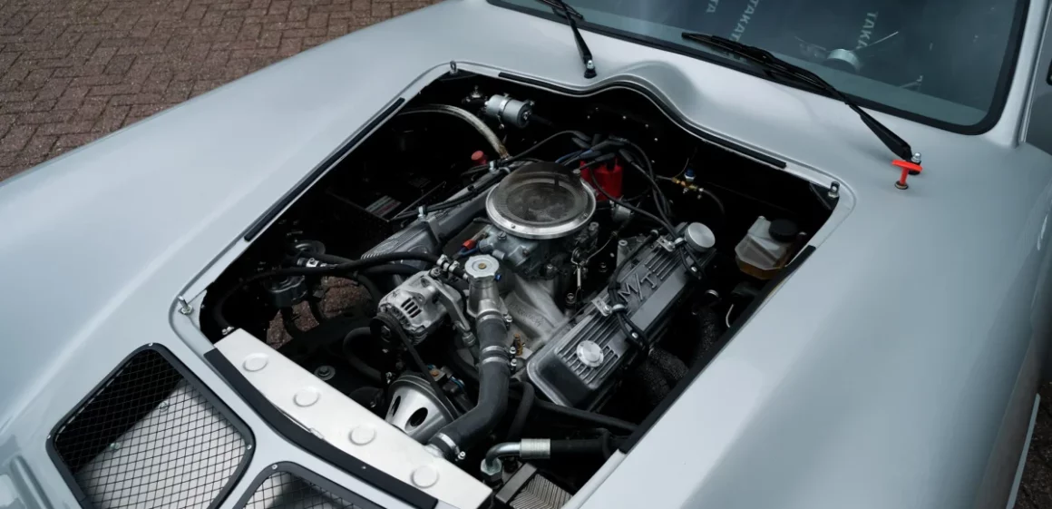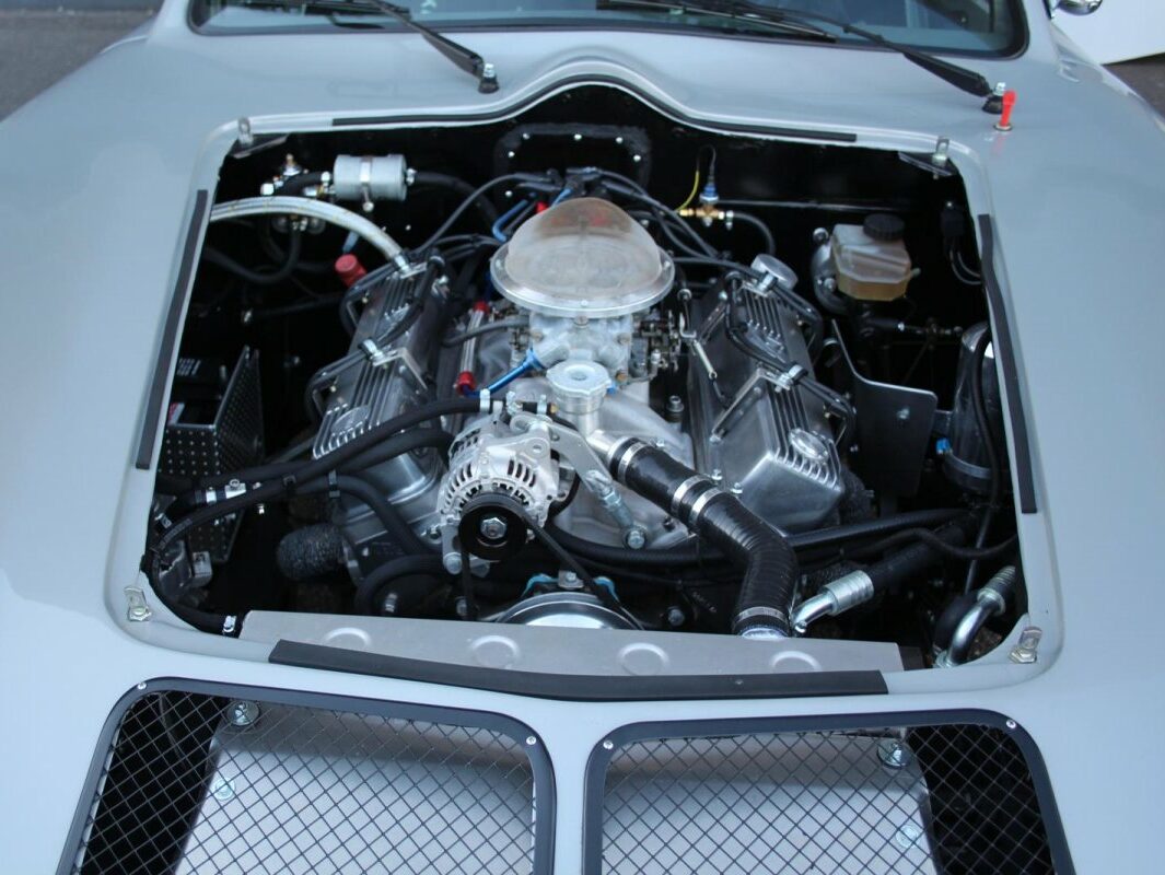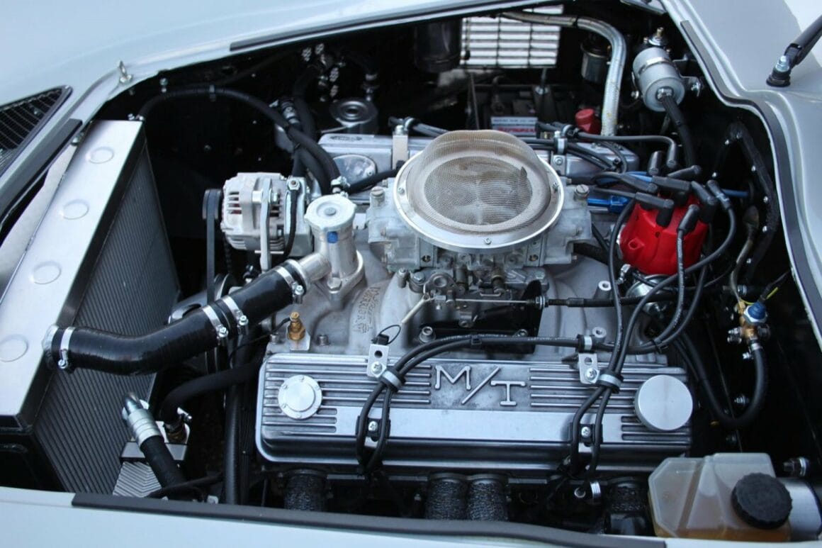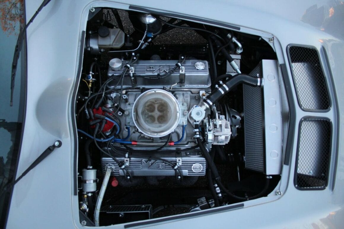 Le panneau du tableau de bord était en excellent état recouvert de fourrure Zeus, étrangement en harmonie avec l’ambiance intérieure. Les jauges principales et les petits instruments avaient une excellente couleur assortie et de belles lunettes chromées. Le compteur kilométrique indiquait un peu plus de 2 200 milles, qui avaient probablement tous été amassés avec Lamm au volant et dont 1000 avaient été acquis au milieu des bourrasques de pluie soudaines… Il a été souligné que la zone de rangement arrière offrait juste assez d’espace pour quelques sandwichs de charcuterie, tandis que le reste de l’espace intérieur était consommé… En fait il était bouffé (rempli) de manière appropriée par un arceau de sécurité et une protection contre les intrusions latérales. Sous le capot, le moteur V8 et le compartiment moteur avaient été joliment rénovés en fonction de la qualité restante de la voiture.